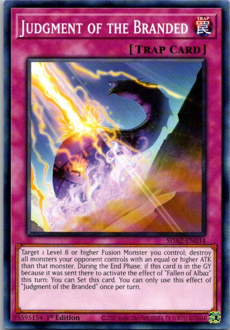 This is a nice example of a Structure Deck: Albaz Strike #SDAZ-EN034 Judgment of the Branded Other important information about this card: In 2022 Judgment of the Branded played for the . Please check out our other listings for more great cards.
