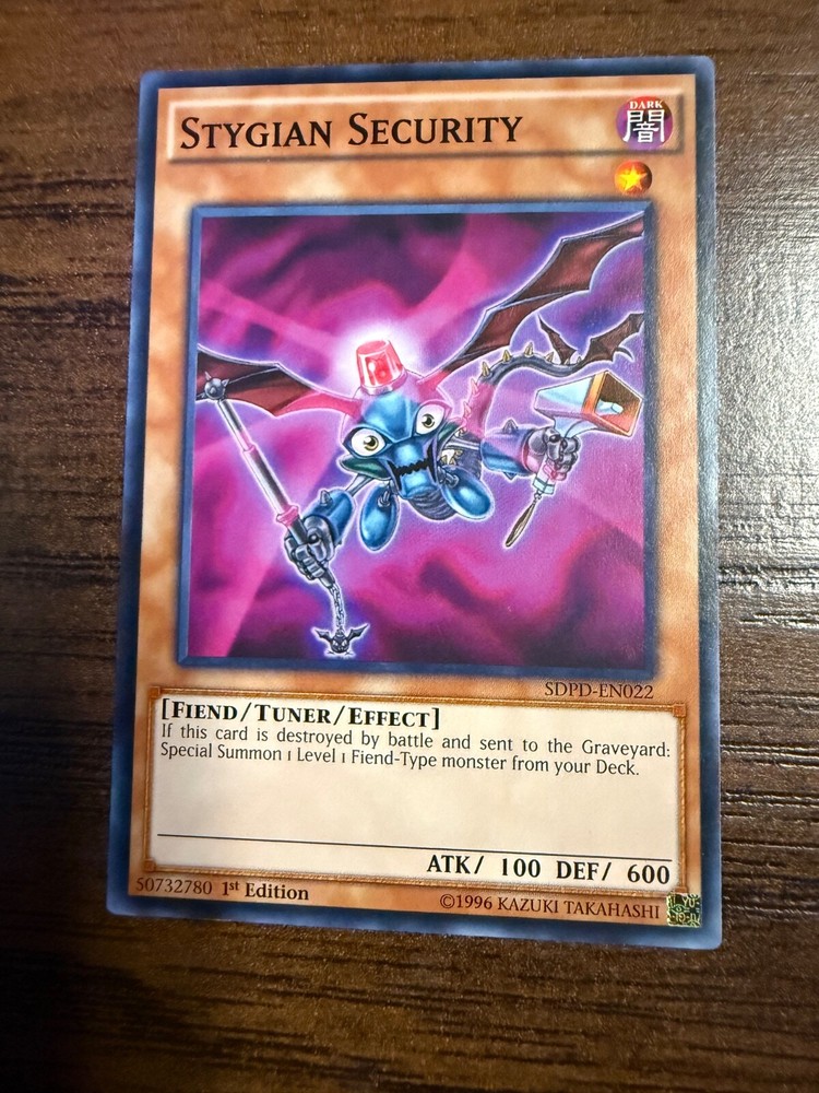 Delve into the dark side of your Yu-Gi-Oh! TCG collection with the Stygian Security card from the Structure Deck: Pendulum Domination set. As a common card with a short print run, it's a unique addition for players and collectors alike. Its fiend creature type brings a touch of sinister strategy to your deck, perfect for those looking to bolster their dark forces. With an attack power of 100 and a defense toughness of 600, this tuner card, numbered SDPD-EN022, is a solid choice for engaging in battle. The English language card, produced by Konami, features the coveted 1st Edition stamp, marking it as a special release from the well-known Structure Deck series.