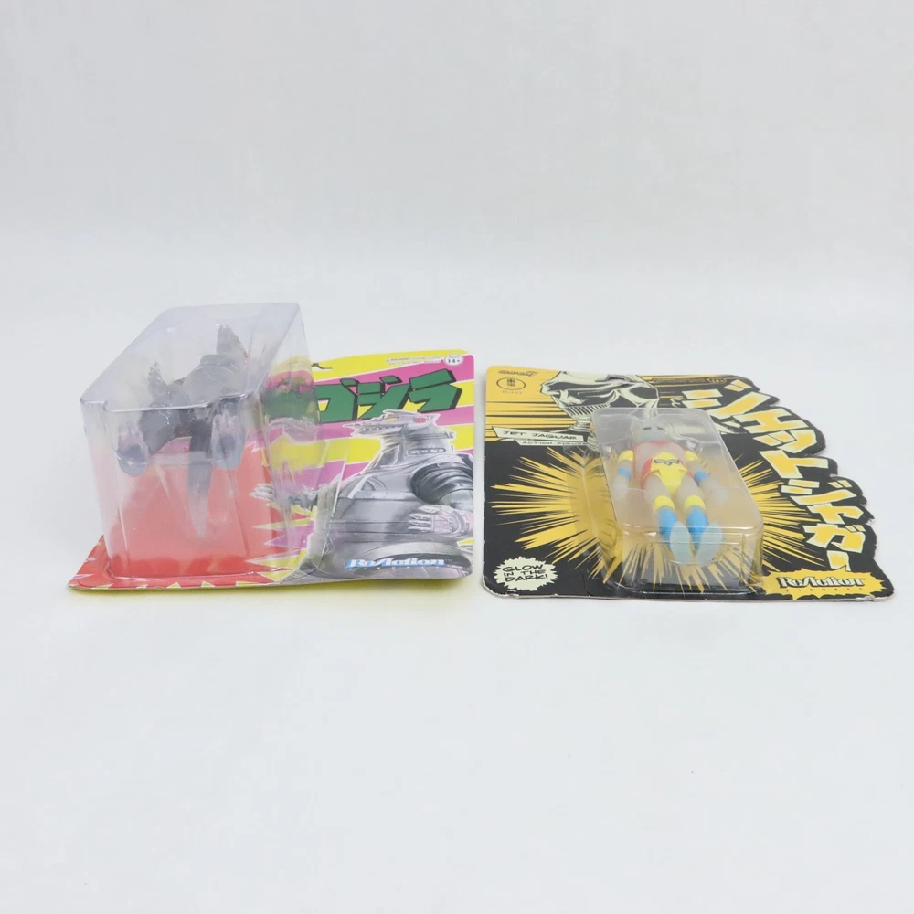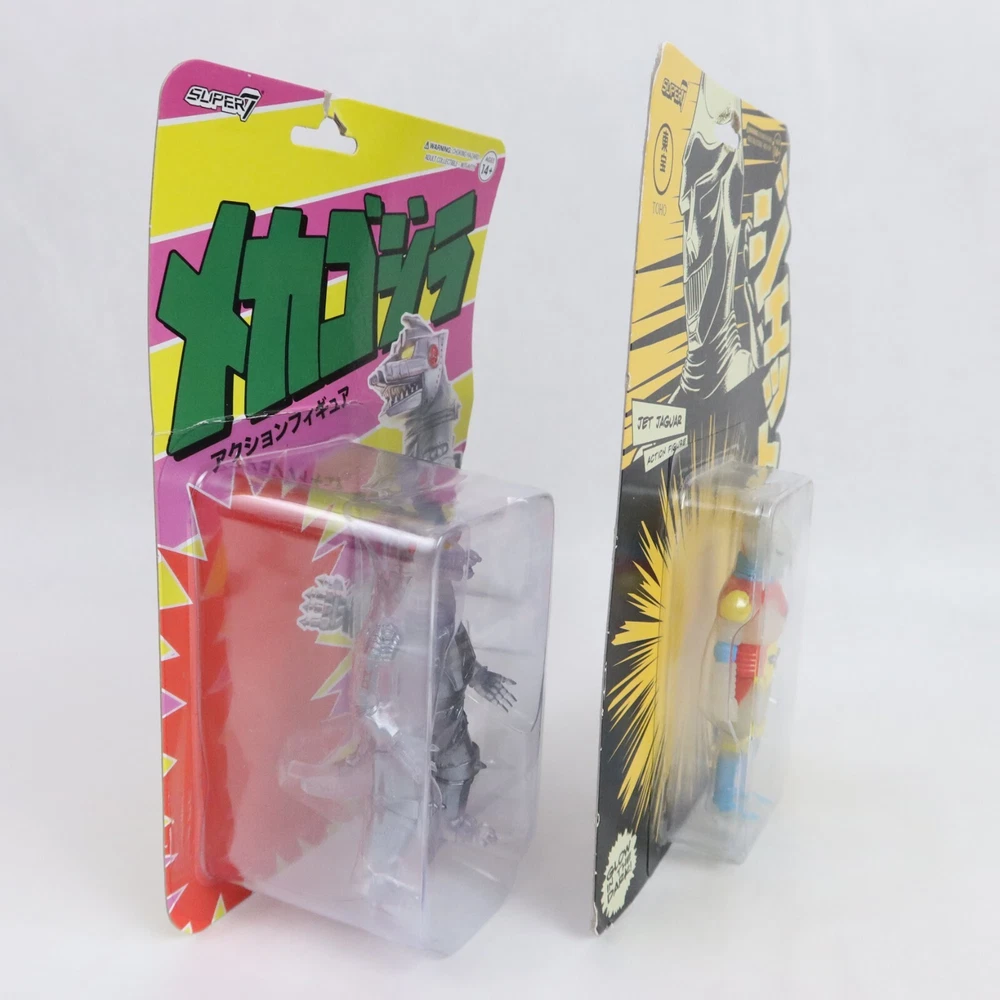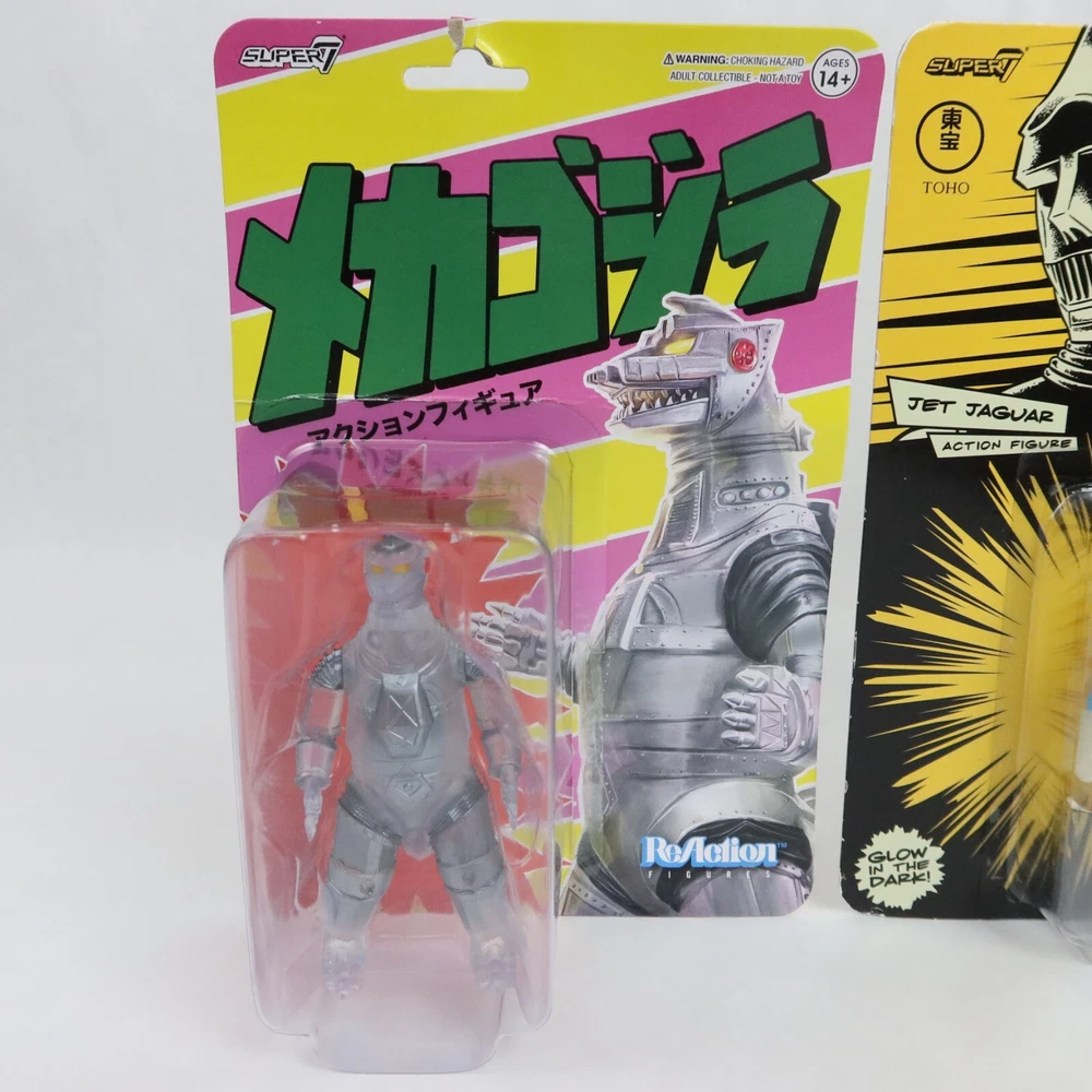 Super 7 ReAction Godzilla Mechagodzilla 50th & Jet Jaguar GLOW SDCC Toho Kaiju PLEASE SEE PHOTOS: Some damagae to card/packaging. Mechagodzilla has delamination. Godzilla Mechagodzilla Translucent Figure Add some kaiju style to your shelf with this Godzilla figure! Featuring Mechagodzilla in a translucent color way, this figure is perfect for fans of the monster. A BoxLunch Exclusive! Plastic 4 inches tall Godzilla Jet Jaguar SDSS Glow-in-the-Dark Figure Punch punch punch? More like glow glow glow! Packaged on a special die-cut cardback, youll love adding this glow-in-the-dark 3.75 Jet Jaguar ReAction Figure to your Toho collection- we'll shake on it! Plastic SDCC Exclusive Glow in the Dark