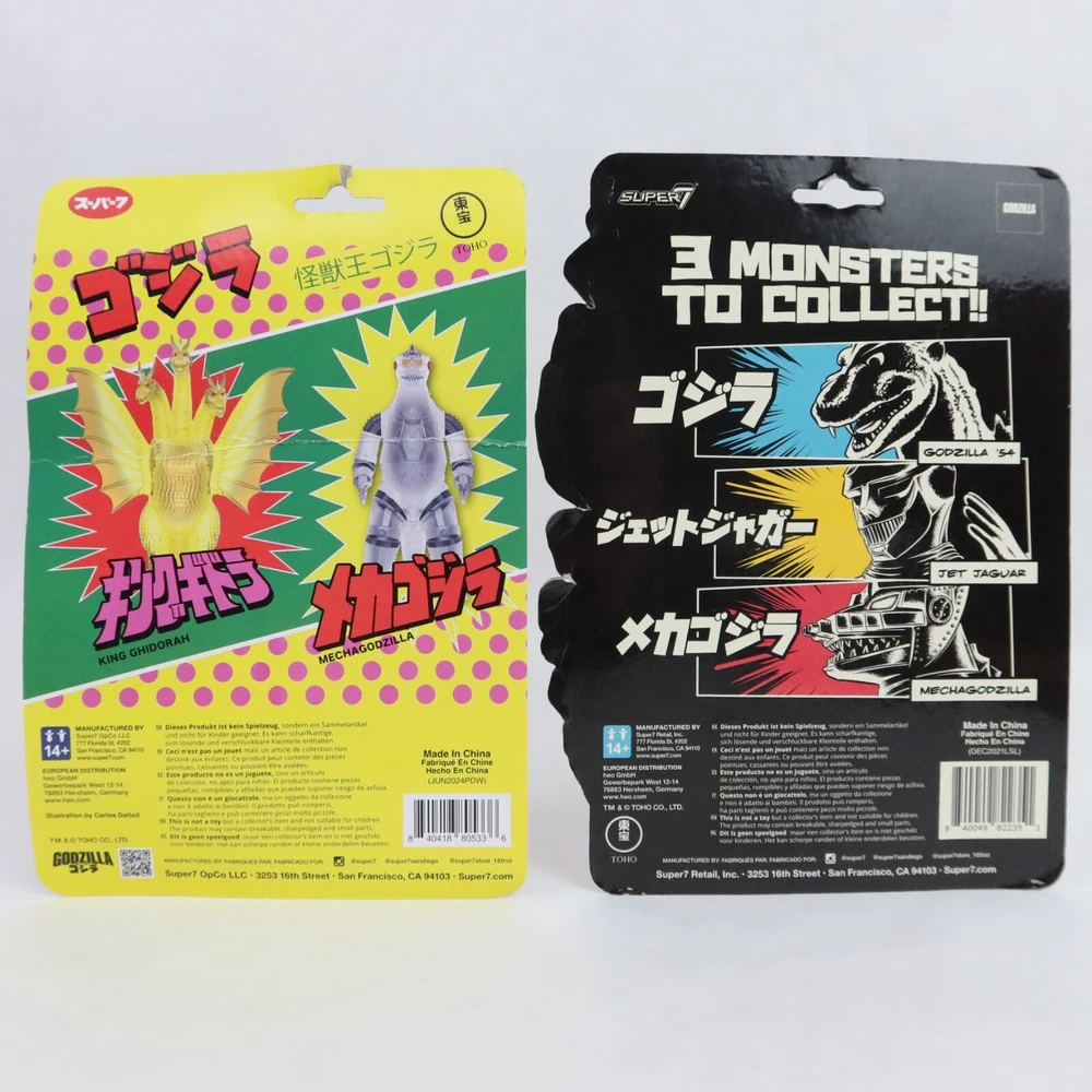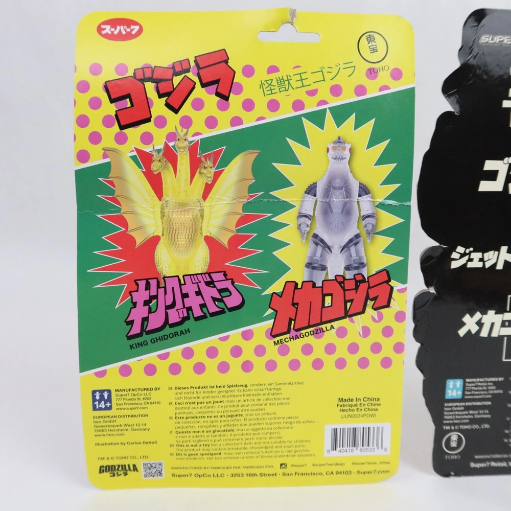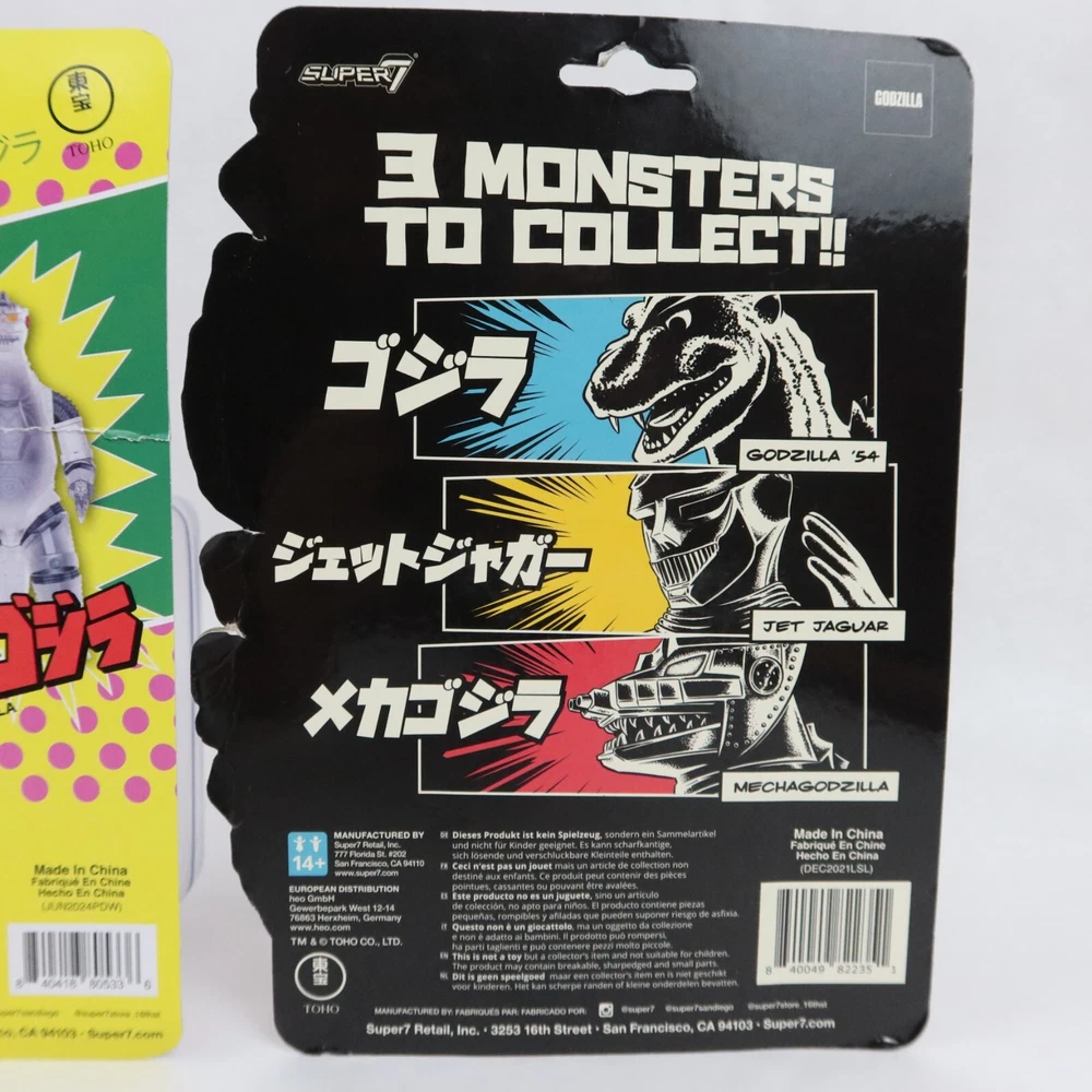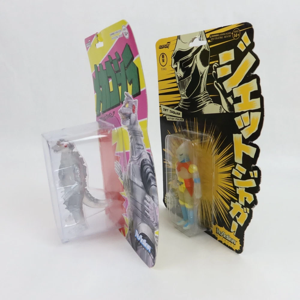 Super 7 ReAction Godzilla Mechagodzilla 50th & Jet Jaguar GLOW SDCC Toho Kaiju PLEASE SEE PHOTOS: Some damagae to card/packaging. Mechagodzilla has delamination. Godzilla Mechagodzilla Translucent Figure Add some kaiju style to your shelf with this Godzilla figure! Featuring Mechagodzilla in a translucent color way, this figure is perfect for fans of the monster. A BoxLunch Exclusive! Plastic 4 inches tall Godzilla Jet Jaguar SDSS Glow-in-the-Dark Figure Punch punch punch? More like glow glow glow! Packaged on a special die-cut cardback, youll love adding this glow-in-the-dark 3.75 Jet Jaguar ReAction Figure to your Toho collection- we'll shake on it! Plastic SDCC Exclusive Glow in the Dark