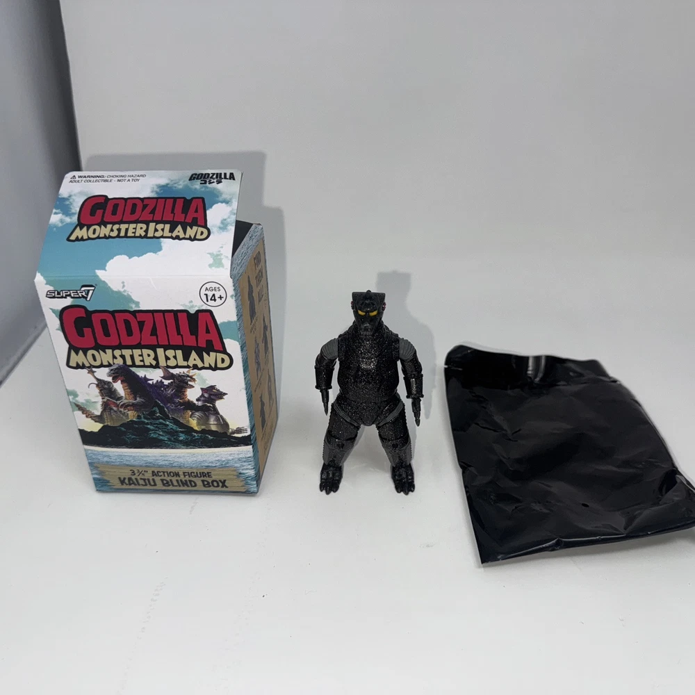 This Super7 Godzilla figure is from the Monster Island Mystery series, featuring Mechagodzilla with a glitter chase variant. The figure is part of the ReAction line for the Godzilla theme, made in Chi...