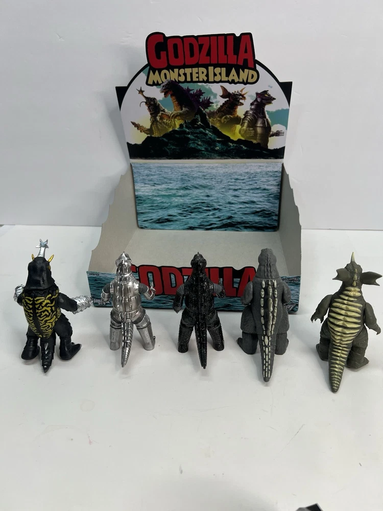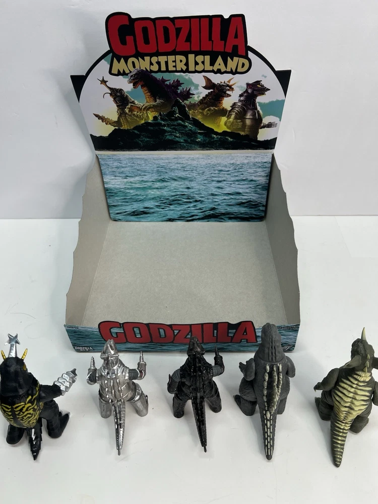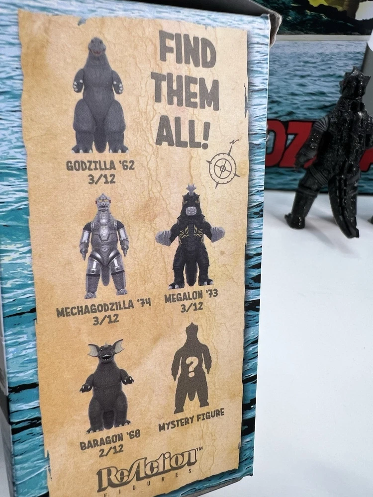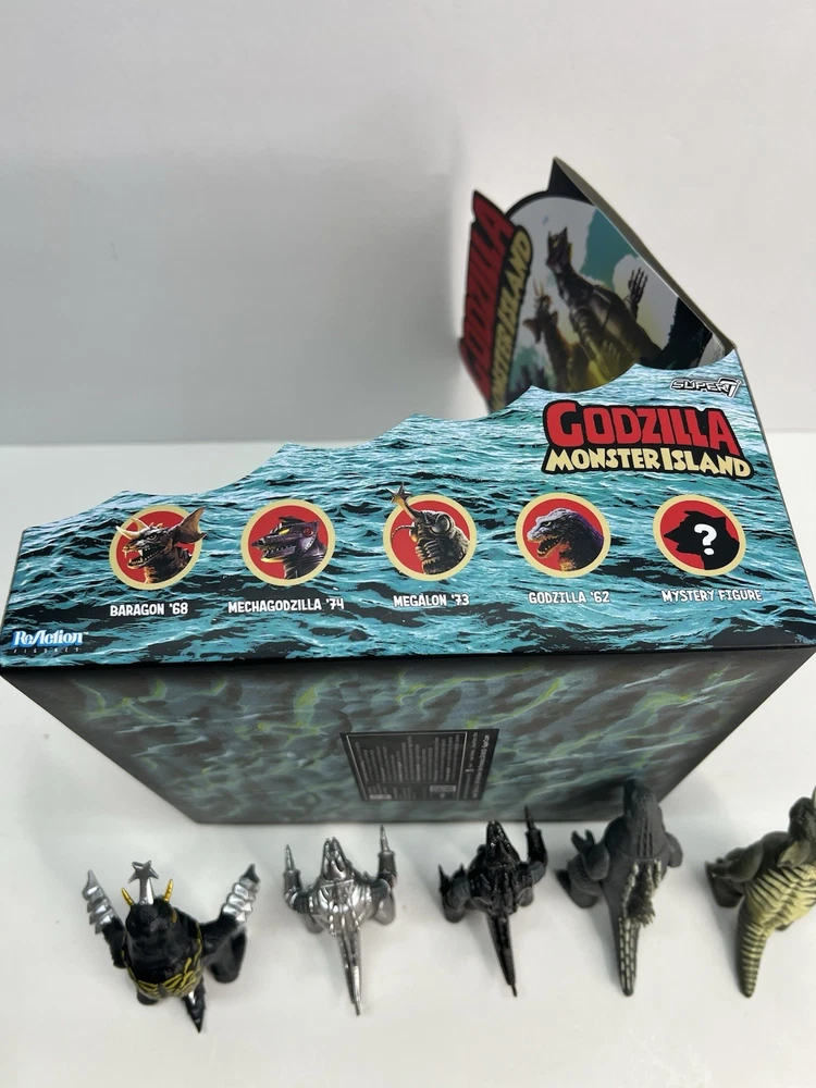 Complete set of 5 figures including the rare Chase Comes with display case box and individual blind boxes that are NOT sealed and have been opened to confirm figures. Figures are all brand new and never displayed, only removed for pictures. all-new 3.75” scale Toho Godzilla Monster Island Blind Box ReAction Figures! Inspired by the remote island sanctuary from the Godzilla film series, this Blind Box release features five unique kaiju designs—Megalon, Godzilla ’62, Baragon, Mechagodzilla ’74 (standard), and a mystery colorway of Mechagodzilla Godzilla Monster Island Blind Box ReAction Figures!