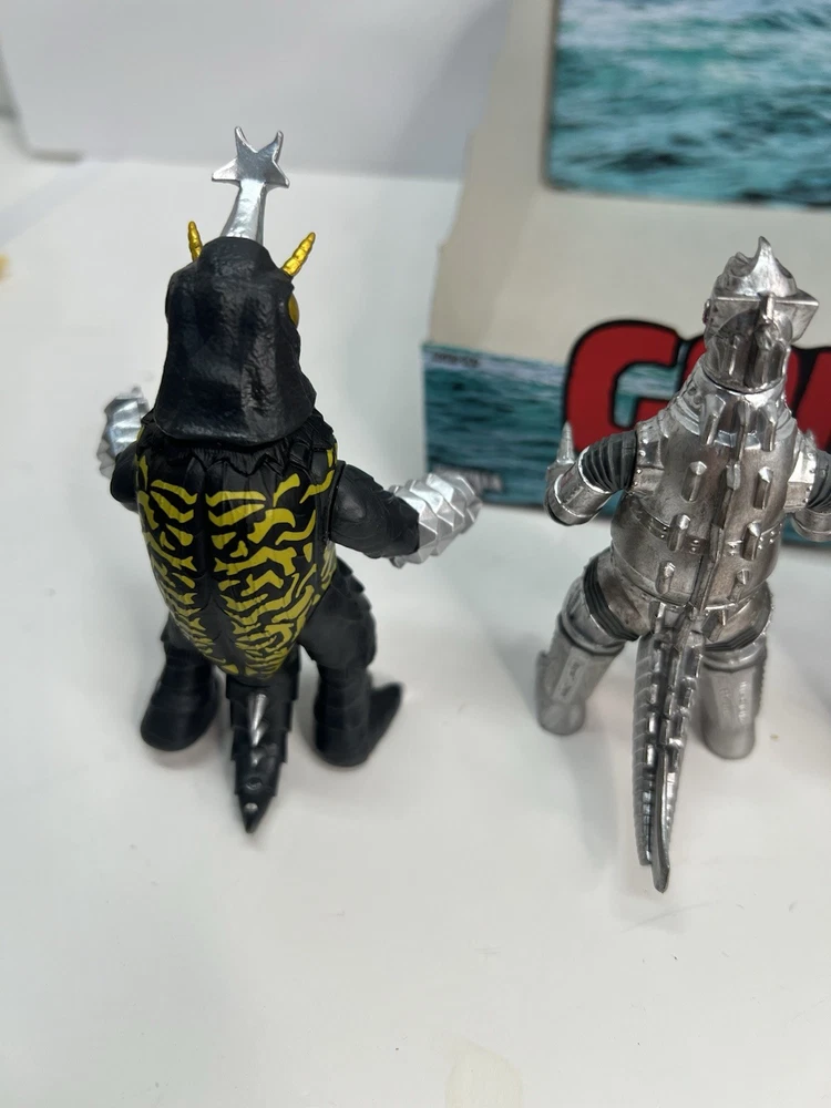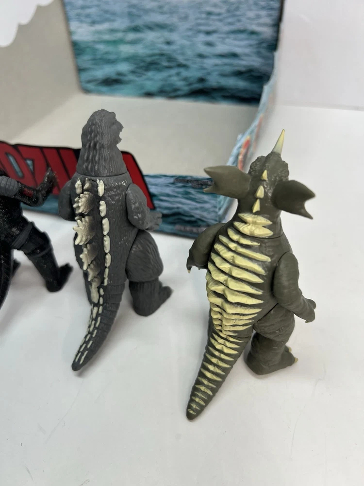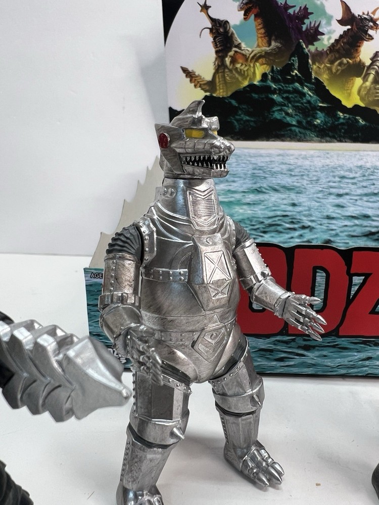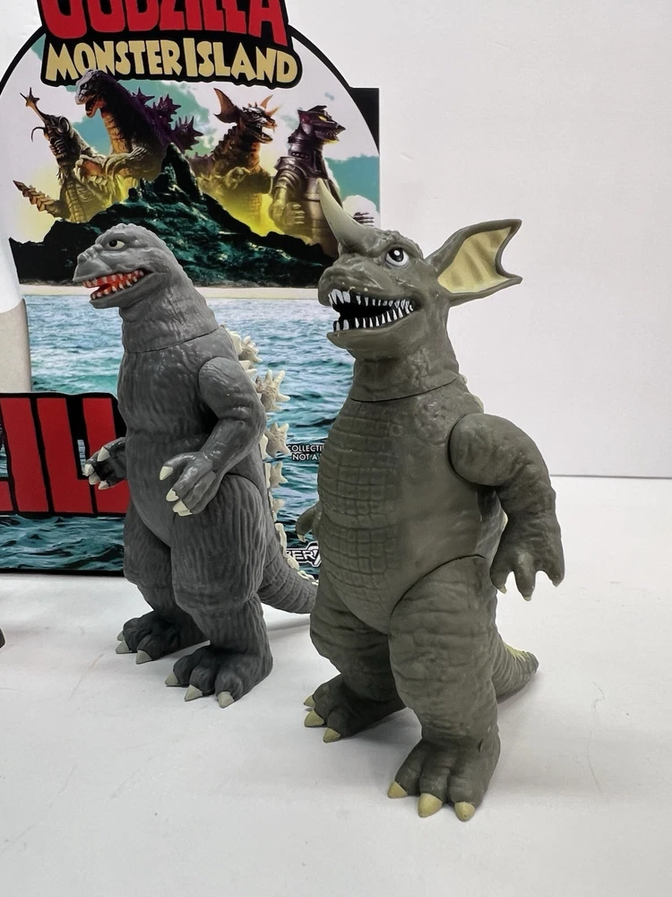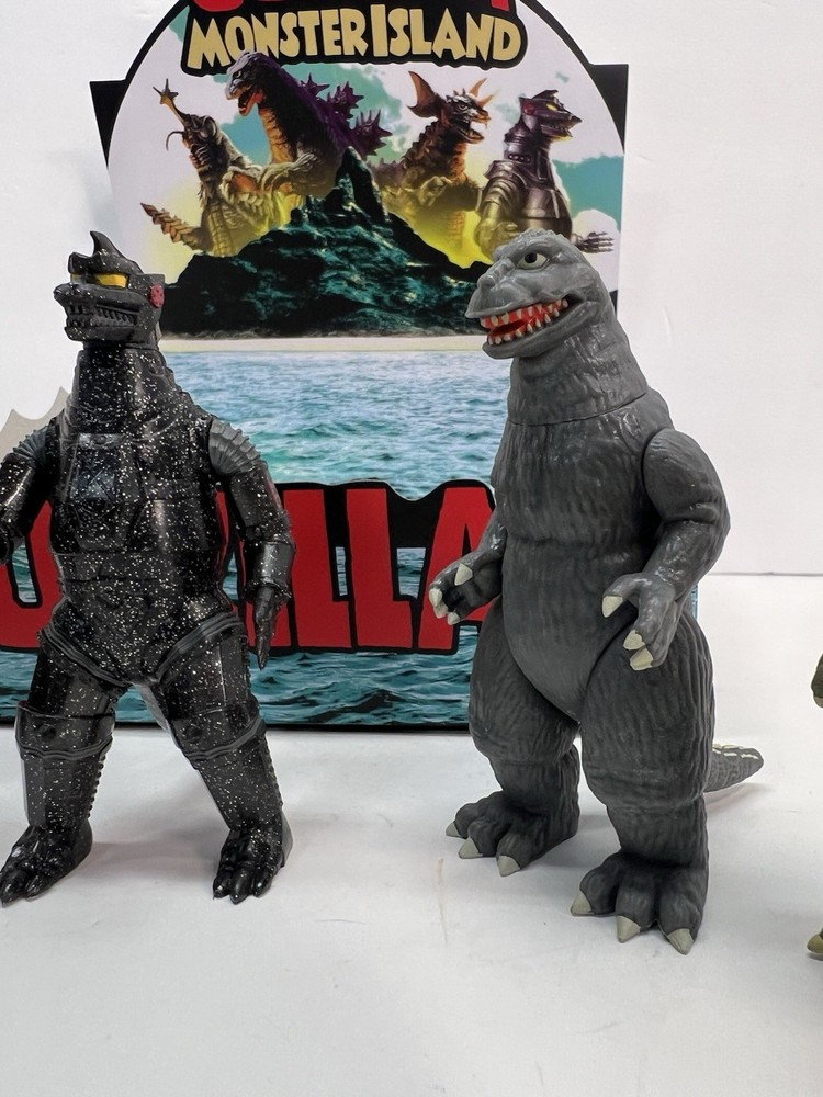 Complete set of 5 figures including the rare Chase Comes with display case box and individual blind boxes that are NOT sealed and have been opened to confirm figures. Figures are all brand new and never displayed, only removed for pictures. all-new 3.75” scale Toho Godzilla Monster Island Blind Box ReAction Figures! Inspired by the remote island sanctuary from the Godzilla film series, this Blind Box release features five unique kaiju designs—Megalon, Godzilla ’62, Baragon, Mechagodzilla ’74 (standard), and a mystery colorway of Mechagodzilla Godzilla Monster Island Blind Box ReAction Figures!