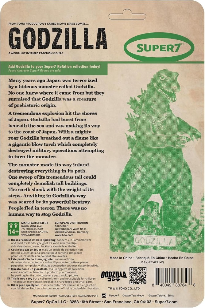 Super7 Toho Reaction Figures - Godzilla (Model Kit on Card) Action Figure Product Details Product Dimensions: 1.75 x 1 x 3.75 inches Item Weight: 12.5 ounces Country of Origin: China Item model number: RE-TOHO-08784 Manufacturer recommended age: 14 years and up Release date: October 8, 2024 Manufacturer: Super7 GODZILLA SUPER7 ACTION FIGURE: Godzilla, inspired by the vintage model kits from the 1960s, joins the Super7 action toy figures lineup ADVENTURE-READY DETAILS: This action figure includes a removable, soon-to-be-destroyed cityscape, allowing you to recall the original 1960s monster model kit 3.75-INCH ACTION FIGURE: Model Godzilla figure is 3.75" tall with the rest of the Godzilla ReAction figures lineup PREMIUM ACTION FIGURES: Relive the good times all over again with our ReAction figures, classic 3.75" scale action figure toys that fit in the palm of your hand; Featuring Mighty Morphin Power Rangers, G.I. Joe, Toho, Who Framed Roger Rabbit, and more COLLECTIBLE TOYS & FIGURES: From TMNT action figures and G.I. Joe skateboard decks to Power Rangers t-shirts and SpongeBob toys, Super7 makes the perfect retro collectibles, vintage toys, and nostalgia gifts for pop culture fanatics and collectors Rest easy, Godzilla fans- the new Model Kit Godzilla comes fully assembled and ready to display in your collection! The new 3.75” scale articulated Toho ReAction figure of Model Kit Godzilla is inspired by the Canadian variant of the original model kit developed under the Toho license in the 1960s and features the mighty prehistoric monster posed among a removable, soon-to-be-destroyed cityscape. The only assembling you'll have to do is adding one of these Model Kit Godzilla ReAction figures to your collection of Kaiju creations! Super7 makes retro collectibles, vintage toys, and nostalgia gifts for pop culture fanatics and collectors. We grew up with giant monsters, comic books, punk, science fiction, skateboarding, robots, and rebellion. No one made what we wanted. So, we made it ourselves.