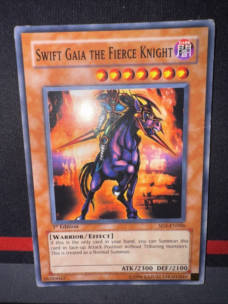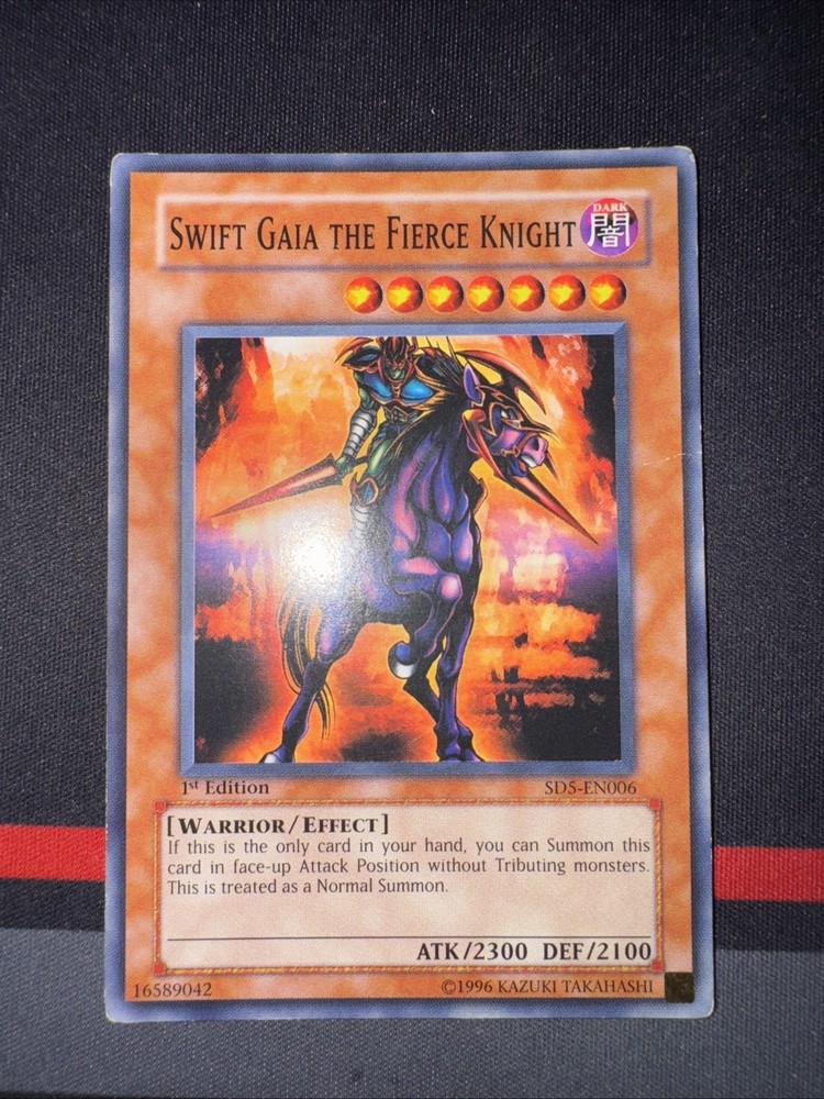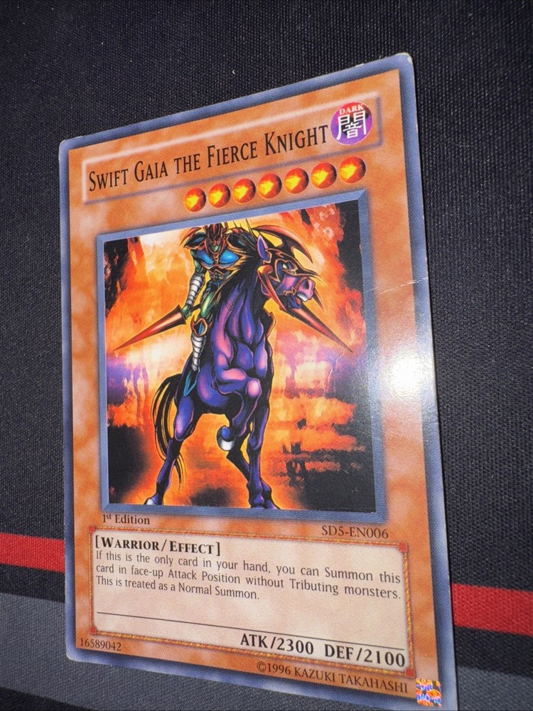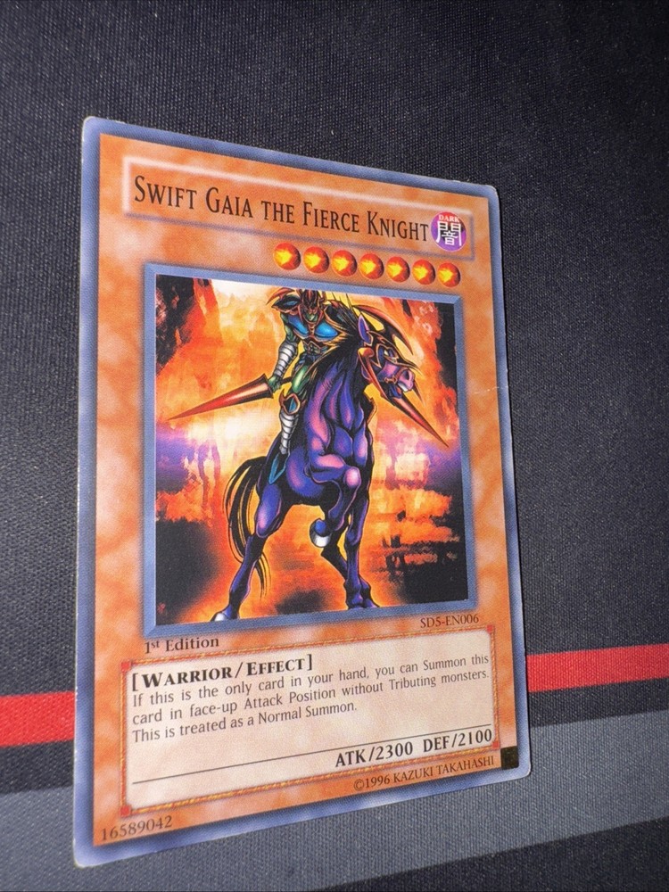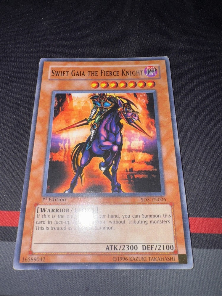 Up for sale is a rare and powerful Yu-Gi-Oh! TCG card called Swift Gaia the Fierce Knight. This card is from the Structure Deck: Warrior's Triumph set and is a 1st Edition Common / Short Print card. It features an attack/power of 2300 and a defense/toughness of 2100, making it a great addition to any warrior-type monster collection. The card is in English and has the card number SD5-EN006. Manufactured by Konami, this Effect-type card is a must-have for any serious Yu-Gi-Oh! TCG collector.