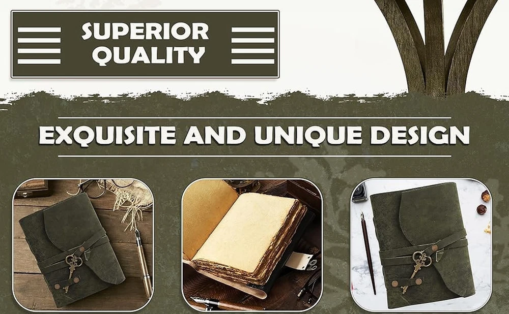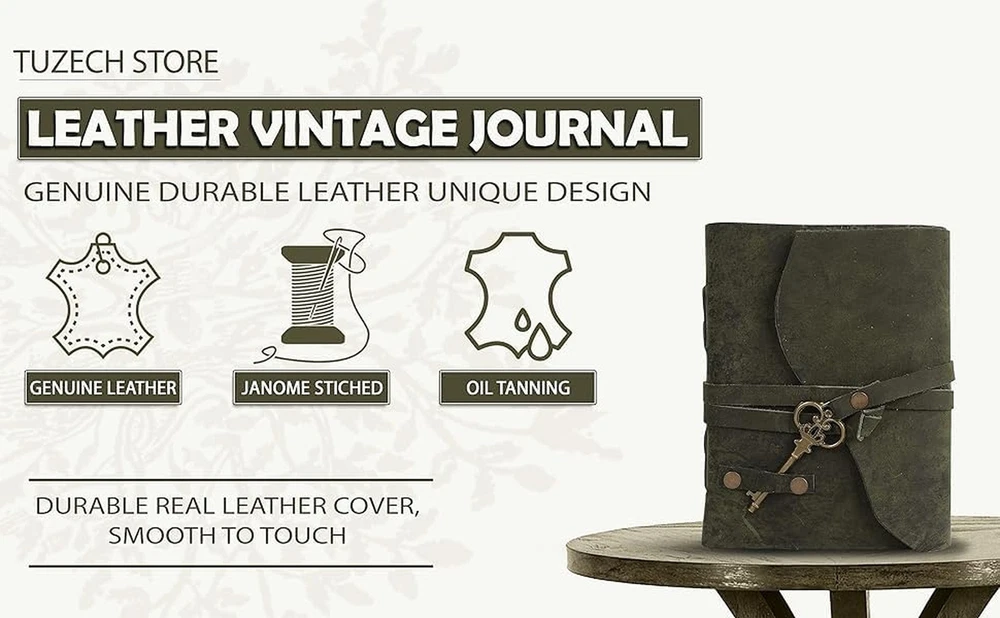 TUZECH Leather Bound Vintage Journal Retro Travel Diary An Exclusive Handmade Paper Notebook With Key for Men & Women (7 x 5 Unlined, Green) Description Features: FULL GRAIN LEATHER Our handmade leather journal is made from full grain leather, top quality leather. Naturally oiled and tanned to hydrate the leather notebook cover and preserve its unique individuality. The old-timey appeal adds character to the material, perfect vintage journal for women and journal for men. The smooth-finish surface highlights its beauty and quality. DECKLED EDGE PAPER Our antique brown mens journal for writing has 200 deckle edge paper. The herbal-colored calligraphy paper creates a timeless color and a rustic touch to the small journal. The thick aged paper will not bleed through with any type of pen or painting medium. Made with hand-pressed cotton paper to create a subtle texture, ideal journals for writing, journaling, painting, sketching, etc. DURABLE LEATHER STRAP - The daily notebook journal is handcrafted by artisan. Its sturdy leather string keeps the pocket journal cover and pages in place, it complements the superior craftsmanship that goes into this old-looking leather notebook to write in. Great journals for women who are on-the-go, a classic pocket notebook or travel journal for men who love to go on adventures. SIZED FOR MULTI-USE These easy to carry vintage journals for writing are ideal for leather diary, junk journal, bible journal, daily journal, spell book, book of shadows, adventure journal, etc. Refer to images for product dimensions. A great gift for writers, budding poets or artists, your loved ones and yourself! Handy leather sketchbook that you can bring along, fits perfectly in your tote, backpack, handbag or purse. YOUR HAPPINESS MATTERS We strongly believe in our products and we take pride in the craftsmanship of each soft leather bound journal. We ensure that the materials are of top quality and that each product has been handled with finesse. Your satisfaction is our highest priority, and we commit to provide quality customer experience. In case you are unsatisfied with our product, you can have full confidence in how quickly we will refund your money or offer a replacement. Product Details: Brand: TUZECH Color: Green Theme: Book Sheet Size: 7 x 5 inches Pages: 200 Pages Cover Material: Leather Style: Vintage Ruling Type: Plain Special Feature: Lock Product Dimensions: 7"L x 5"W x 1"Th Manufacturer: The immart global Brand: TUZECH Item Weight: 11.3 ounces Product Dimensions: 7 x 5 x 1 inches Color: Green Cover Material: Leather Number of Items: 1 Size: 7 x 5 Unlined Ruling: Plain Sheet Size: 7 x 5 inches Manufacturer Part Number: 98456 Date First Available: September 13, 2021 Shipping Free fast shipping Return Policy All items qualify for returns within 30 days of receipt.