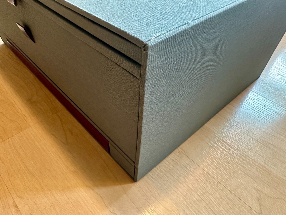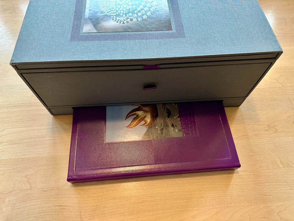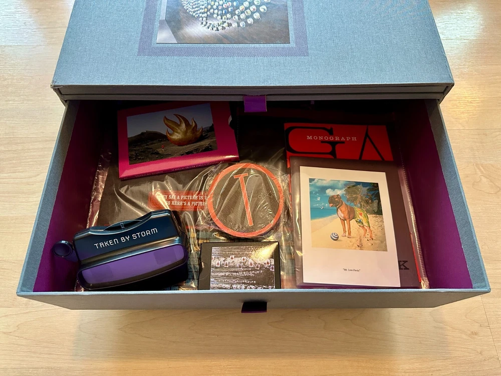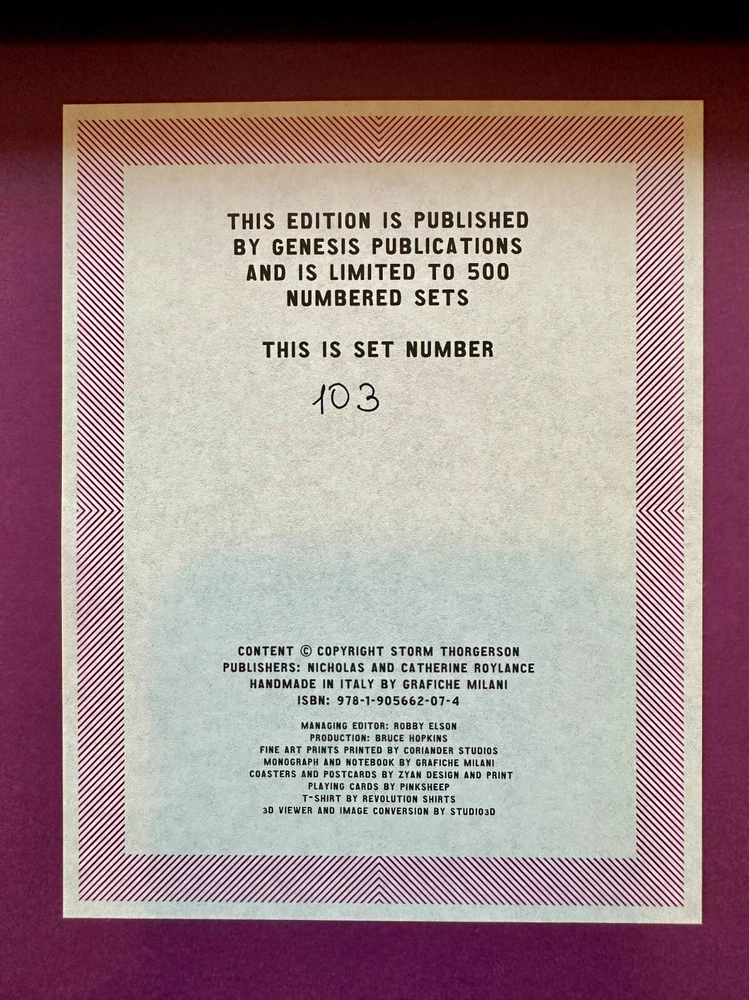 Taken By Storm - The Album Art of Storm Thorgerson Storm Thorgerson Signed by Storm Thorgerson Numbered 103/500 Taken By Storm is the ultimate retrospective; a uniquely designed 'set of drawers' packed full of rare and beautiful objects created by Storm Thorgerson for his limited edition. Designed to celebrate 40 years spent making the greatest album covers of all time including Pink Floyd's Dark Side of The Moon and Led Zeppelin's Houses of The Holy, each set is unique, featuring original Storm artwork specially commissioned and inset onto the top of each set of drawers and the rear of each book. FourJolleypulled silkscreen prints, signed and numbered by the artist and suitable for framing, are also included. 'It is a thing of beauty. A highlight for me are the prints. They look, and smell, so good! Many, many thanks.' M. Jolley, Subscriber, England THE MANUSCRIPT The author signed book contains thoughtful insight and commentary from Storm on the development of now iconic album covers such as Pink Floyd's Dark Side of the Moon and Led Zeppelin's Presence. Gasoline 'Memory is a devilish thing, a slippery thing, you think you got it down and then it eludes you, like trying to catch a fish with bare hands. This image of eyes on trees is an exterior installation - hundreds of photos of eyes attached temporarily to silver birch trees, but its derivation I am not too sure about. Being an image of romance (romantic obsession) and paranoia. Alternatively I dimly recall a lateral association with the phrase 'the walls have ears' (more paranoia) so the trees have eyes but why trees? I don't know, I remember that they had to be silver birches, not some other tree, which may have have been a simple visual preference. Either way Rupert and Sam made a sterling effort to adorn every tree in sight making, I think, an effective and eye catching (oh my) image.' Storm Thorgerson The Dark Side of the Moon 30th 'The stained glass window was made in the same proportions as the original design but substituting a deep purple hue for the black background since black glass does not admit any light and might defeat the whole purpose. The stained glass window was photographed outside against a winter sun (actually in the back garden of a house belonging to one of Pink Floyd) highlighting the texture and imperfections of the glass itself. All very radiant we thought, especially in the flesh.' Storm Thorgerson Presence 'I was greatly impressed that Led Zeppelin, the mighty Led Zeppelin, could take this low key, off the wall, domestic semi-kitsch, partially retro design... so obscure really. Impressed and delighted because I always felt that the understatement adds to the power of the image. A standard, bourgeois family - mum, dad and two kids - sit around a table in some strange marina (actually an indoor boat show) not to eat or commune but to examine an oddly shaped black object that seems to enthral them. Seems they don't need much else - the table is bare. Does the black object represent Led Zeppelin? All the family needs is to bask in their musical emanations.' Storm Thorgerson Wish You Were Here 'It was very difficult to design this cover following the phenomenal success of The Dark Side Of The Moon. After prolonged conversations with all of the band, especially with Roger, it seemed that 'absence' was a recurring theme, especially absence of commitment - either to relationships or to work. There in the flesh but not in the spirit. At this moment in time, the band was beginning to drift apart and Roger was getting divorced. I racked my brains for good ideas as to how to represent 'absence' whilst being present. I went through the motions, until perchance we stumbled upon the notion of traces ie: shadows, footsteps, things that indicate presence but are in themselves insubstantial or not very present. These ideas became intermingled with empty gestures, maybe a handshake where people grip your hand warmly but don't mean too much. From there to absent emotions and thence to people who were absent for fear of being hurt, or burnt, and from that to a person on fire.' Storm Thorgerson THE AUTHOR Storm Thorgerson 1944-2013 Born in Potters Bar in 1944, Storm attended the Cambridge High School for Boys along with Pink Floyd members Roger Waters and Syd Barrett. He started the Hipgnosis design studio in 1968 with Aubrey 'Po' Powell where he produced numerous album covers for rock 'n' roll bands. He is known for creating surrealist live 'events' painstakingly recorded on camera, with little to no digital manipulation or retouching. THE LIMITED EDITION The ultimate retrospective: a uniquely designed 'set of drawers' packed full of rare and exclusive objects, all created by Storm Thorgerson for his limited edition. The Limited Edition Book First out of your bespoke boxed set is an author-signed, leather-bound book of Storm's career. No two books are the same: Storm created an original artwork for the limited edition, with a personalised teacup for each of the 500 books. The first edition book has been completely rebound in luxuriant leather and features unique, new, endpapers. 4 Limited Edition fine art prints individually signed by Storm Thorgerson With Taken By Storm you will own an original piece of Storm artwork, specially commissioned and inset onto the top of each set of drawers. Silkscreened in over 20 inks to allow for stunning detail and colour reproduction, these complex, hand-crafted prints are original works of art in their own right. Division Bell, The . An alternate version - and originally the first choice - of the classic Pink Floyd album cover. Peter Gabriel 1 . The classic low-key and hand-coloured portrait from the cover of Peter Gabriel's 1977 album. Graphica Obscura . Poster design for a 2002 exhibition of Storm's own work. Pulse . The cover art of Pink Floyd's 2006 DVD release. Storm ViewMaster with seven original pieces of artwork rendered in 3D for the first time Storm's art is inherently three dim
