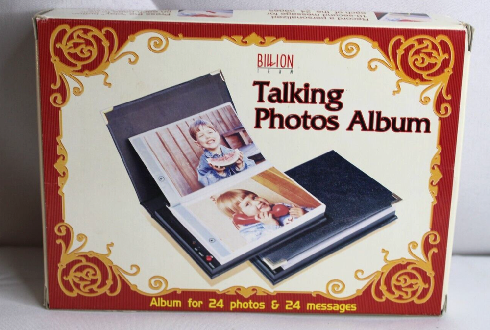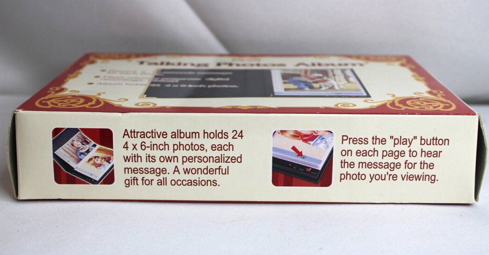 Attractive album holds 24 4x6 inch photos, each with its own personalized message. Press the play button on each page to hear the message for the photo you're viewing....