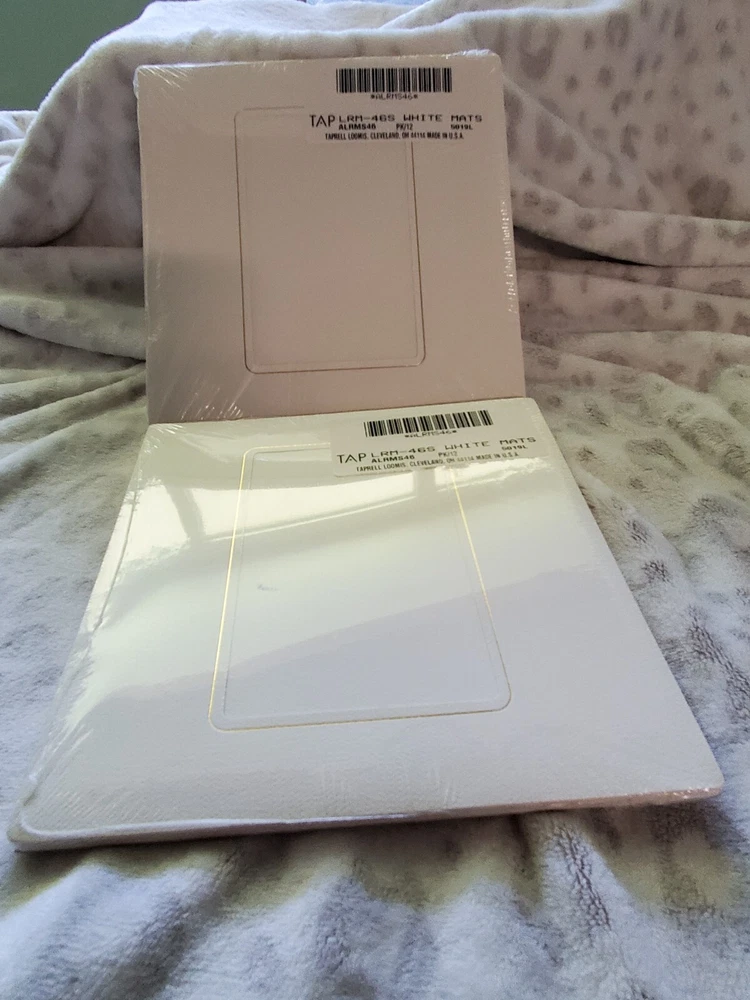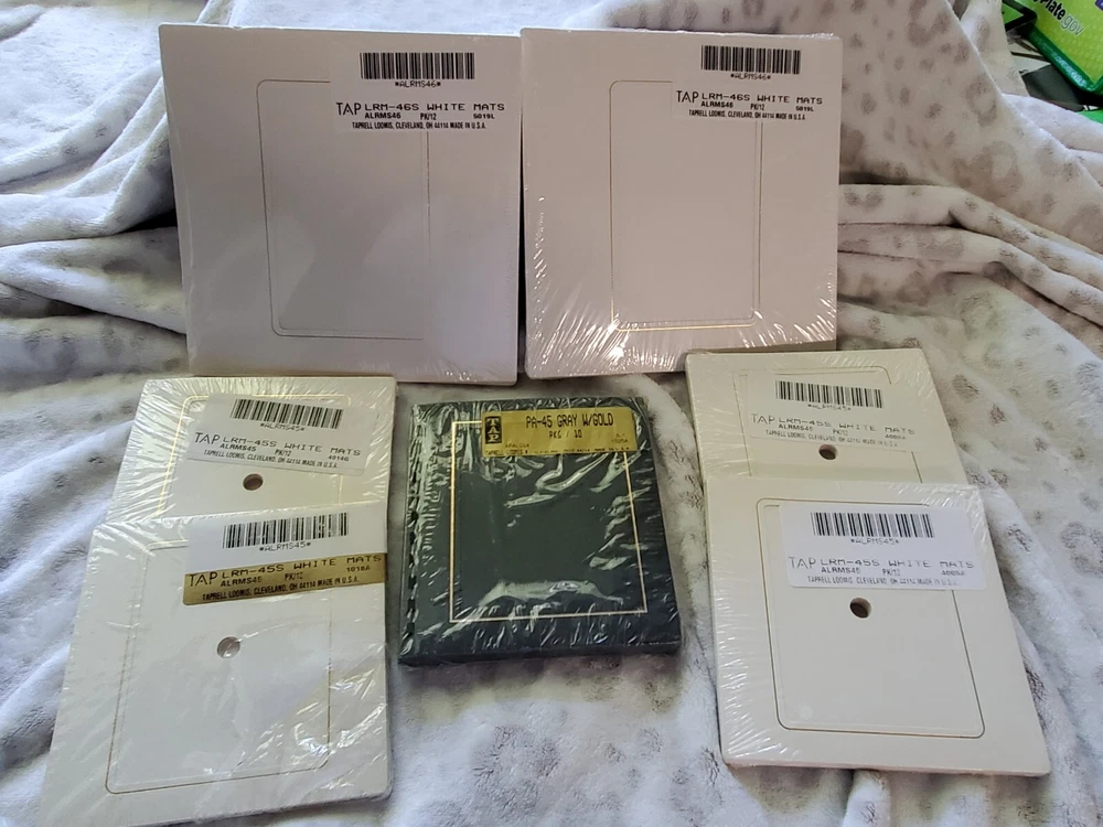 Total Bundle : Tap Photo Album Refills : Qty 4-Tap LRM 45 White mats Package contain 12- mat size 6x6 Photo size 4x5 Qty 2- Tap LRM-46s white mat package contains 12 - 8x8 mat size - Photo size 4x6 Qty 1- Tap PA-45 Gray w/Gold - Package contains 10 - size 5 1/2 x 6 Wedding Albums: Small wedding album 6x6- Tap Fanfare White 45RM Holds 18 photos includes 17 mats included- photo size 3 1/2 x 4 1/2 Large wedding album 8 1/2 x 9 1/2 -Tap Fanfare White 46-RM Holds 24 photos (additional sleeves can be added) size of sleeved 8x8