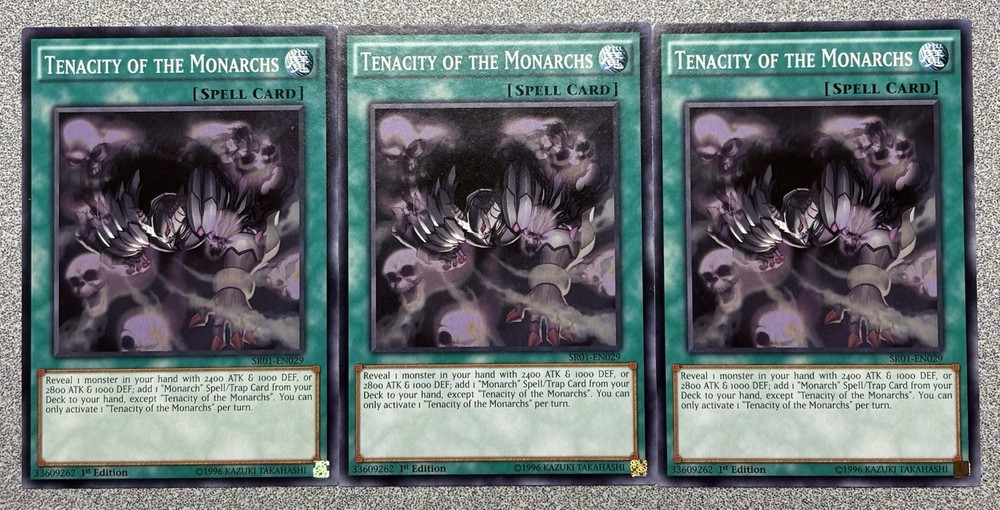 | Card Text | Reveal 1 monster in your hand with 2400 ATK & 1000 DEF, or 2800 ATK & 1000 DEF; add 1 "Monarch" Spell/Trap Card from your Deck to your hand, except "Tenacity of the Monarchs". You can only activate 1 "Tenacity of the Monarchs" per turn. |