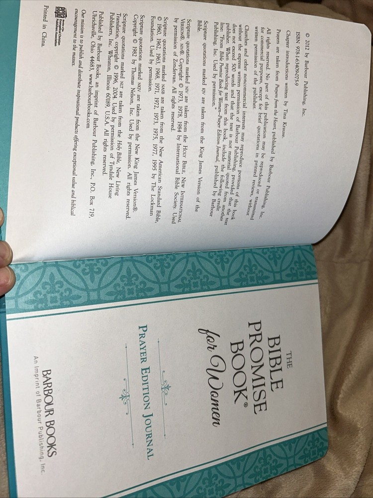 This Bible Promise Book for Women is a wonderful addition to any Christian woman's library. The journal features faux leather binding and is perfect for recording personal prayers and scriptures. The book contains chapter introductions by Tina Krause , and is published by Barbour Publishing, Inc in 2012. It is written in English and falls under the category of Books & Magazines. The book contains scriptures, and small devotional phrases that correlate with the scripture, and features blank lines for one’s personal thoughts. Photo shows only flaw of inner front peeling on inside cover.