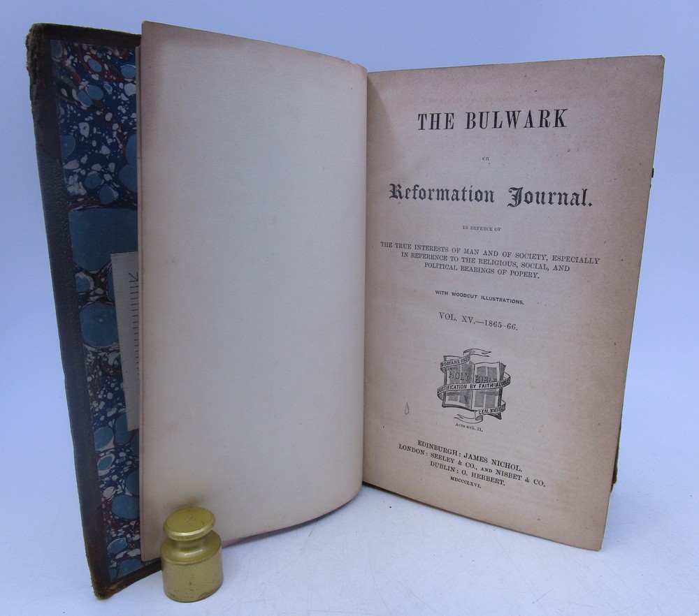 Shelley and Son Books (IOBA) presents ... The Bulwark or Reformation Journal (Vols 15 & 16) Author: Alexander, William L., et al. (Eds) Publisher: James Nichol Release Date: 1866 Jacket Condition: Seller Category: Christian Protestant Qty Available: 1 Condition: Used: Very Good Media: Hardcover (Half Leather) Notes: (Vols 15 & 16 in one volume) Worn binding, spine labels gone, Library book plate inside cover, but no other marks. Size: Octavo (standard book size). 648 pages. Full refund if not satisfied. Don't forget to check out other great deals in our eBay Store!!