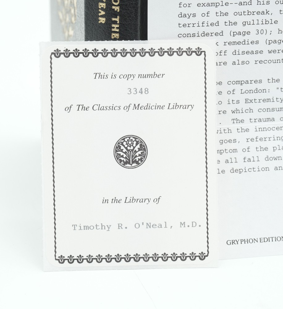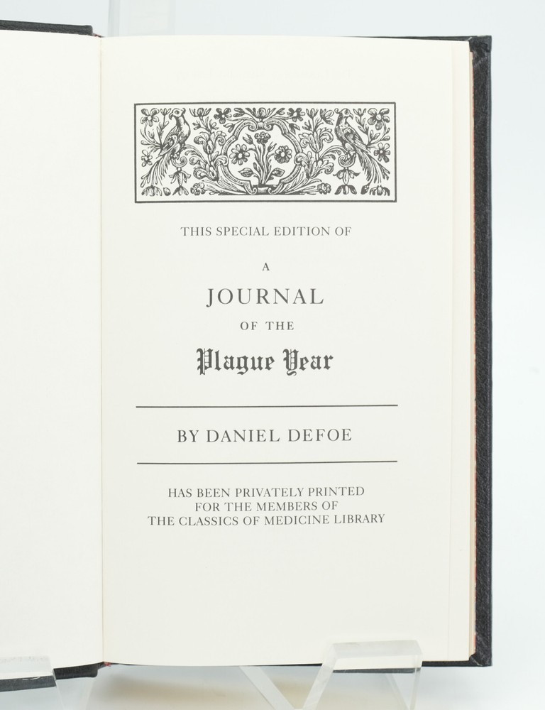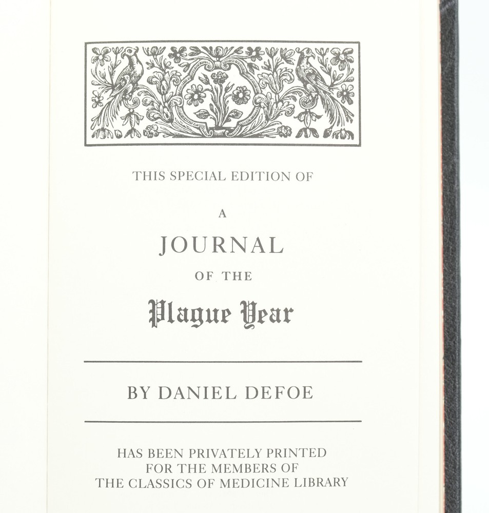 20250124X746 Gryphon Editions Classics of Medicine Library Special Edition "A Journal of the Plague Year" by Daniel Defoe Fine L eather Bound Hardcover with only minimal signs of handling About the Publisher: For over 40 years Gryphon Editions has been publishing facsimile reproductions of the classic books in Law, Medicine, Science, History and Political Thought. Each volume is luxuriously bound in the best quality leather – never synthetic material.