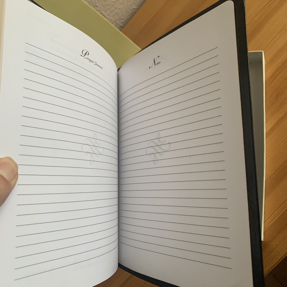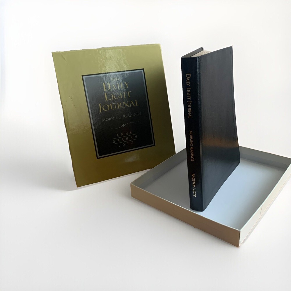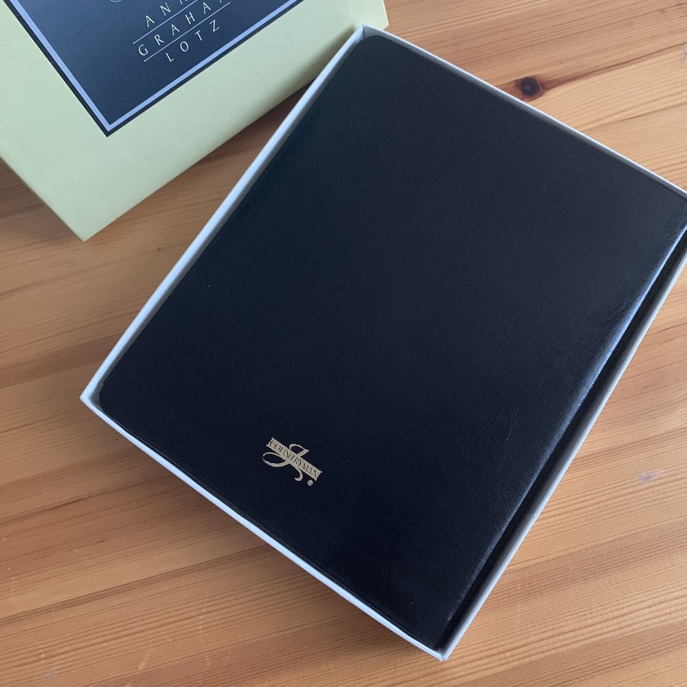 Black leather bound. Box is not in perfect shape but the journal is new unused.