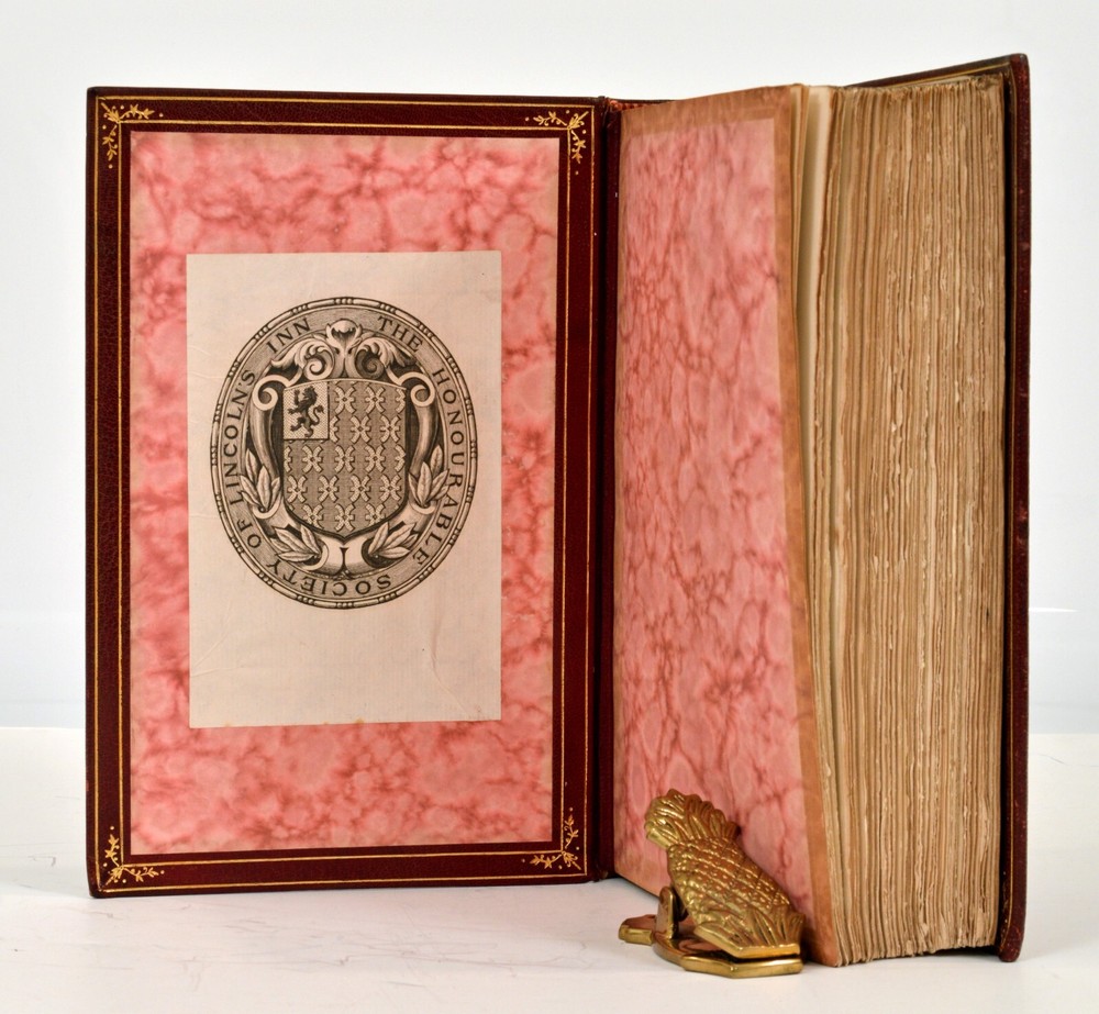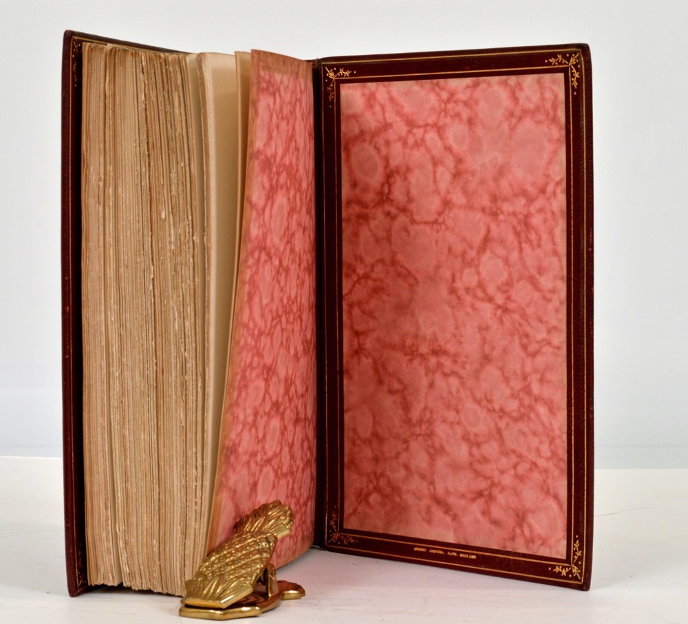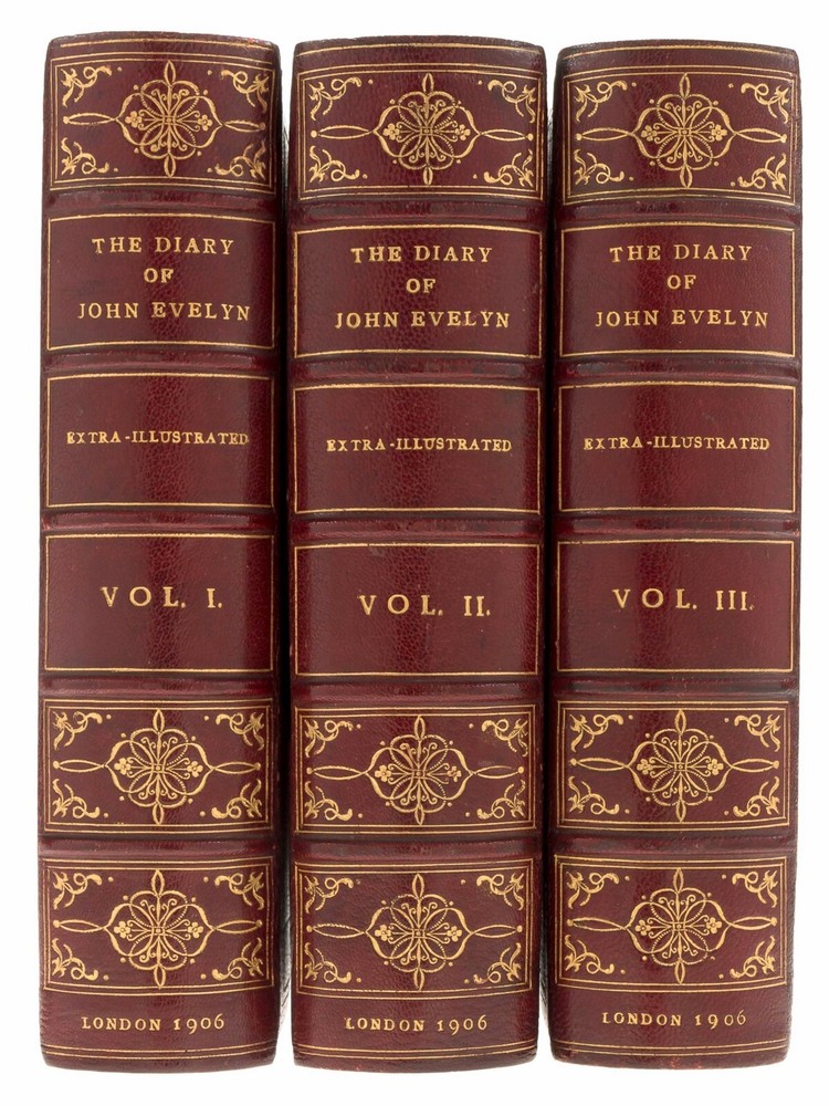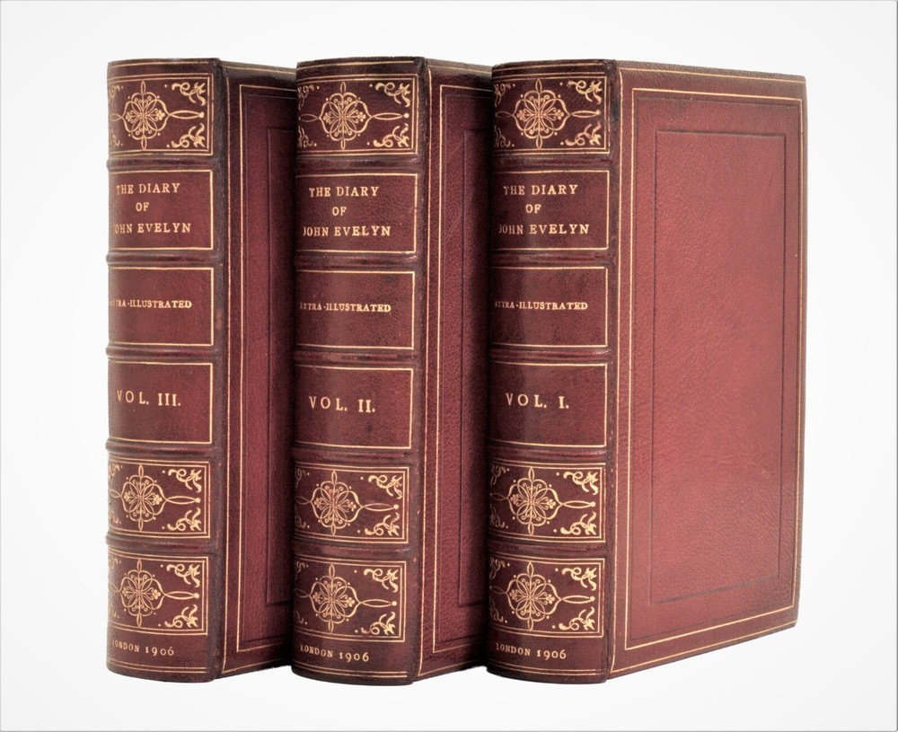 The Diary of John Evelyn, Edited by Austin Dobsin Complete 3 Volume Set Published by Macmillan and Co., London in 1906 Signed Bindings by Cedric Chivers, Bath, England Near FINE Condition Binding Details: Fine contemporary Chivers bindings of full dark red morocco leather, boxed gilt decorated spine, blind and gilt ruling to both beveled boards, gilt ruling and corner decoration to the inner boards, leather hinge to the free marbled end papers. The top page edges are gilted and there are silk head and tailbands. The bindery stamp of Cedric Chivers appears in gilt to the bottom edge of the back cover of each book. Set Details: Evelyn's Diary provides a vivid portrait of the great events and personalities of 17th century England, and he is justly ranked with his contemporary, Samuel Pepys, as one of greatest English diarists of all time. The diaries originally consisted of two manuscript volumes covering the period between 1641 and 1706, a few weeks before the author's death. It remained in manuscript form until 1818, when William Bray published a selection from the Diary under the title "Memoirs Illustrative of the Life and Writings of John Evelyn, comprising His Diary from 1641 to 1705/6, and a Selection of His Familiar Letters" in 2 volumes. Later editions of which this is one, includes an additional volume containing his correspondence. This edition is the extra illustrated edition that contains 100 eighteenth and nineteenth century engravings with an original watercolor frontis portrait of the young Evelyn and a hand drawn extra title page to Volume 1. Each book measures 8.75” x 6” x 2.125”. Volume 1 is 335 pages, Volume 2 is 420 pages, and Volume 3 is 479 pages. Condition Report: The bindings are in Near FINE condition with minimal surface wear and some light scuffing to the hinges which remain sound and secure. Internally, the books are very clean with no foxing. Each volume contains the bookplate of the The Honourable Society of Lincoln’s Inn on the front pastedown. Photographs of the books, the Chivers binder’s stamp, bookplate, and the frontispiece illustration appear in the photo section of the listing.