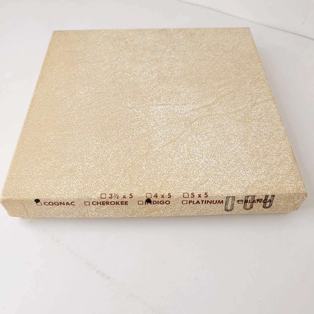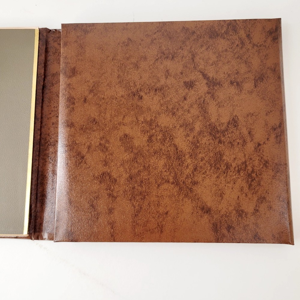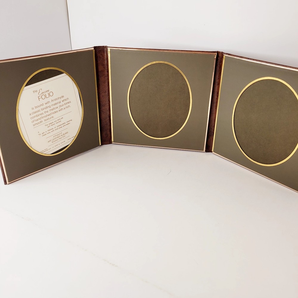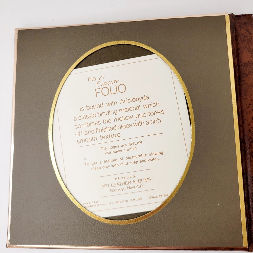 This is The Encore Folio by Art Leather Albums, Brooklyn, NY. NIB It "is bound with Aristohyde, a classic binding material which combines the mellow duo-tones of hand finished hides with a rich smooth texture" The edges are MYLAR and will never tarnish. This is a 3 page, book album. 4" x 5" pictures would fit. This is a dark brown album, and the inside frames are a dark greenish-grey color. To get a lifetime of pleasurable viewing clean only with mild soap and water. This does dome in its original box. Although that shows wear on the bottom and is marked for the color "cognac".