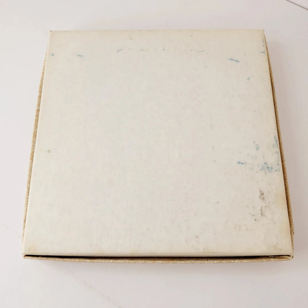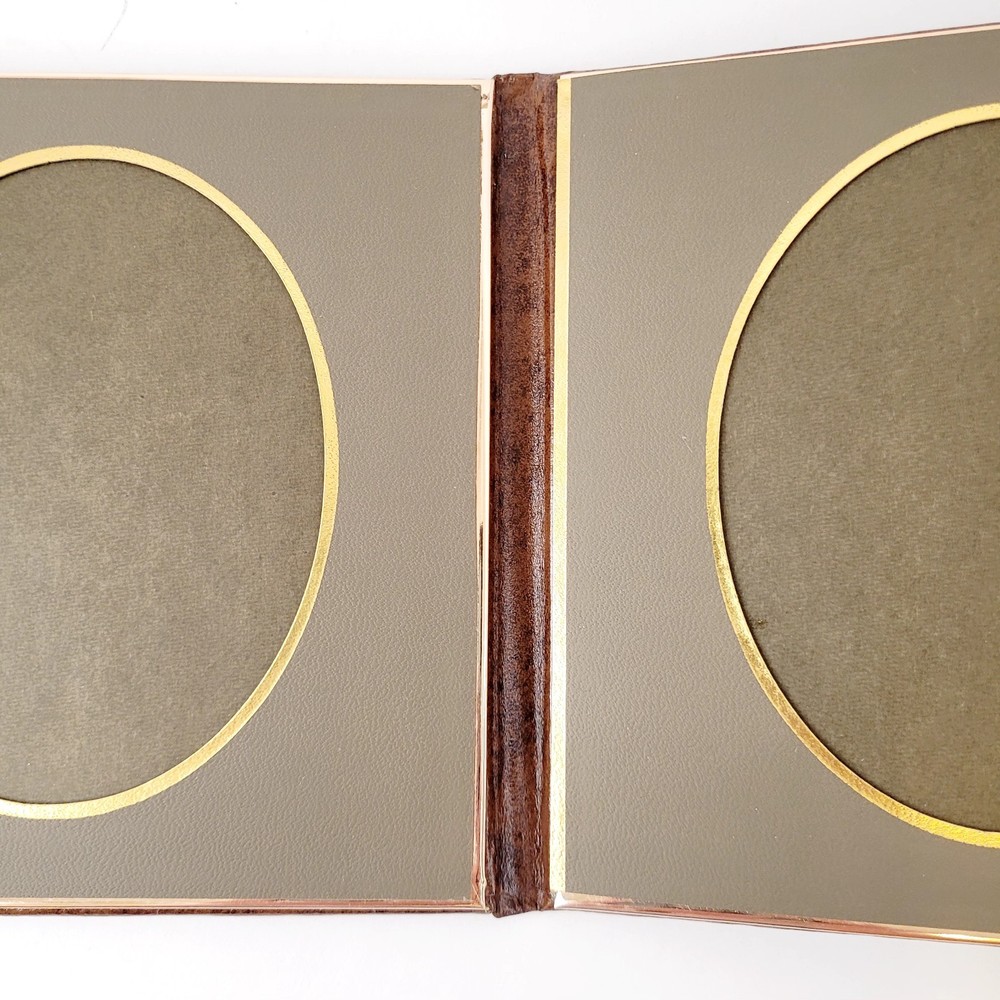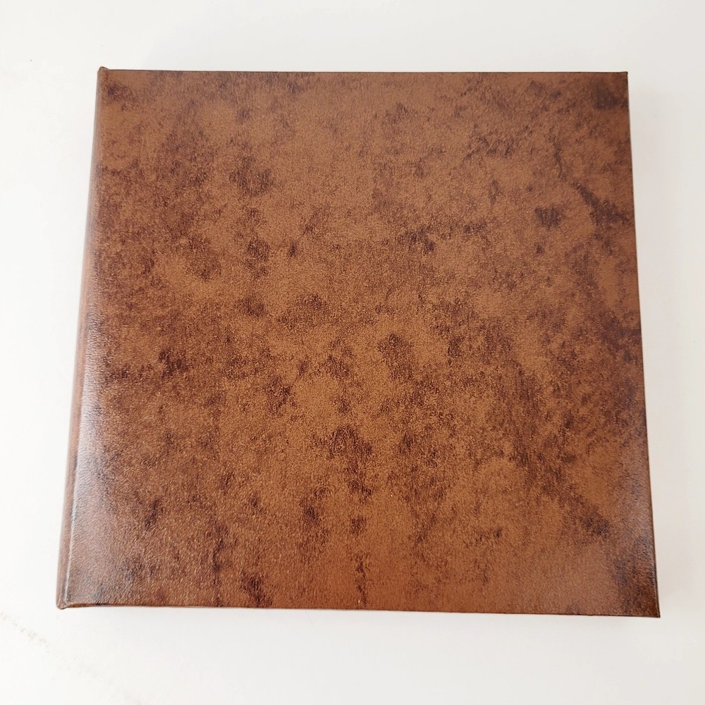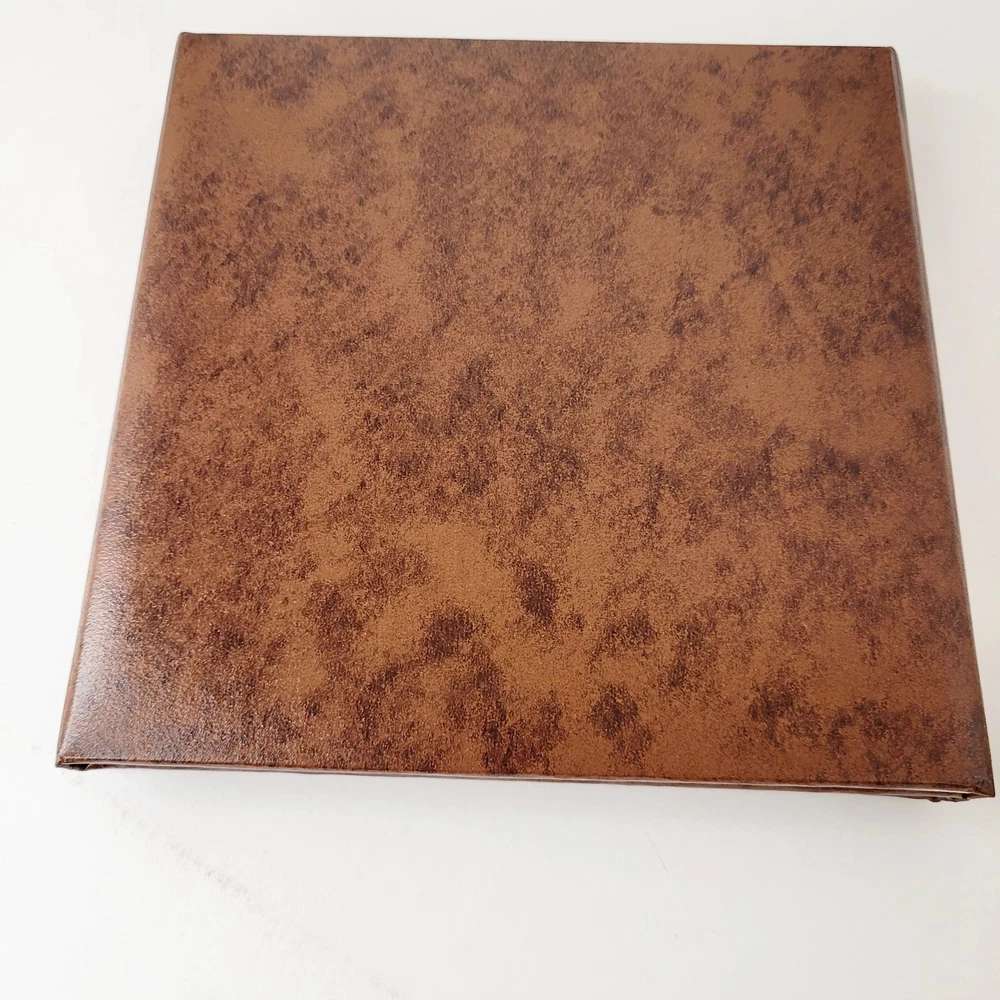 This is The Encore Folio by Art Leather Albums, Brooklyn, NY. NIB It "is bound with Aristohyde, a classic binding material which combines the mellow duo-tones of hand finished hides with a rich smooth texture" The edges are MYLAR and will never tarnish. This is a 3 page, book album. 4" x 5" pictures would fit. This is a dark brown album, and the inside frames are a dark greenish-grey color. To get a lifetime of pleasurable viewing clean only with mild soap and water. This does dome in its original box. Although that shows wear on the bottom and is marked for the color "cognac".