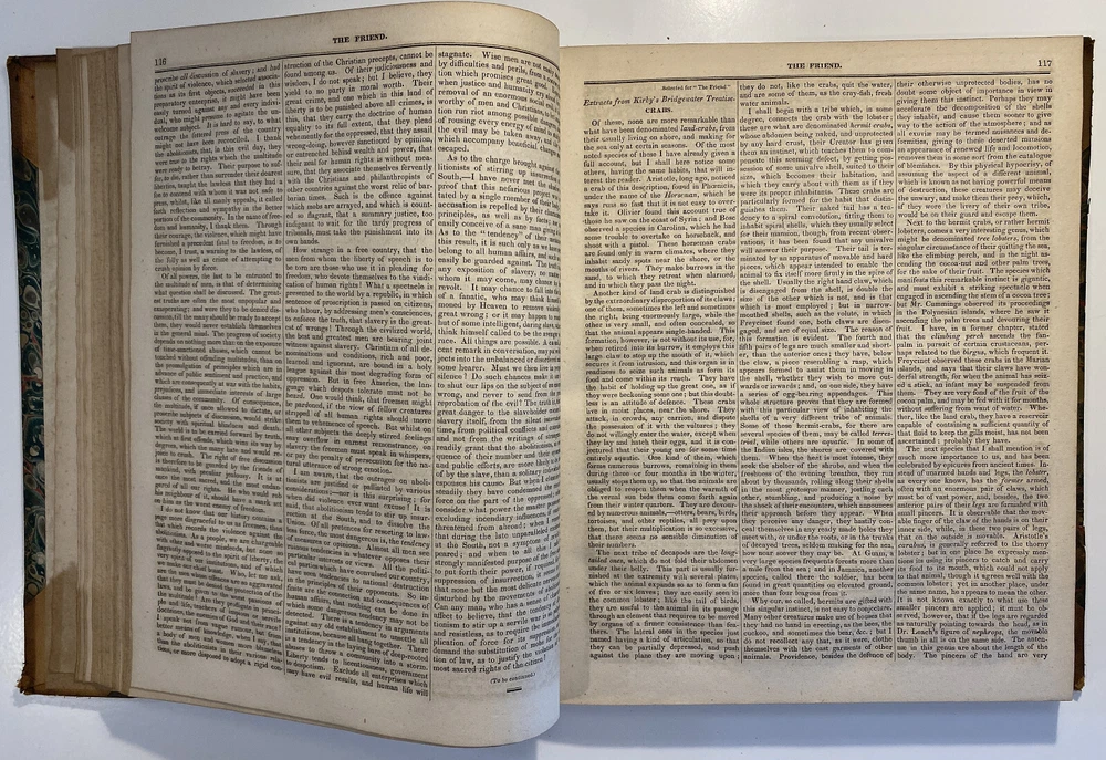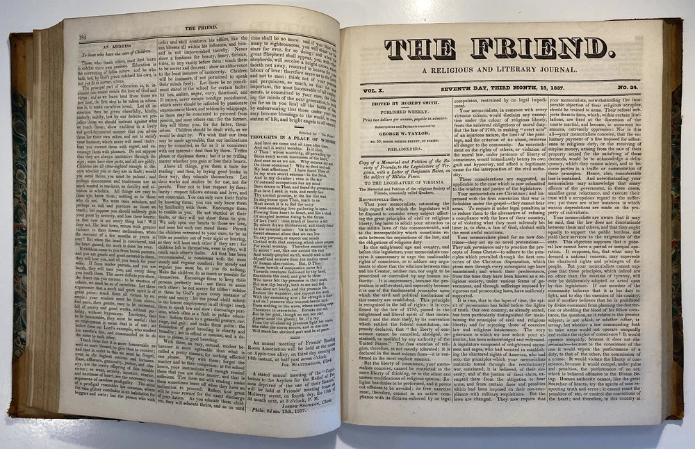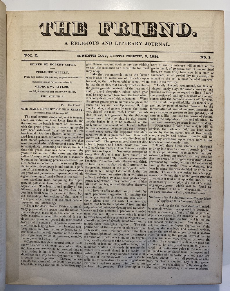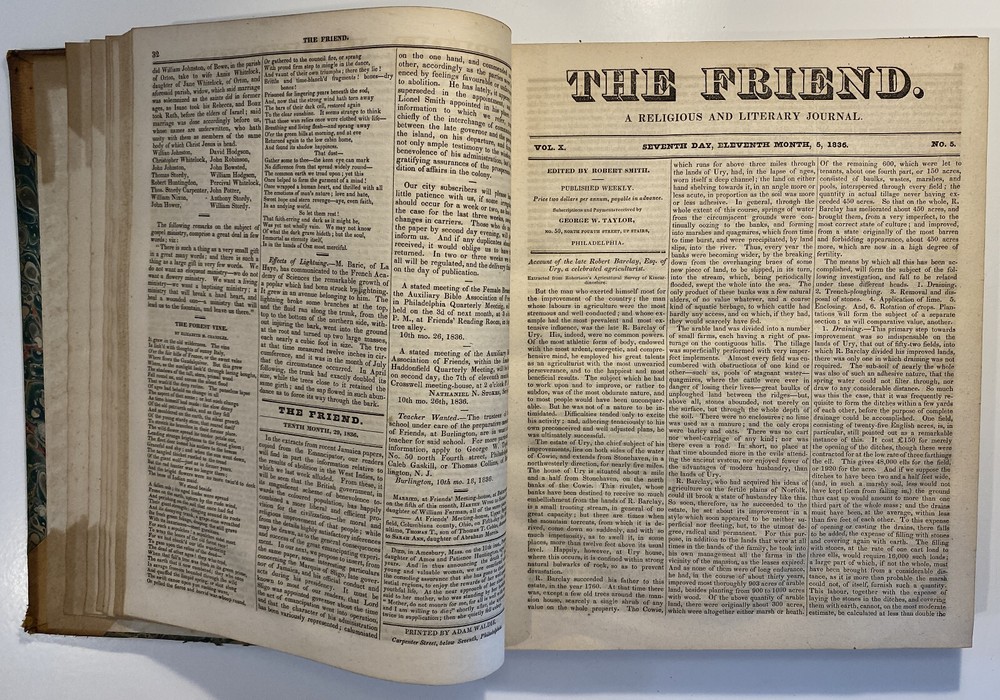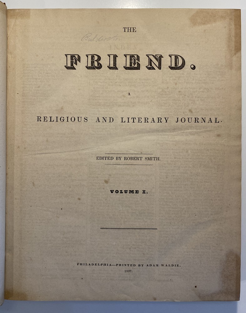 Title: The Friend. A Religious and Literary Journal. Volume X. Editor: Robert Smith Printer: Adam Waldie, Philadelphia Year: 1836-1837 Details: Volume 10, comprising Vol. X., No. 1 (“Seventh Day, Tenth Month, 8, 1836”) to No. 52 (“Seventh Day, Ninth Month, 30, 1837”). With index. Topics include the Adelphi school, American Indians, the African slave trade and Texas, the Association of Friends for the instruction of coloured persons, Elisha Bates, Richard Baxter, Robert Barclay, Solomon Bayley, Catherine E. Beecher, the Beaconites, the Bible Association of Friends in America, crabs, Nathaniel C. Crenshaw, colonization in Liberia, coloured people of Pittsburg and Cincinnati, emancipation in the West Indies and John Eliot, the apostle of the Indians [6], 416pp.; 11 x 9.5 in.