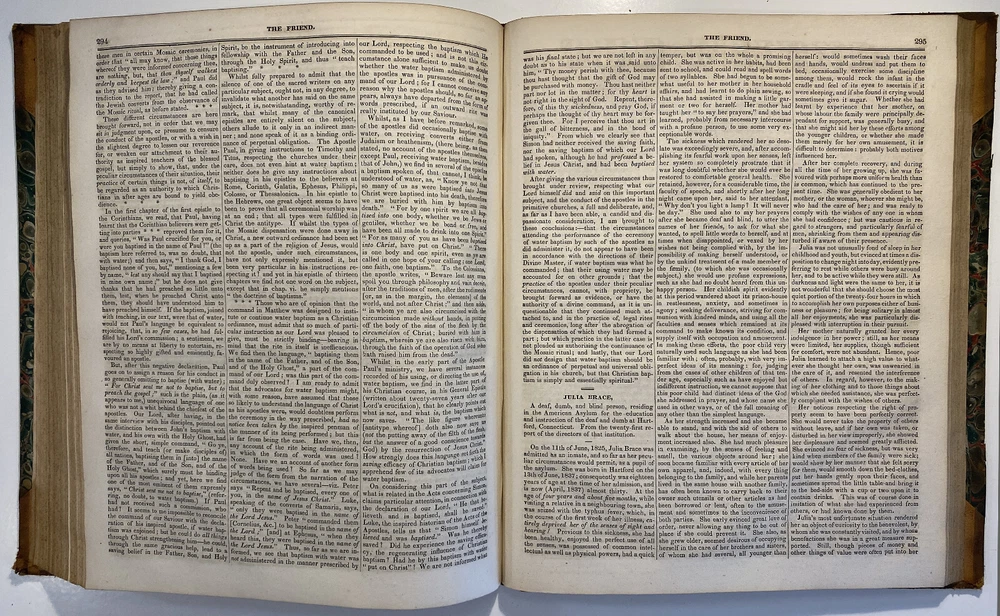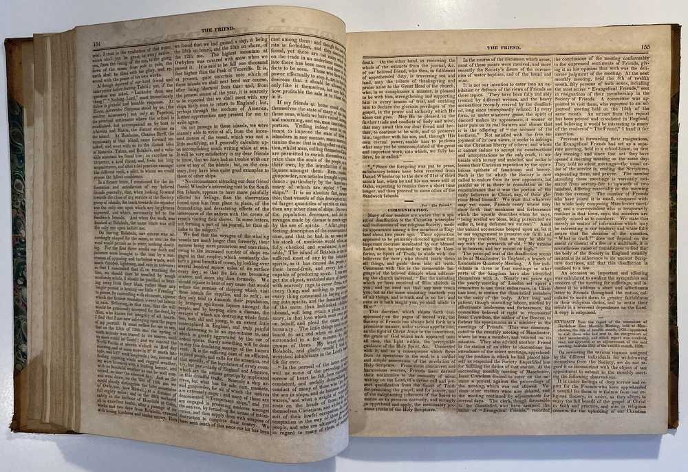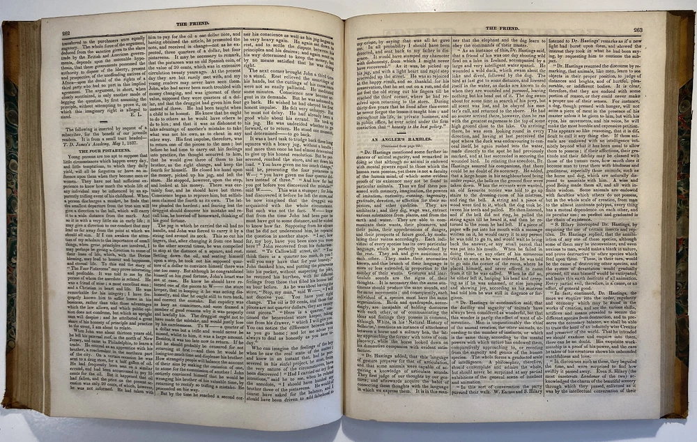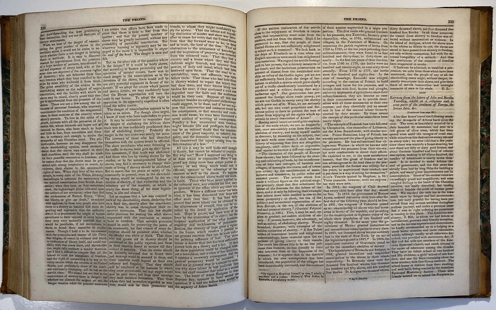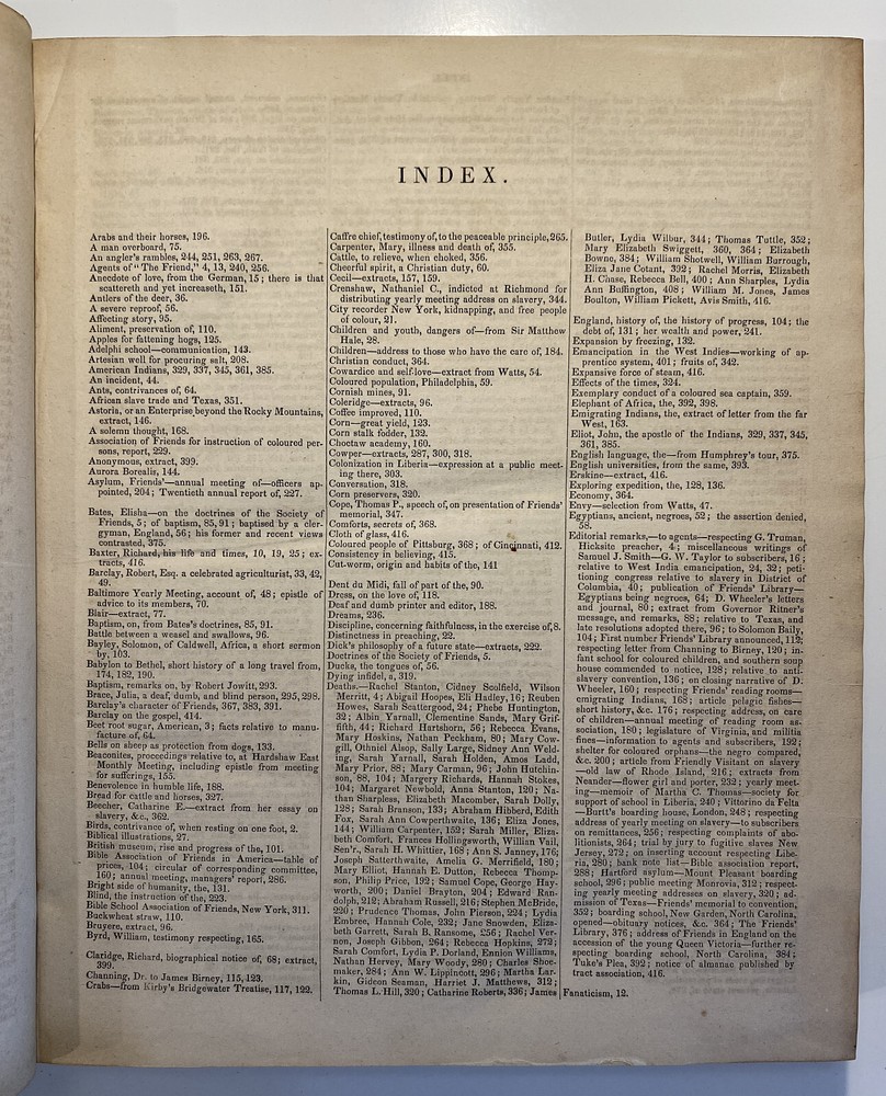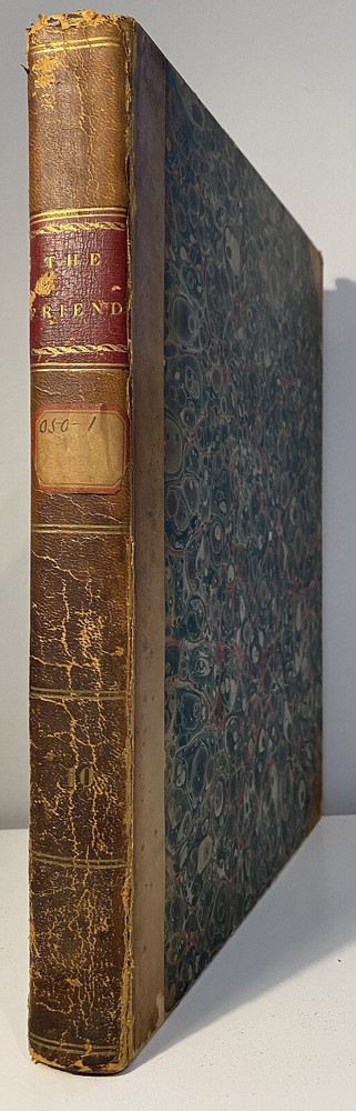 Title: The Friend. A Religious and Literary Journal. Volume X. Editor: Robert Smith Printer: Adam Waldie, Philadelphia Year: 1836-1837 Details: Volume 10, comprising Vol. X., No. 1 (“Seventh Day, Tenth Month, 8, 1836”) to No. 52 (“Seventh Day, Ninth Month, 30, 1837”). With index. Topics include the Adelphi school, American Indians, the African slave trade and Texas, the Association of Friends for the instruction of coloured persons, Elisha Bates, Richard Baxter, Robert Barclay, Solomon Bayley, Catherine E. Beecher, the Beaconites, the Bible Association of Friends in America, crabs, Nathaniel C. Crenshaw, colonization in Liberia, coloured people of Pittsburg and Cincinnati, emancipation in the West Indies and John Eliot, the apostle of the Indians [6], 416pp.; 11 x 9.5 in.