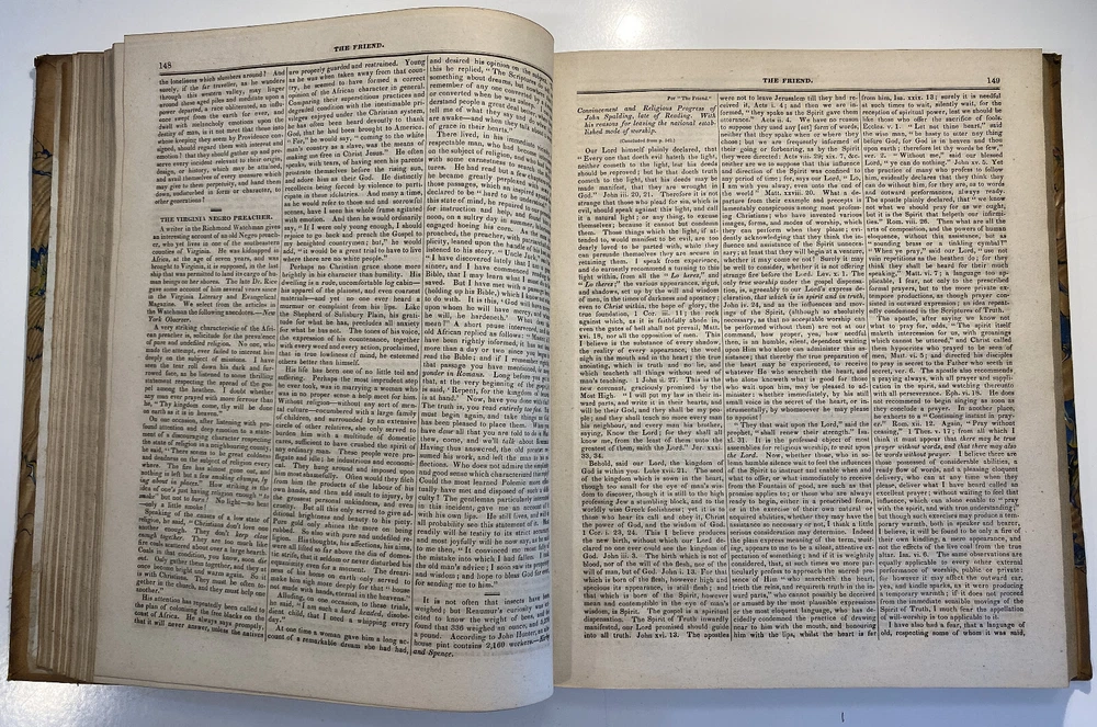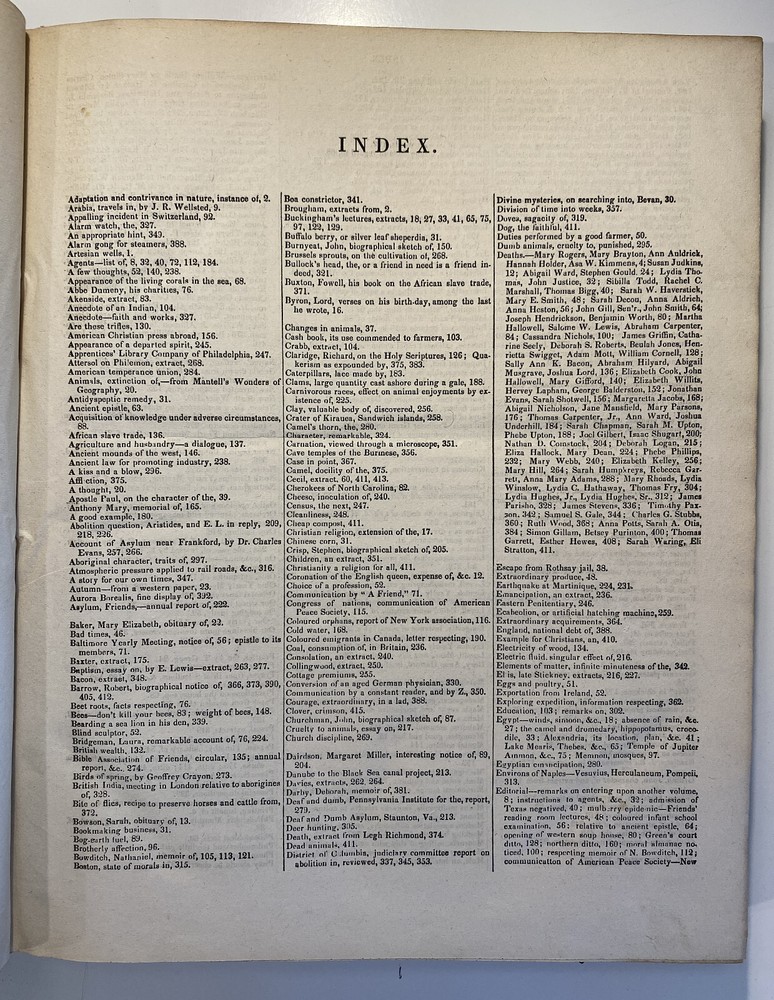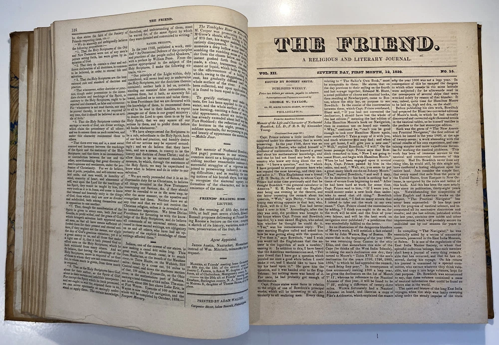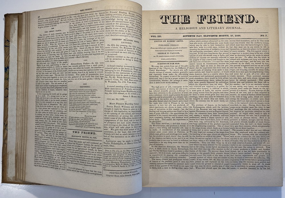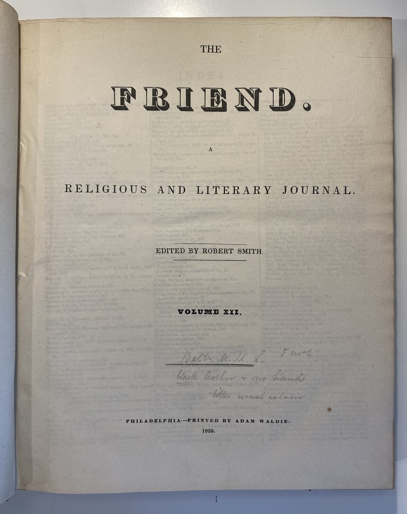 Title: The Friend. A Religious and Literary Journal. Volume XII. Editor: Robert Smith Printer: Adam Waldie, Philadelphia Year: 1838-1839 Details: Volume 12, comprising Vol. XII, No. 1 (“Seventh Day, Tenth Month, 6, 1838”) to No. 52 (“Seventh Day, Ninth Month, 28, 1839”). With index. Topics include Artesian wells, the African slave trade, the remarkable account of Laura Bridgeman, Sarah Bowson, Nathaniel Bowditch, the state of morals in Boston, bees, Buckingham’s lectures, the cultivation of Brussels sprouts, Buxton Fowell’s book on the African slave trade, Richard Claridge, the Cherokees of North Carolina, the American Peace Society, the deaf and dumb, and the sagacity of doves. [6], 416pp.; 11 x 9.5 in.