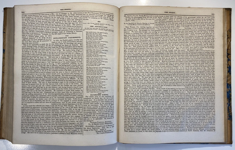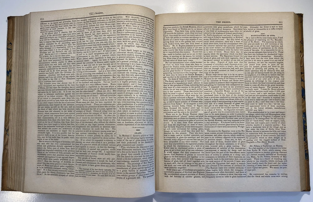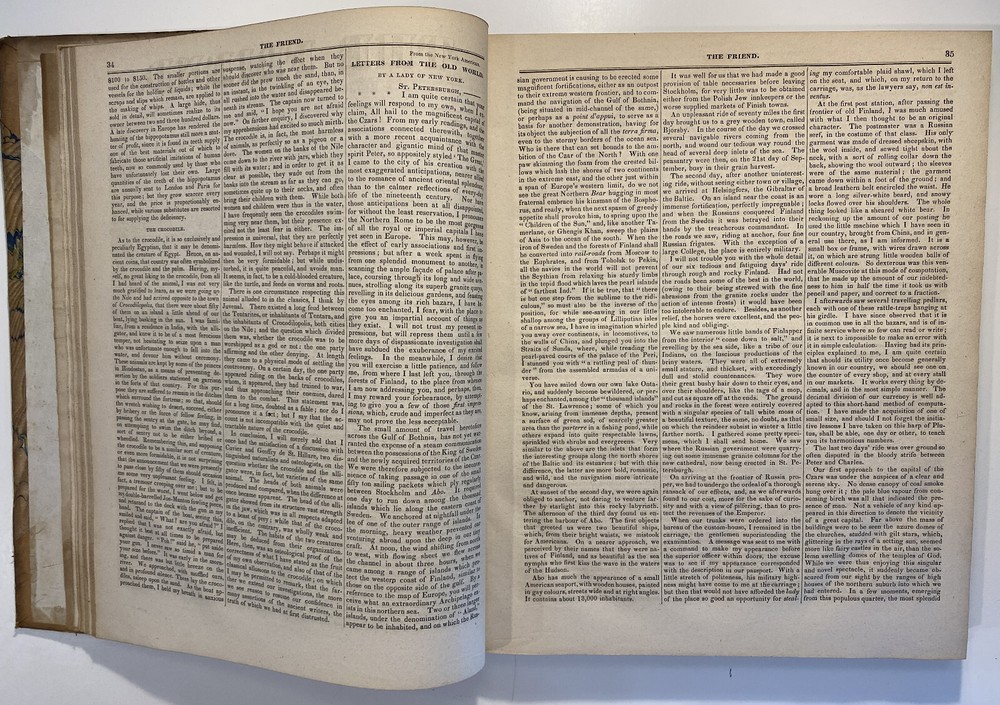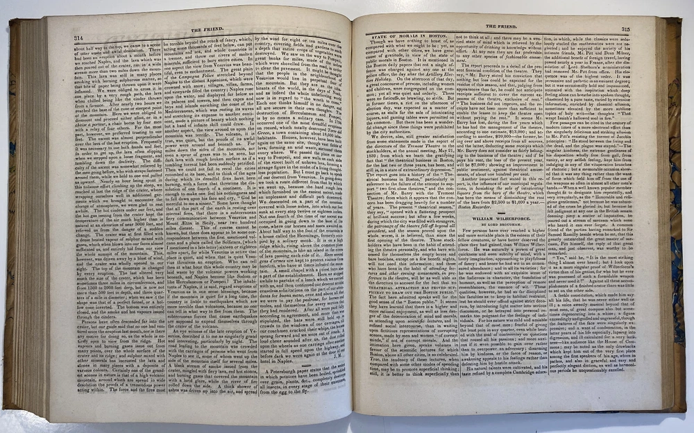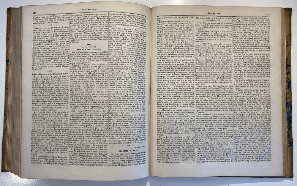 Title: The Friend. A Religious and Literary Journal. Volume XII. Editor: Robert Smith Printer: Adam Waldie, Philadelphia Year: 1838-1839 Details: Volume 12, comprising Vol. XII, No. 1 (“Seventh Day, Tenth Month, 6, 1838”) to No. 52 (“Seventh Day, Ninth Month, 28, 1839”). With index. Topics include Artesian wells, the African slave trade, the remarkable account of Laura Bridgeman, Sarah Bowson, Nathaniel Bowditch, the state of morals in Boston, bees, Buckingham’s lectures, the cultivation of Brussels sprouts, Buxton Fowell’s book on the African slave trade, Richard Claridge, the Cherokees of North Carolina, the American Peace Society, the deaf and dumb, and the sagacity of doves. [6], 416pp.; 11 x 9.5 in.
