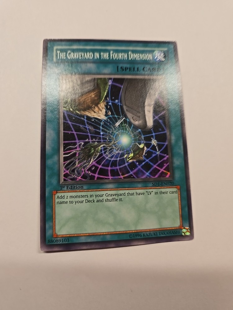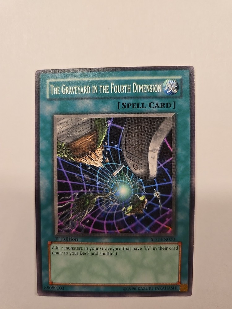 The product is a 1st Edition Spell-Normal card named "The Graveyard in the Fourth Dimension" from the Yu-Gi-Oh! TCG Structure Deck: Dragon's Roar. It has a card number of SD1-EN020 and is in English. It has 0 Attack/Power and 0 Defense/Toughness, and is a Common/Short Print rarity. It is manufactured by Konami.