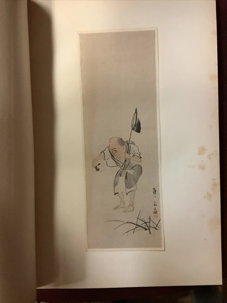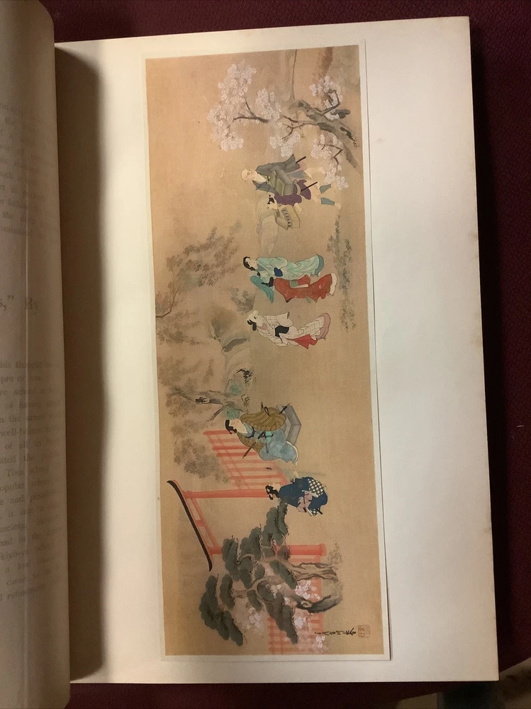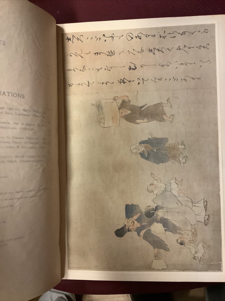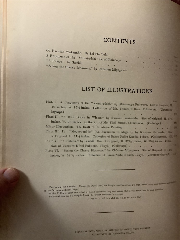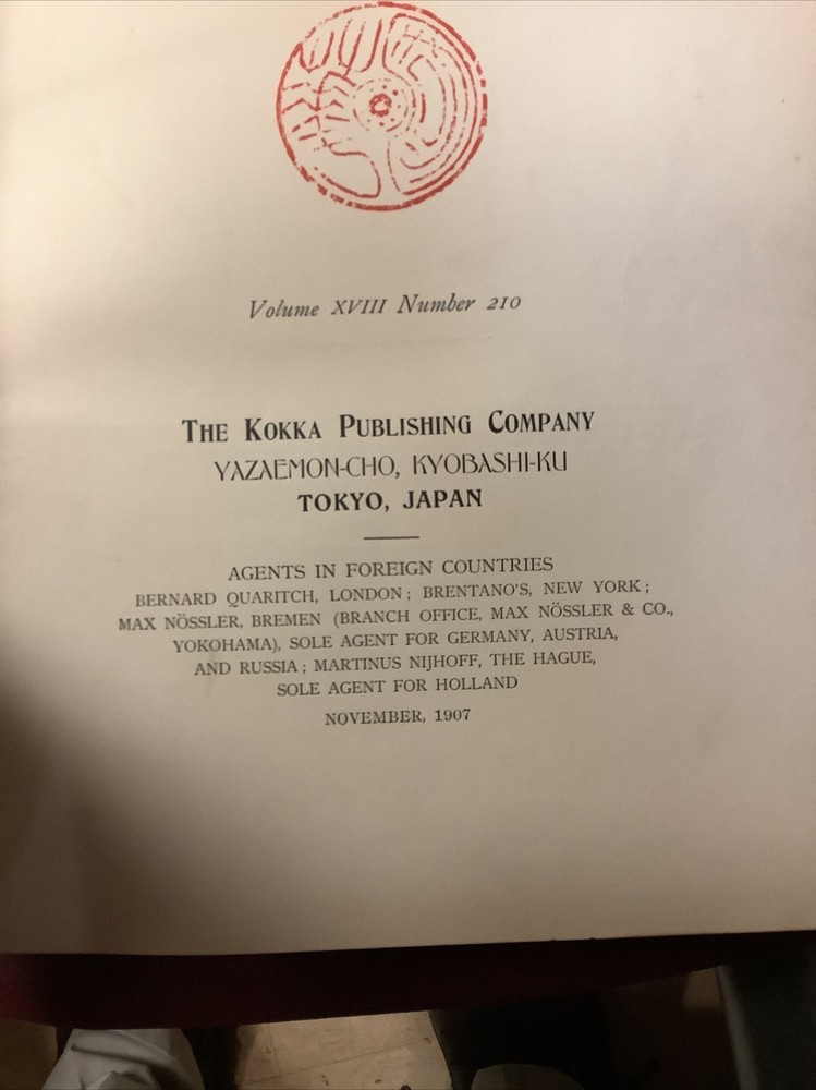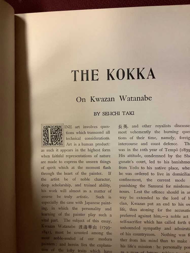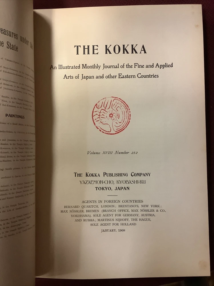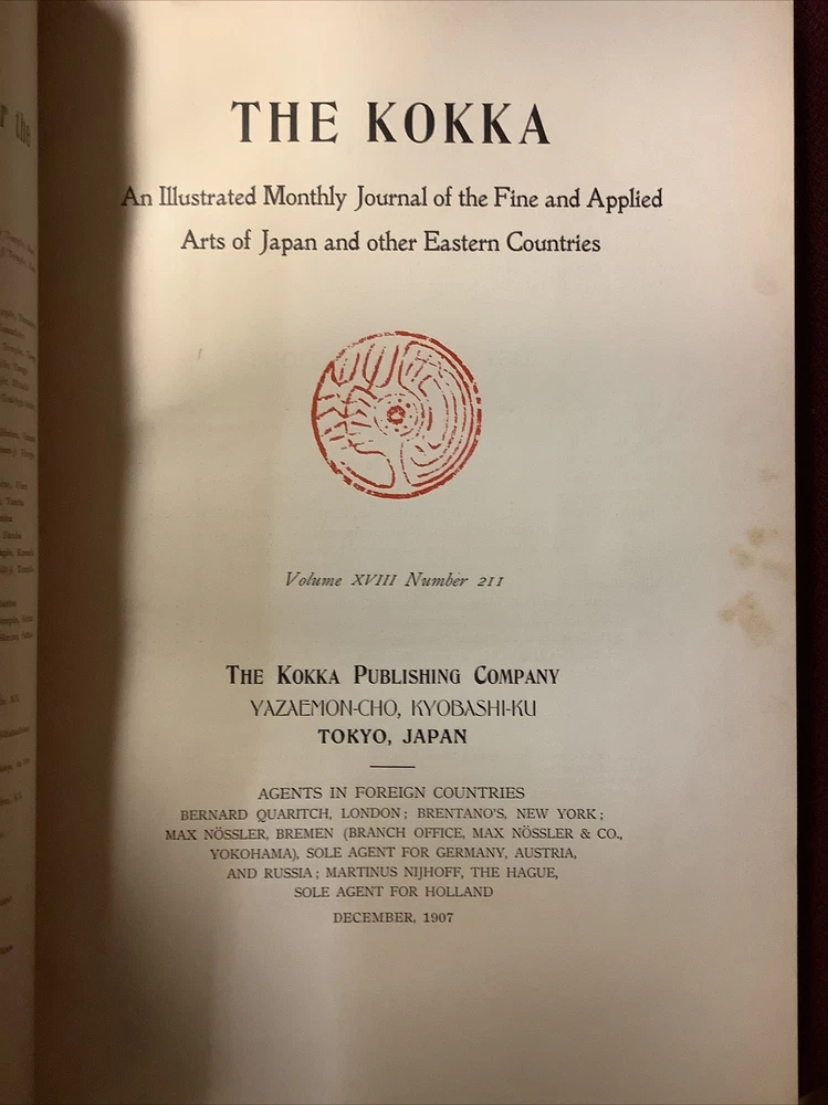 12 issues of The Kokka An illustrated Monthly Journal of the Fine and Applied Arts of Japan and other Eastern Countries. Bound in single volume. Oversize 3/4 leather. Leather worn, splitting at hinges. Foxing and spotting to margins throughout. Vivid color prints with tissue guards. Many black-and-white prints, photos. Published by The Kokka Publishing Company in Tokyo, Japan. Text in English. 1st volume, November 1907. 12th October 1908.