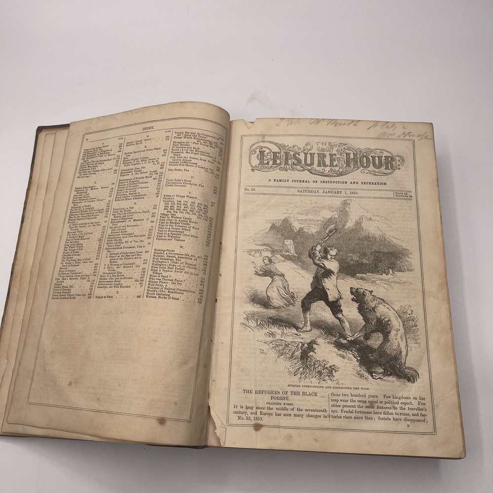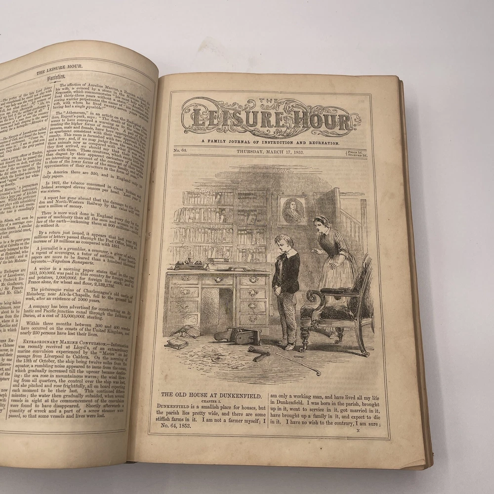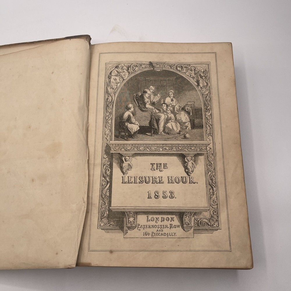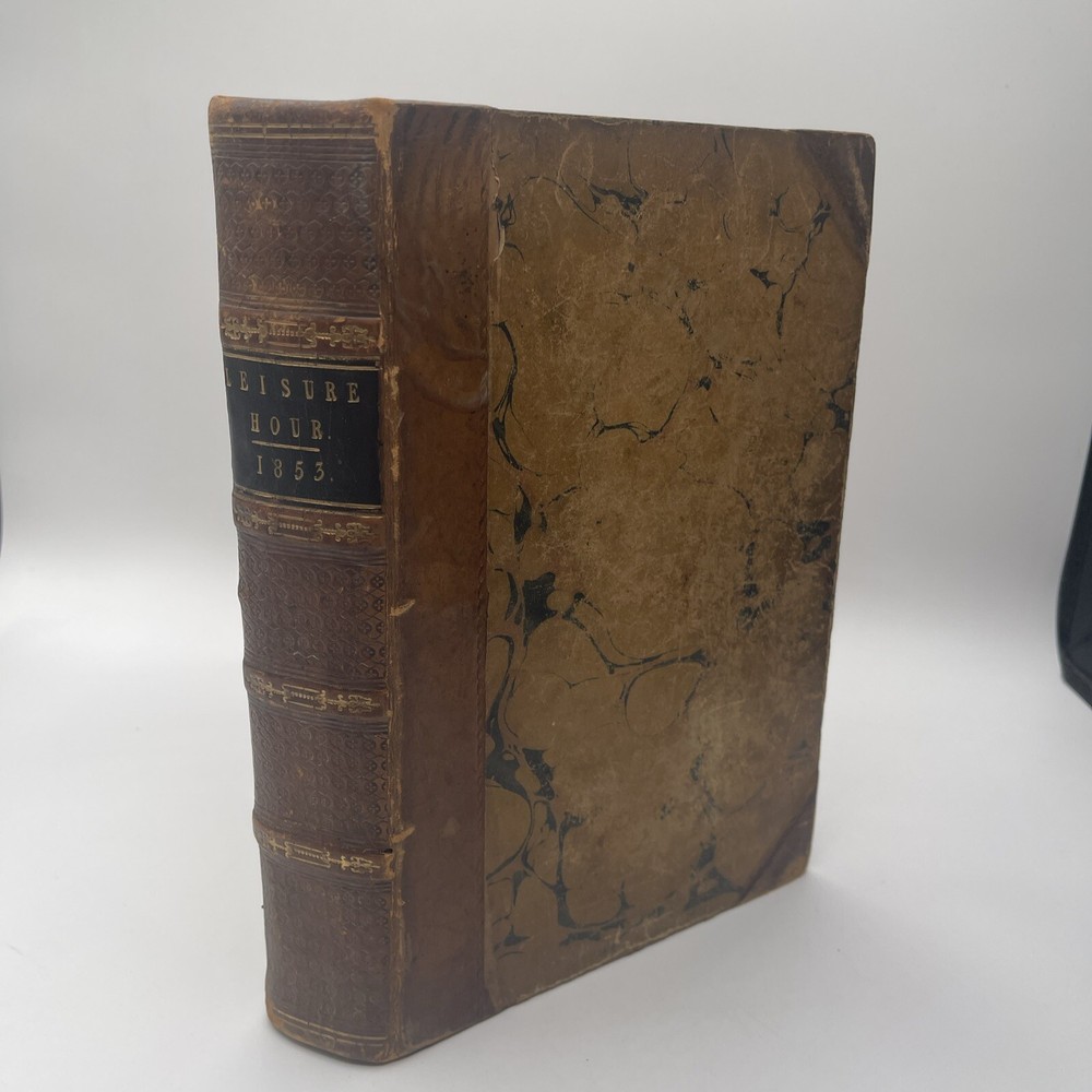 This is a rare and valuable copy of "The Leisure Hour Family Journal Of Instruction & Recreation Year Of 1853". It features beautiful leather binding, clear English language, and is illustrated with 1st edition graphics. The publisher, William Stevens, did an exceptional job of creating a literary masterpiece that will stand the test of time. This book is a great addition to any collection and is a must-have for literature enthusiasts. The book was printed in the United Kingdom in 1853 and is an original copy. It covers a range of topics related to literature and fiction, making it a great conversation piece for any book lover. 844 pages - front/rear board loose but attached. Some writing inside front rest of text clean
