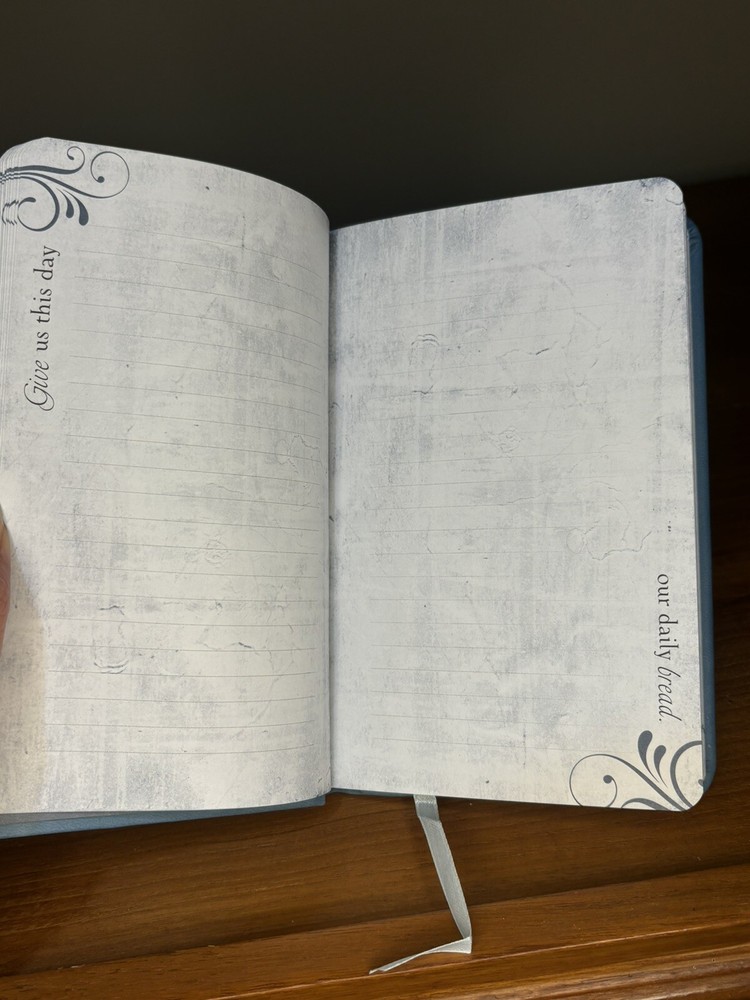 This blue leather-bound prayer journal is a beautiful addition to any collection. Measurements: 4 1/2" x 7". The journal is designed with the inscription of the "Our Father" prayer on the cover, making it a perfect gift for a loved one. The book is written in hardcover format, ensuring that it will last for years to come. The Lord's Prayer Journal is perfect for those who want to keep track of their prayers and reflections. It features a leather-bound cover that is both stylish and durable. The book is ideal for anyone who wants to add a touch of elegance to their prayer routine.