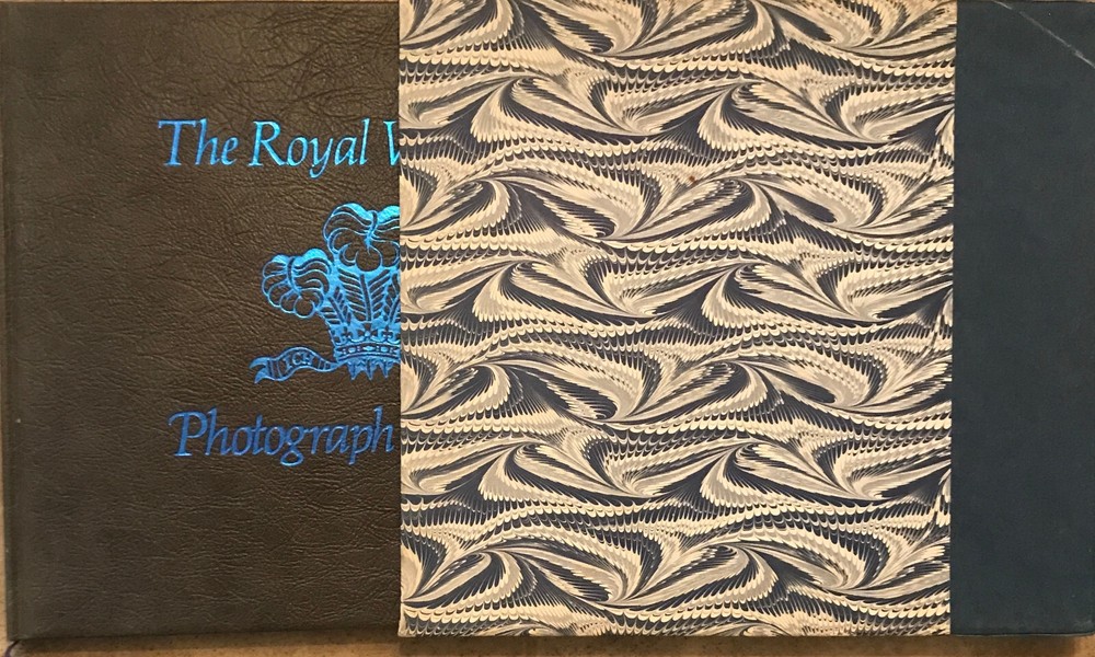 A very good copy of The Royal Wedding Photograph Album, commemorating the wedding of Charles and Diana. Published by Easton Press in 1981. Hardcover book has rich brown textured leather cover, with blue stamped design, purple ribbon bookmark. Slipcase has blue marbled design, matching the endpapers. Book in excellent condition. Pages are clean and bright, with some light foxing at page edges not affecting text. Slipcase is intact, tanned at edges, a scratch at corner on one side. Size: 10 3/4" x 12". Ships in 24 hours, in box.