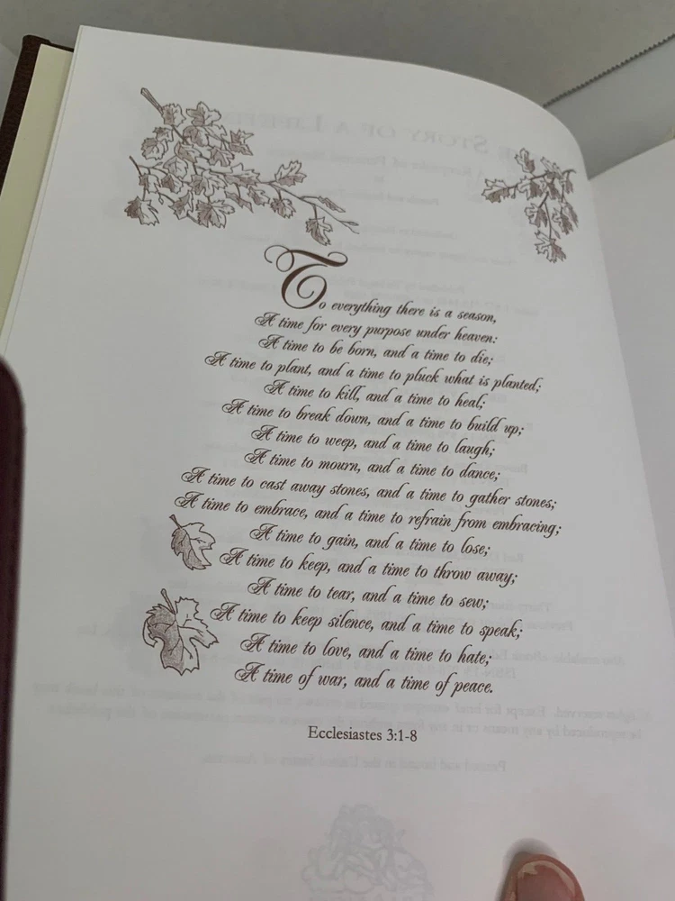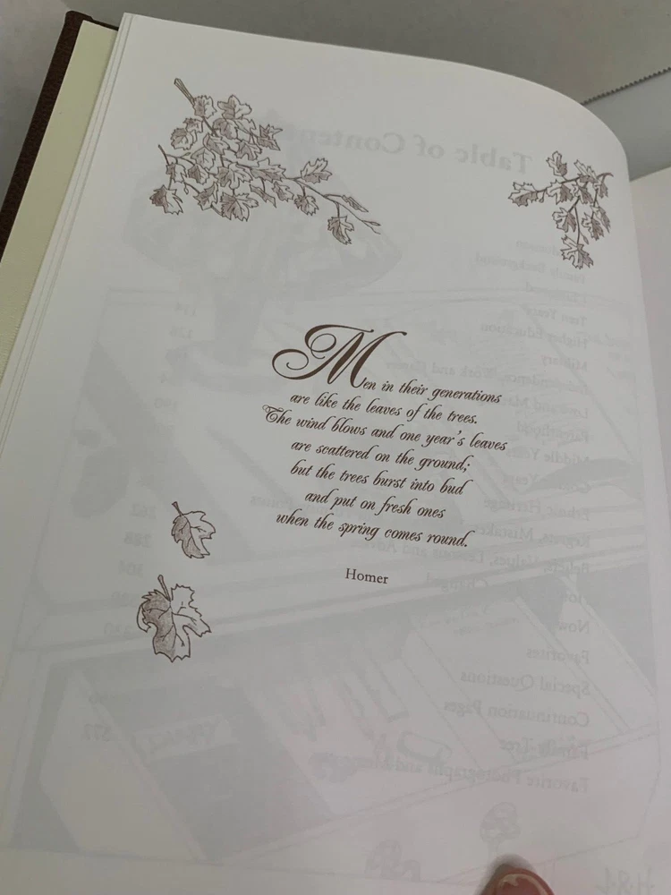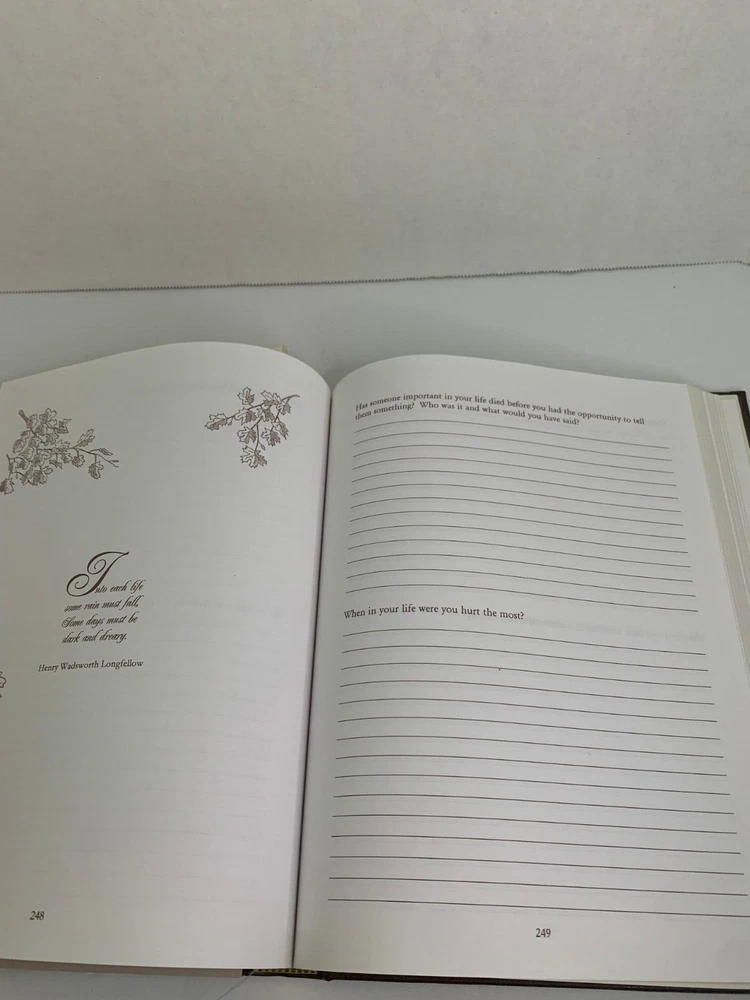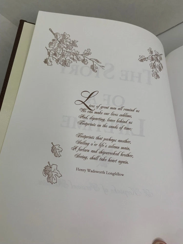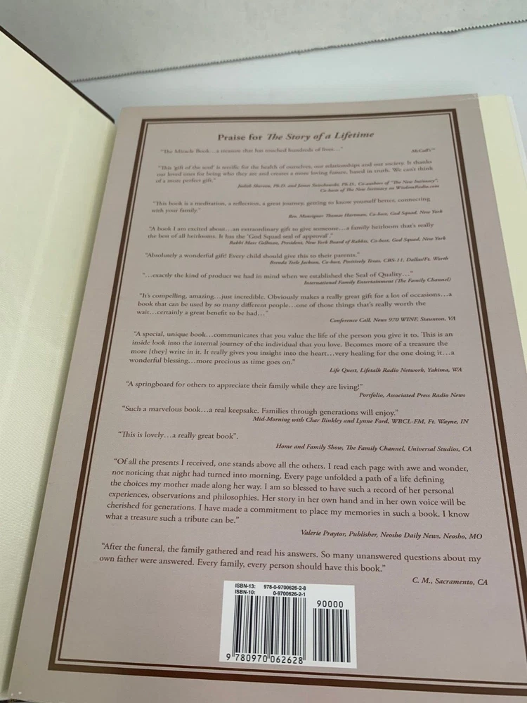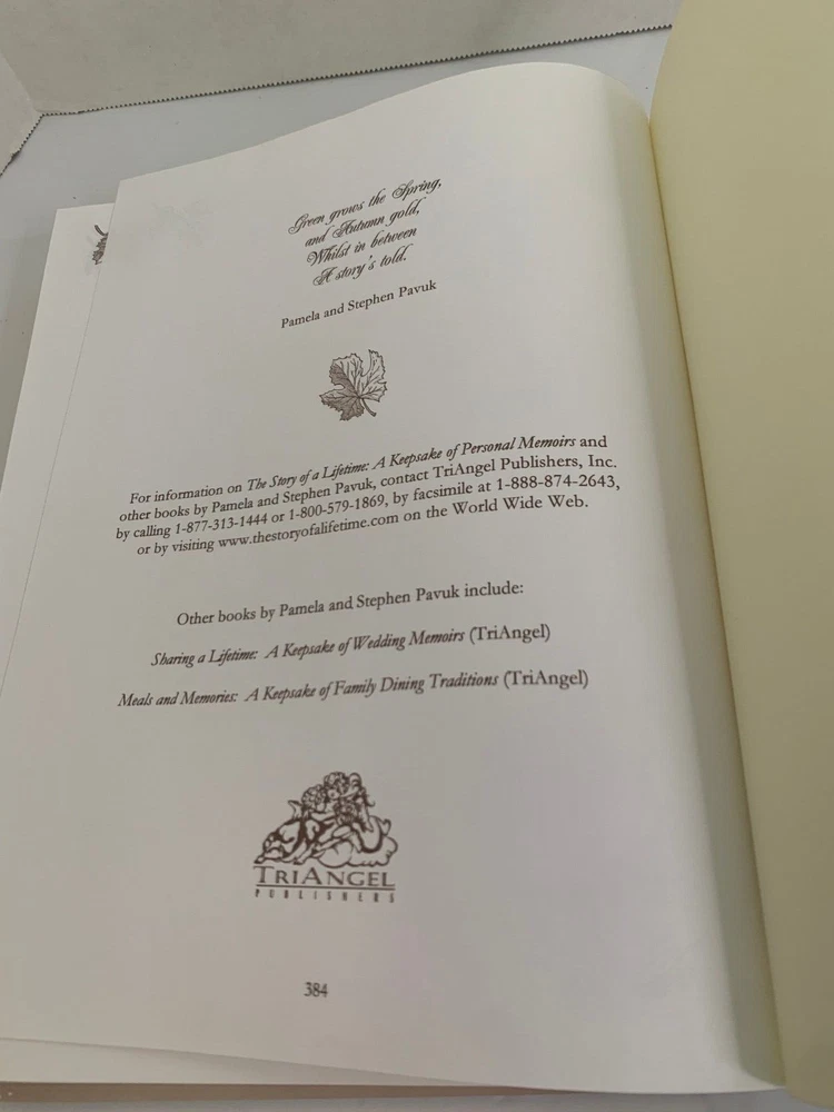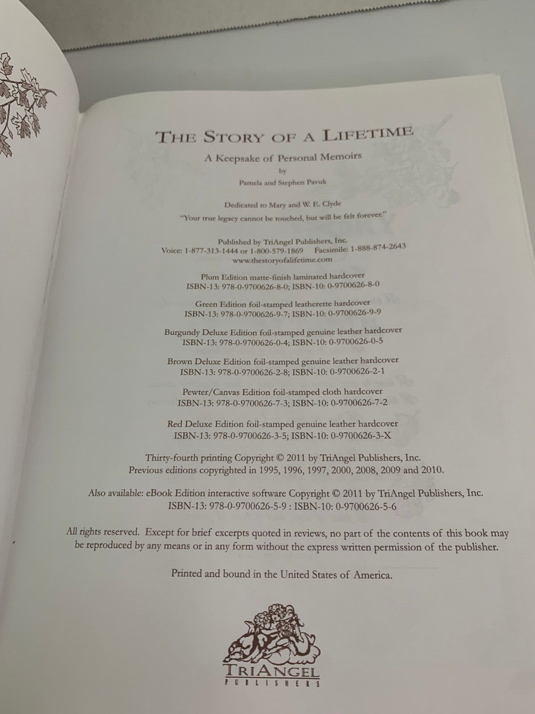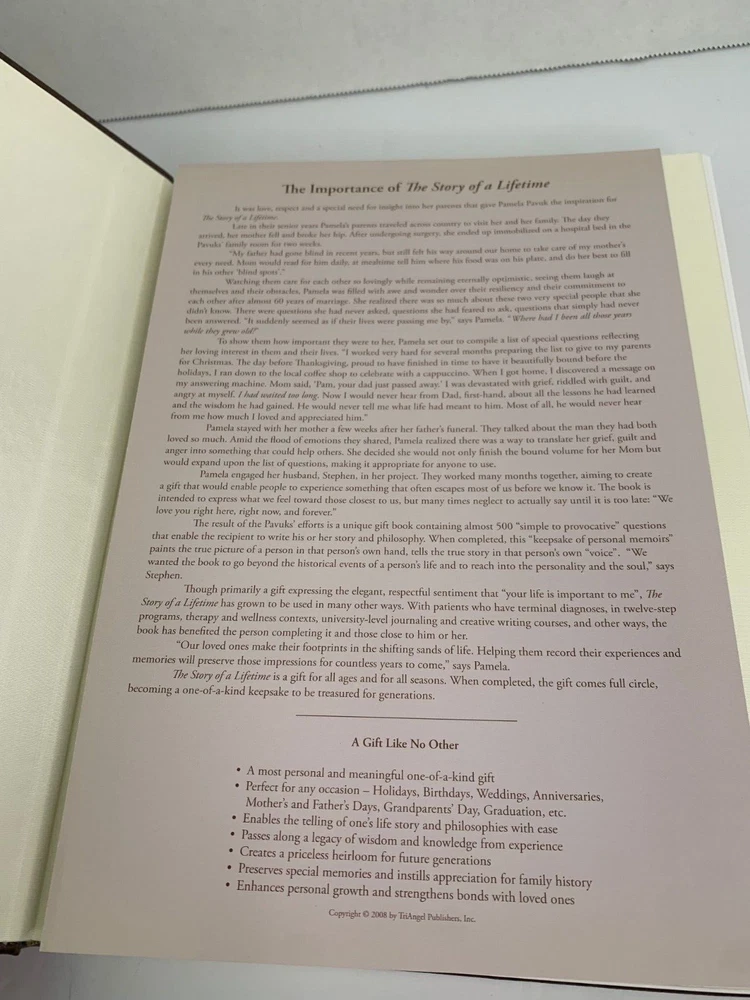 The Story of a Lifetime - A Keepsake of Personal Memoirs Brown Deluxe Edition 2011 9x11 by Pamela & Stephen Pavuk Published by TriAngel Publishers Inc Printed and bound in USA Brown leather cover with gold edged pages Beautiful journal to record all of your personal moments, and share with others. Features hundreds of gentle questions and inspiring quotes and illustrations. Includes Praise for The Story of a Lifetime card Has white ribbon bookmark Table of Contents Introduction Family Background Childhood Teen Years Higher Education Military Independence, Work & Career Love & Marriage Parenthood Middle Years Ethnic Heritage Regrets, Mistakes, Milestones and Turning Points Beliefs, Values, Lessons and Advice How Life Has Changed Now Favorites Special Questions Continuation Pages Family Tree Favorite Photographs and Mementos I offer combined shipping - please contact me before buying so I can adjust your invoice for all of your items Buy with confidence. I ship fast and offer no-hassle returns. Your overall satisfaction and positive feedback is extremely important to me. If there is any problem with your purchase, simply contact me and I will work with you to resolve the issue quickly. Thank you.