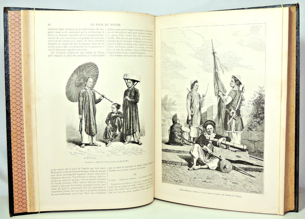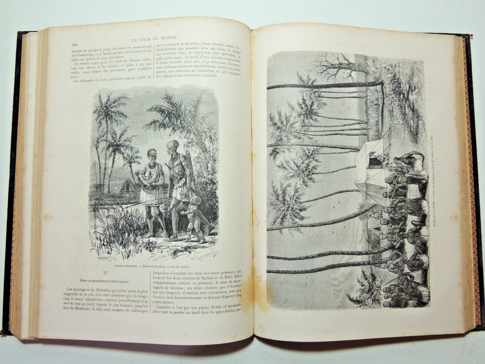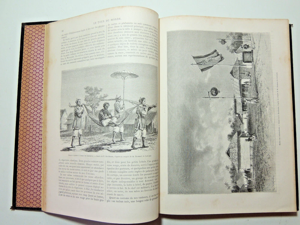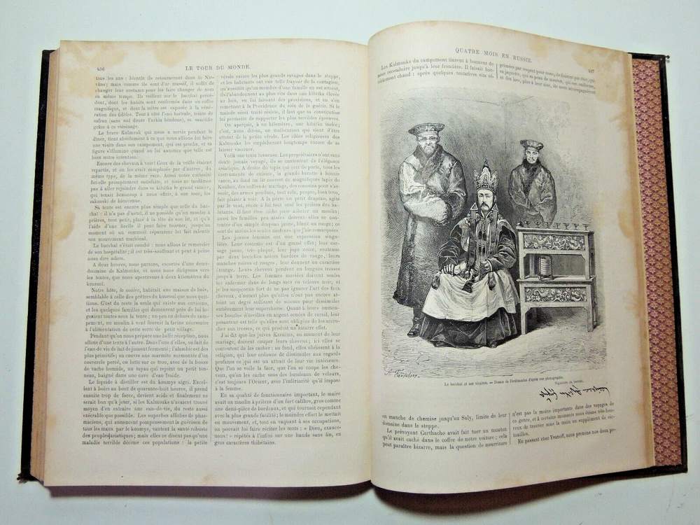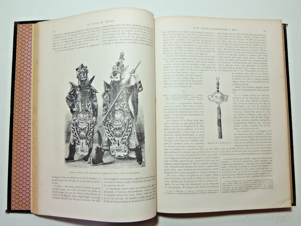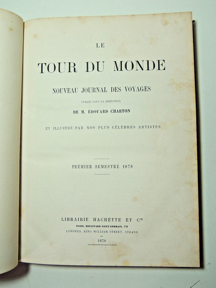 The Tour of the World, New Journal of Travels 1878. The description of this item has been automatically translated. If you have any questions, please feel free to contact us. LE TOUR DU MONDE, New Travel Journal 1878 (1st semester) published under the direction of Mr. Edouard Charton and illustrated by our most famous artists "Eight days of embassy in Hué (Kingdom of Annam), by Brossard de Corbigny, and "Excursion to Canada and the Red River of the North" by de Lamothe, "French scientific expedition to Peru and Bolivia" by Charles Wiener , "Memories of an English Embassy in Kashgar (Central Asia)", "Equinoxial America (Colombia, Ecuador, Peru)", "Journey to the Ouanika, on the Zanguebar coast", "Journey to Greece", Quatre month in Russia. Among the designers: Riou, Kauffmann, Weber, Lancelot, Thérond, Clerget, Sellier. volume in-4, bound 32x25cm, half leather, rubbing, text on 2 columns, some foxing, nice copy, approximately 400pp. Hatchet other volumes on sale, group purchases! LE TOUR DU MONDE, New Travel Journal 1878 (1st semester) published under the direction of Mr. Edouard Charton and illustrated by our most famous artists "Eight days of embassy in Hué (Kingdom of Annam), by Brossard de Corbigny, and "Excursion to Canada and the Red River of the North" by de Lamothe, "French scientific expedition to Peru and Bolivia" by Charles Wiener , "Memories of an English Embassy in Kashgar (Central Asia)", "Equinoxial America (Colombia, Ecuador, Peru)", "Journey to the Ouanika, on the Zanguebar coast", "Journey to Greece", Quatre month in Russia. Among the designers: Riou, Kauffmann, Weber, Lancelot, Thérond, Clerget, Sellier. volume in-4, bound 32x25cm, half leather, rubbing, text on 2 columns, some foxing, nice copy, approximately 400pp. other volumes on sale, group Auteur Edouard Charton Caractéristiques spéciales Illustré Reliure Cuir Langue Français Époque XIXème Sujet Voyages et exploration