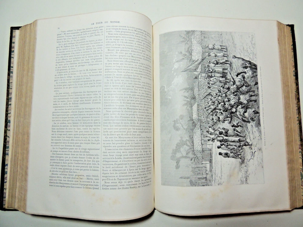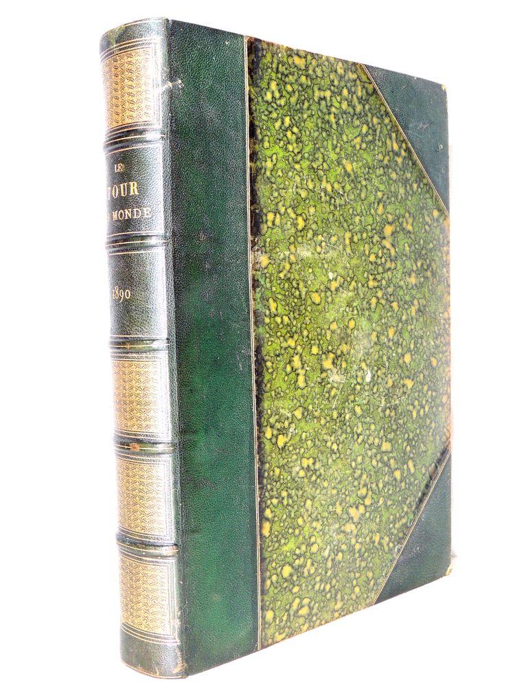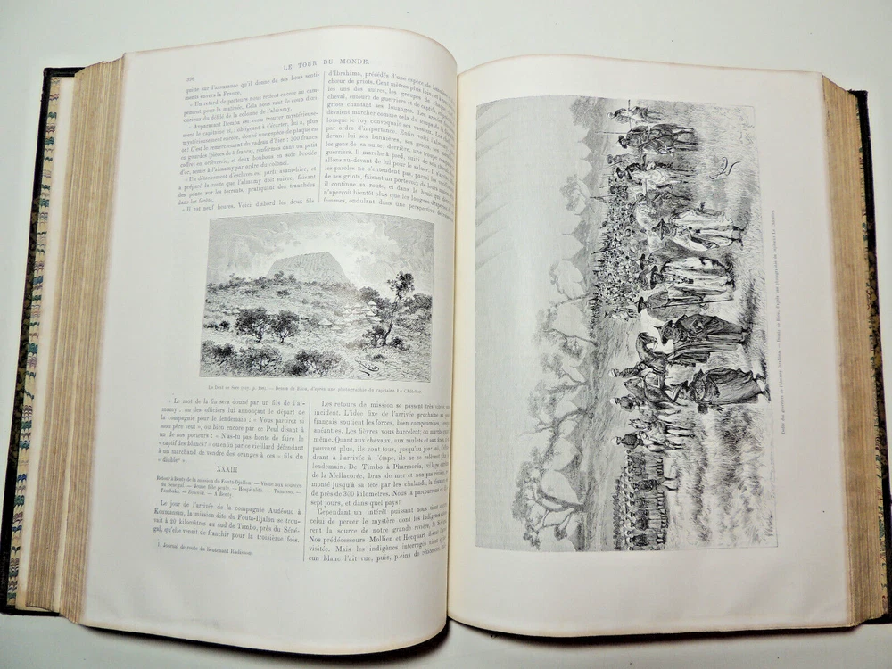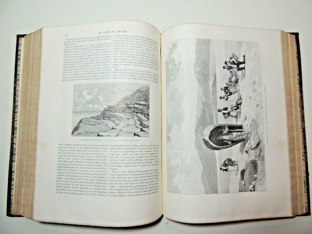 The World Tour. Travel Journal 1890 (complete) The description of this item has been automatically translated. If you have any questions, please feel free to contact us. Le Tour du Monde, new travel journal edited by Edouard Charton New series. 1890 Table (excerpts): Three months in Ireland by Miss Marie Anne de Bovet. Thirty months in Tonkin by Dr. Hocquard. Excursions in the mountains of Aragon and Catalonia by Albert Tissandier. Journey to the Boreal Chaco by A. Thouar. Mr. Edouard Charton. Journey to the Balearic Islands by Gaston Vuillier. Two campaigns in French Sudan by Lieutenant-Colonel Gallieni. Mission of Captain Péroz in Ouassoulou. Mission of Lieutenant Plat in Fouta-Djallon. Journey to the Fiji Islands by G. Verschuur --- Table Semester 2: In the darkness of Africa Research discovery and retreat of Emin Pasha by Henry M. STANLEY . Three months in Ireland by Miss Mayor Anne de Bovet. Travel to New Zealand by G. Verschuur. Thirty months in Tonkin by Dr. Hocquard. An excursion to the Grönland Jakobshaw Glacier by Charles Rabot. From Koutei to Bandjirmasin Journey through Borneo by Carl Bock. The "French Shore" Memories of the Newfoundland countryside by L. Koenig. The chasm of the Puits de Padirac by E.-A. Martel. Complete volume 2 semesters, 32 x 24 cm. very richly illustrated with more than 500 partially full-page engravings, 436 + 436pp, fresh interior, beautiful copy. 3kg. Paris, Hachette 1890 Table (excerpts): Three months in Ireland by Miss Marie Anne de Bovet. Thirty months in Tonkin by Dr. Hocquard. Excursions in the mountains of Aragon and Catalonia by Albert Tissandier. Journey to the Boreal Chaco by A. Thouar. Mr. Edouard Charton. Journey to the Balearic Islands by Gaston Vuillier. Two campaigns in French Sudan by Lieutenant-Colonel Gallieni. Mission of Captain Péroz in Ouassoulou. Mission of Lieutenant Plat in Fouta-Djallon. Journey to the Fiji Islands by G. Verschuur --- Table Semester 2: In the darkness of Africa Research discovery and retreat of Emin Pasha by Henry M. STANLEY . Three months in Ireland by Miss Mayor Anne de Bovet. Travel to New Zealand by G. Verschuur. Thirty months in Tonkin by Dr. Hocquard. An excursion to the Grönland Jakobshaw Glacier by Charles Ra Caractéristiques spéciales Édition de luxe Date de publication 1890 Reliure Cuir Langue Français Époque XIXème Nom Voyage Sujet Voyages et exploration