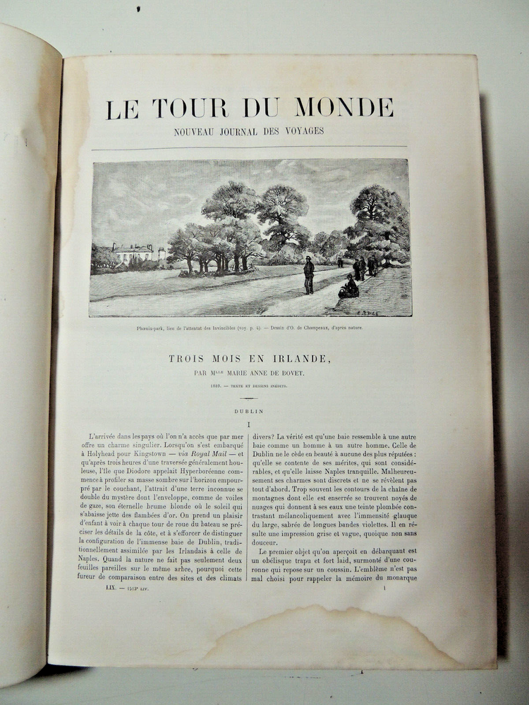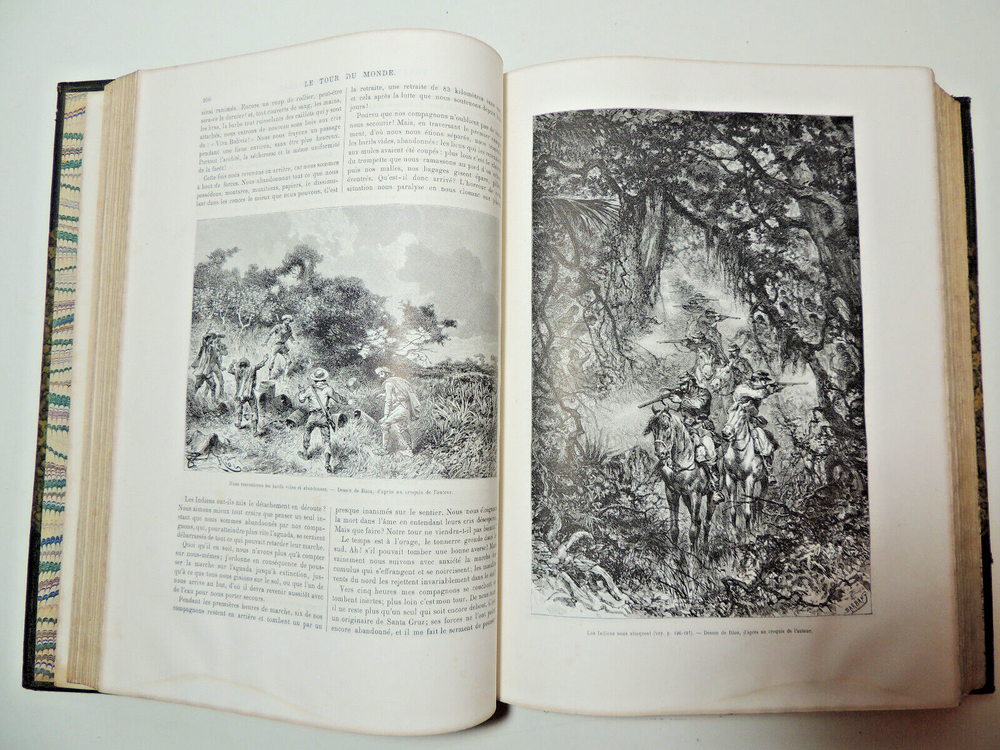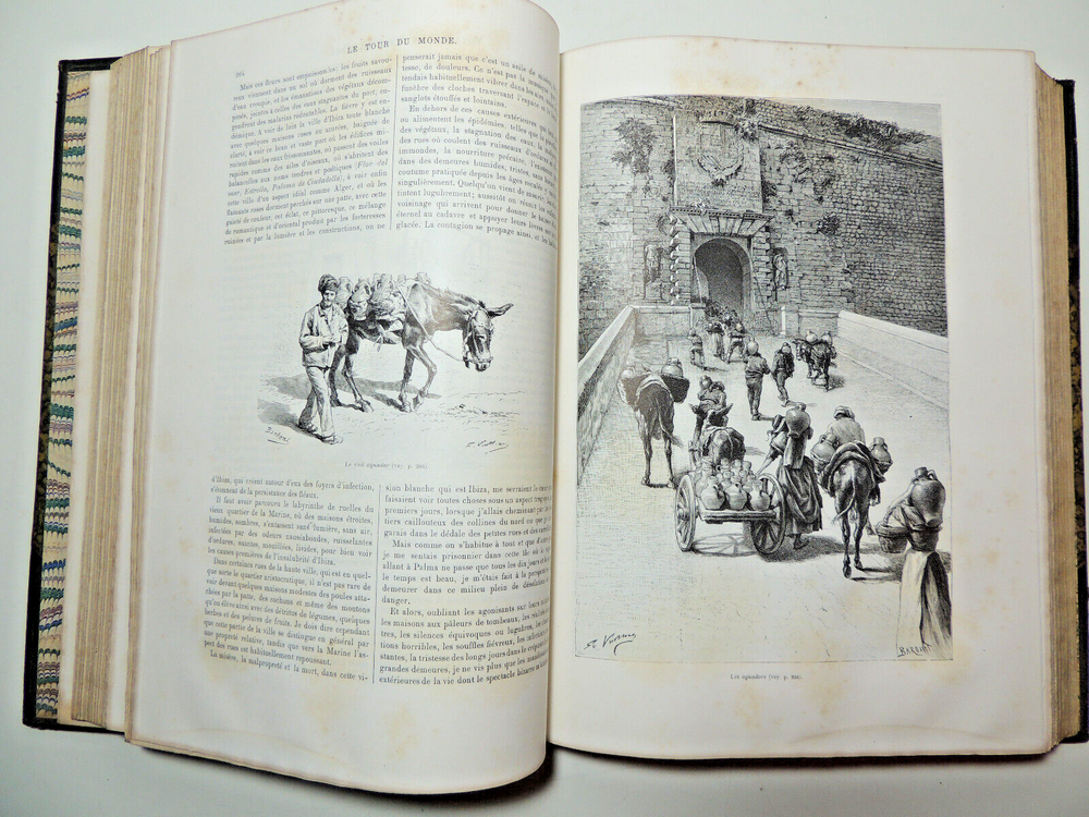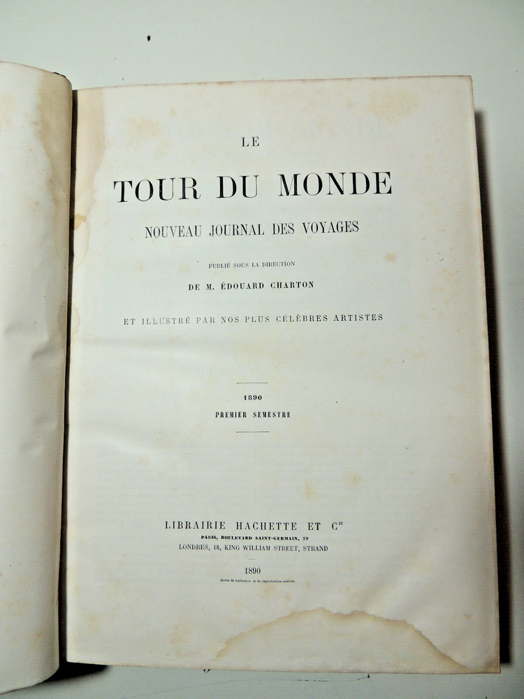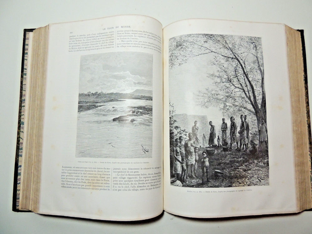 The World Tour. Travel Journal 1890 (complete) The description of this item has been automatically translated. If you have any questions, please feel free to contact us. Le Tour du Monde, new travel journal edited by Edouard Charton New series. 1890 Table (excerpts): Three months in Ireland by Miss Marie Anne de Bovet. Thirty months in Tonkin by Dr. Hocquard. Excursions in the mountains of Aragon and Catalonia by Albert Tissandier. Journey to the Boreal Chaco by A. Thouar. Mr. Edouard Charton. Journey to the Balearic Islands by Gaston Vuillier. Two campaigns in French Sudan by Lieutenant-Colonel Gallieni. Mission of Captain Péroz in Ouassoulou. Mission of Lieutenant Plat in Fouta-Djallon. Journey to the Fiji Islands by G. Verschuur --- Table Semester 2: In the darkness of Africa Research discovery and retreat of Emin Pasha by Henry M. STANLEY . Three months in Ireland by Miss Mayor Anne de Bovet. Travel to New Zealand by G. Verschuur. Thirty months in Tonkin by Dr. Hocquard. An excursion to the Grönland Jakobshaw Glacier by Charles Rabot. From Koutei to Bandjirmasin Journey through Borneo by Carl Bock. The "French Shore" Memories of the Newfoundland countryside by L. Koenig. The chasm of the Puits de Padirac by E.-A. Martel. Complete volume 2 semesters, 32 x 24 cm. very richly illustrated with more than 500 partially full-page engravings, 436 + 436pp, fresh interior, beautiful copy. 3kg. Paris, Hachette 1890 Table (excerpts): Three months in Ireland by Miss Marie Anne de Bovet. Thirty months in Tonkin by Dr. Hocquard. Excursions in the mountains of Aragon and Catalonia by Albert Tissandier. Journey to the Boreal Chaco by A. Thouar. Mr. Edouard Charton. Journey to the Balearic Islands by Gaston Vuillier. Two campaigns in French Sudan by Lieutenant-Colonel Gallieni. Mission of Captain Péroz in Ouassoulou. Mission of Lieutenant Plat in Fouta-Djallon. Journey to the Fiji Islands by G. Verschuur --- Table Semester 2: In the darkness of Africa Research discovery and retreat of Emin Pasha by Henry M. STANLEY . Three months in Ireland by Miss Mayor Anne de Bovet. Travel to New Zealand by G. Verschuur. Thirty months in Tonkin by Dr. Hocquard. An excursion to the Grönland Jakobshaw Glacier by Charles Ra Caractéristiques spéciales Édition de luxe Date de publication 1890 Reliure Cuir Langue Français Époque XIXème Nom Voyage Sujet Voyages et exploration