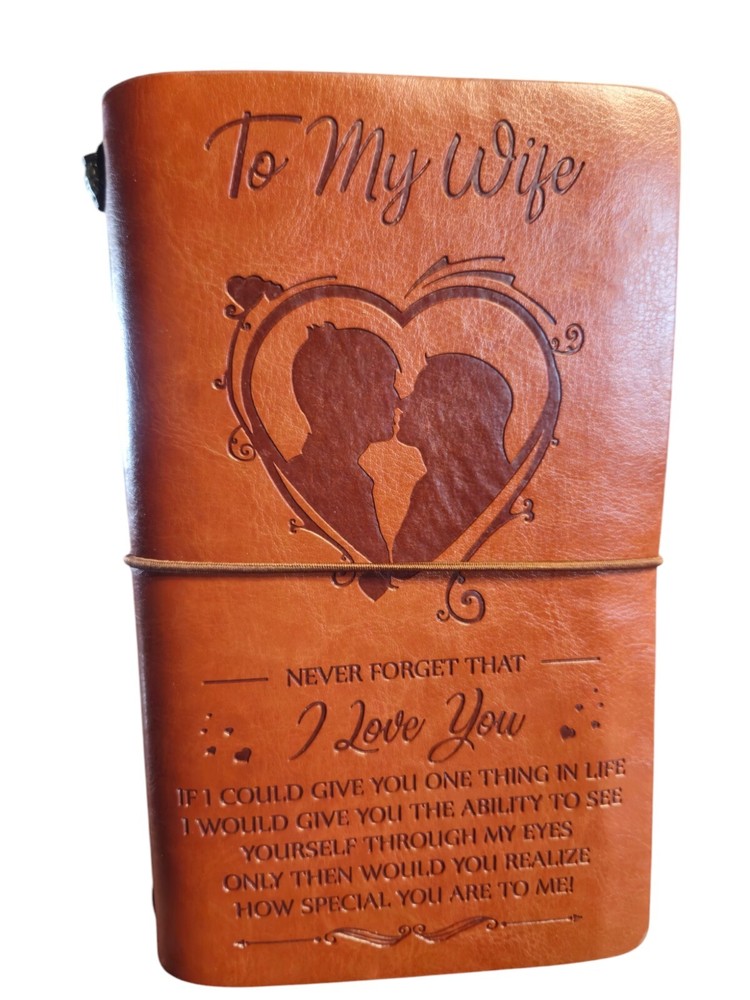 This would make a great gift for a wife from Husband on her Birthday Mothers Day Christmas or Just because she needs to know you Love her! It says... To My Wife Never forget that I Love You If I could give you one thing in life I would give you the ability to see yourself through my eyes only then would you realize how special you are to me! ❤️❤️❤️Two pages were written on with personal items so they were removed. Otherwise in good condition.See all photos of this beauticul item and sentiment. The product is a leather journal notebook designed for a wife, featuring a credit card and coupon holder. Measuring 8 inches by 4.75 inches, it is a thoughtful gift idea for mothers. The leather cover provides a durable and stylish exterior for the journal, making it suitable for daily use or as a special keepsake.