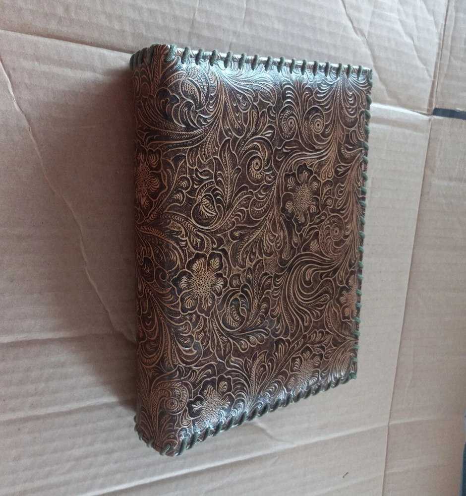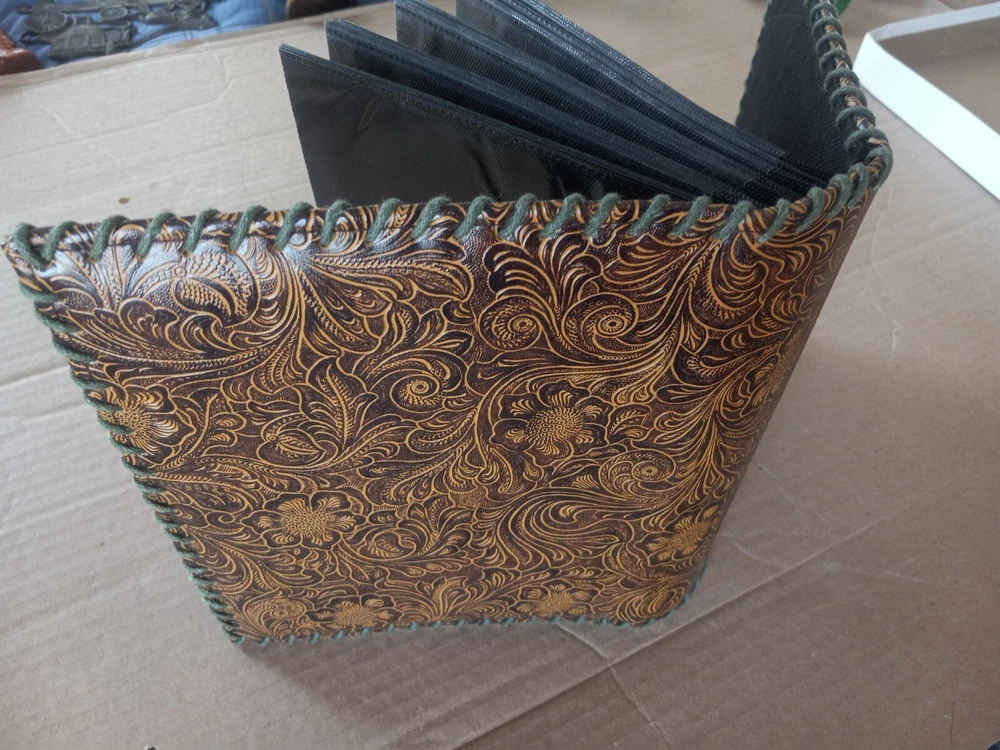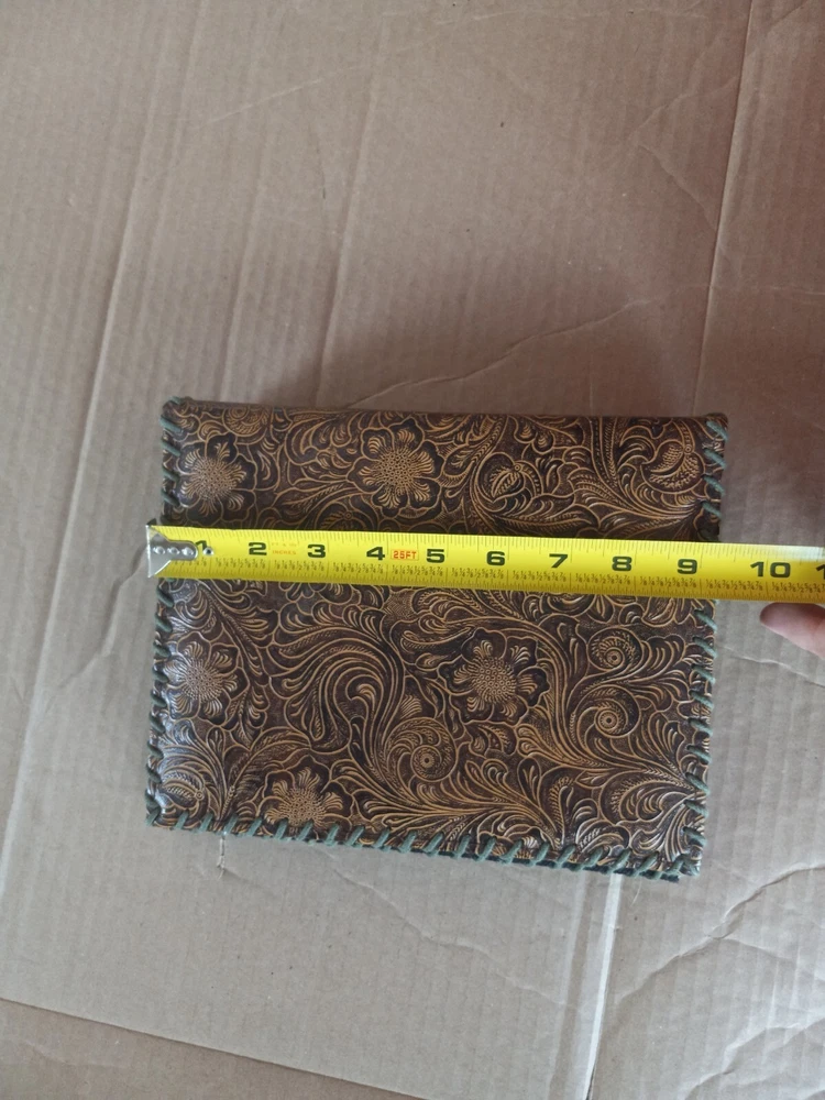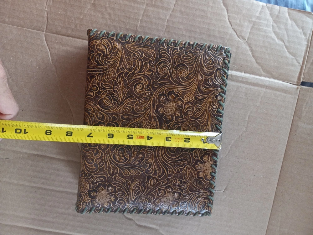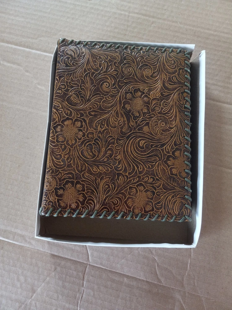 Keep your precious memories safe and organized with this beautiful Tooled Leather 52 Page Photo Album. Designed for 4x6 inch photos, this book bound album features a stunning floral theme on a brown leather cover. It's the perfect way to showcase your favorite photos and cherish them for years to come. The album can hold a maximum photo size of 4x6 and comes in a slip-in style for easy use. Crafted with high-quality leather, this album adds a touch of elegance to your photo collection. It's an ideal gift for anyone who loves to keep their memories close at hand. Whether you want to preserve family moments, travel memories or any special occasion, this photo album makes the perfect choice. No top to the box pictured. No information about brand or manufacturer