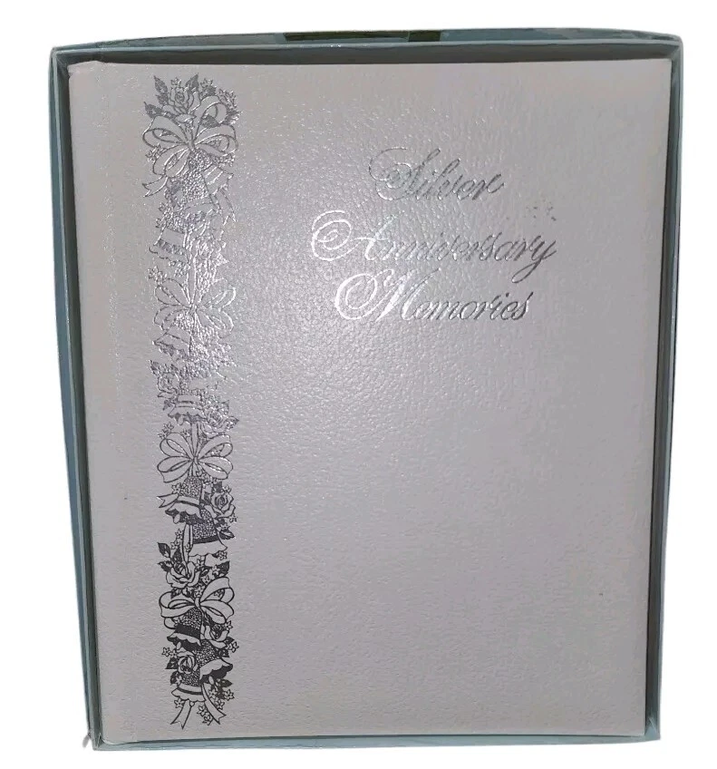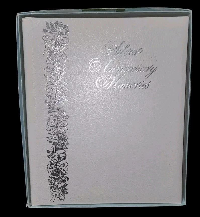 This vintage 1987 memory book by Treasured Memory Books is the perfect addition to your collection. With a silver anniversary theme, it's a great way to preserve your special memories. The book is bound in faux leather with metallic silver writing on the cover, giving it a unique and timeless look. It has pages to record all your special memories, EVENTS OF THE DAY, GUEST PAGES, DECORATIONS, MENU, MESSAGES RECIEVED, PHOTO PAGES AND MORE. You can store up to 8x10in. photos in this album, which is perfect for the 25th or Silver Wedding Anniversary. The book is 1980s, giving it the authentic vintage vibe, making it a great addition to your home decor. This memory book is a great gift for anyone who loves to preserve their memories in a stylish and timeless way. It has never been used and sill has the original box, although the box shows some wear, it has kept the album nice and safe.