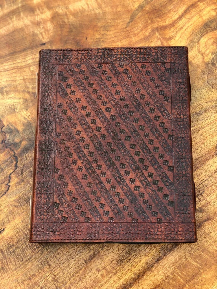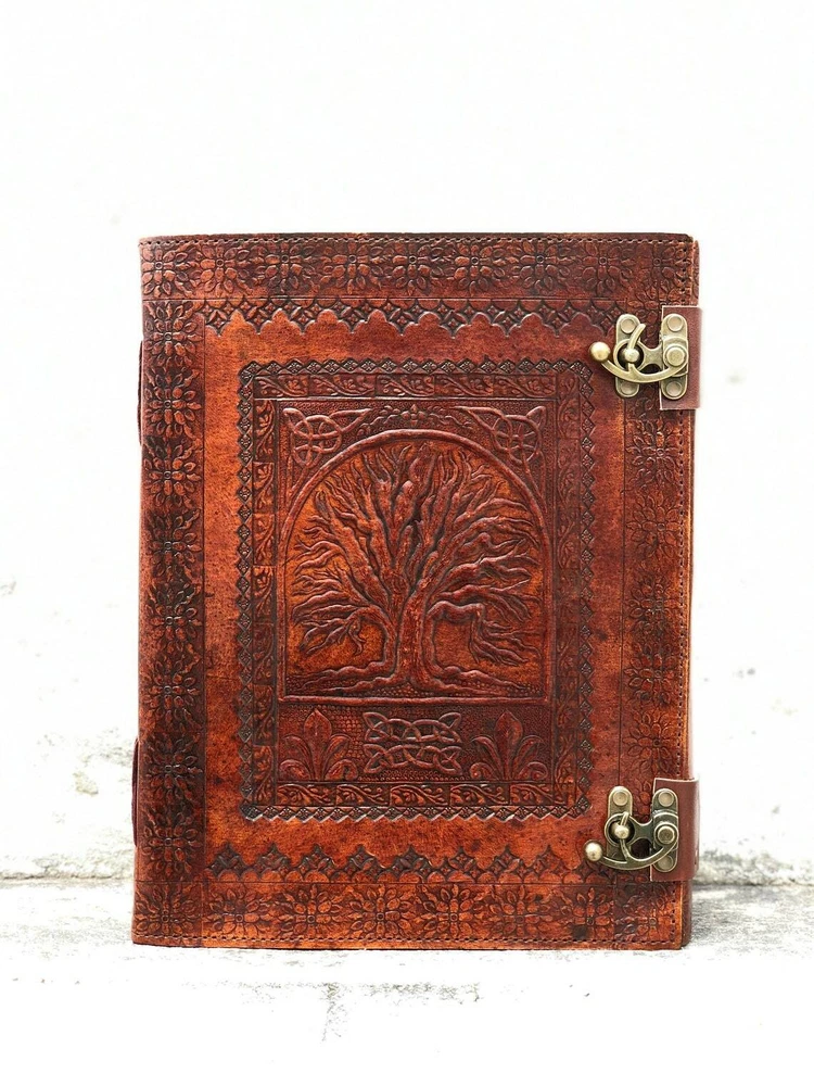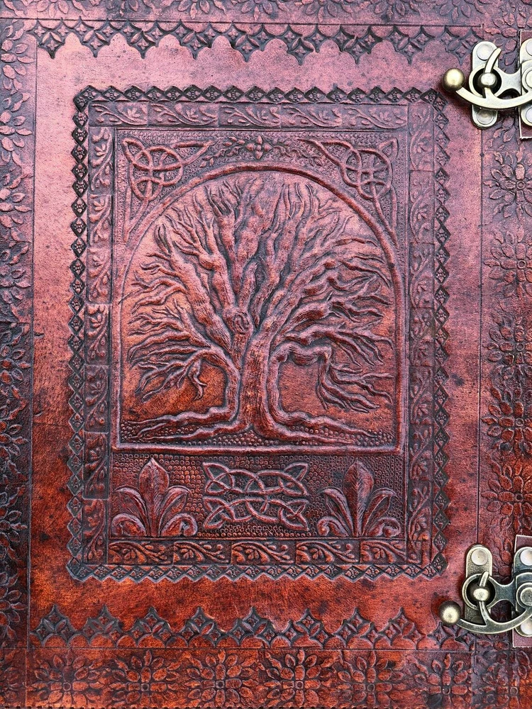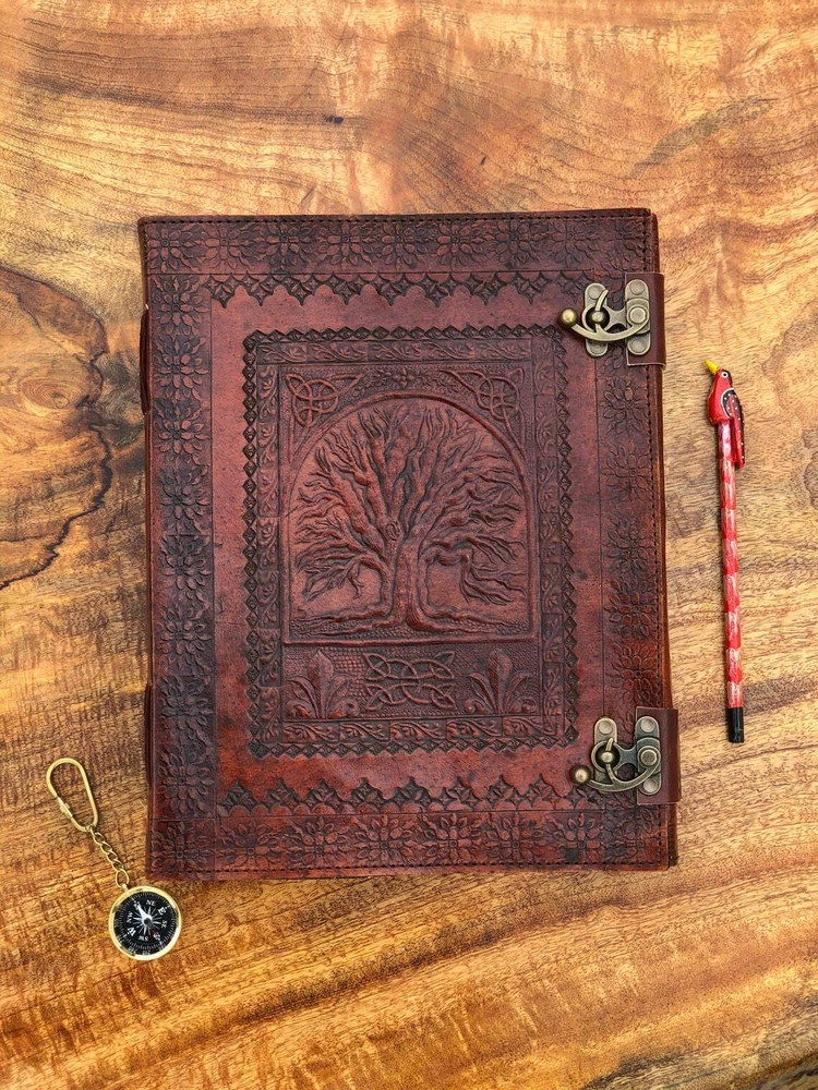 Tree of life, Leather journal ,vintage journal , book of shadow , leather sketchbook , bound journal , witches journal , Handmade paper , antique books , sketchbook grimoire Our beautifully embossed tree of life leather journal is ideal for the passionate writer in your life, give them an inspirational gift they will cherish. Handmade, eco-friendly and Fair Trade, this leather journal is the perfect way to note down all of your thoughts and it also makes a positive difference to the communities who make them. Symbolizing a fresh start, positive energy and good health as well as a connection to nature, the tree of life journal is ideal for the more spiritual person in your life and could make a really special gift. Beautifully Handcrafted Design: Tree of Life (Front Cover), Diagonal Floral and Geometric Design(Back Cover) Journal Size: 13” x 10 inches Pages: 400 Pages (Counting Both Sides)