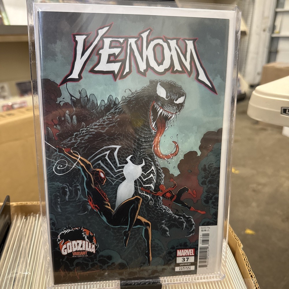 The product is a single issue comic book titled "VENOM #37" by Marvel Comics, featuring a Godzilla variant cover by artist Dave Wachter. The comic is part of the Venom series within the Marvel Universe and includes characters like Venom (Future Dylan Brock), Doctor Strange, Godzilla, and Spider-Man. Set for publication in 2024, this comic book falls under the genres of action, superheroes, adventure, drama, fantasy, and fiction, making it an exciting and highly sought-after collectible for fans of Marvel Comics and the Venom character. Bagged and boarded and shipped securely in a Gemini Mailer.
