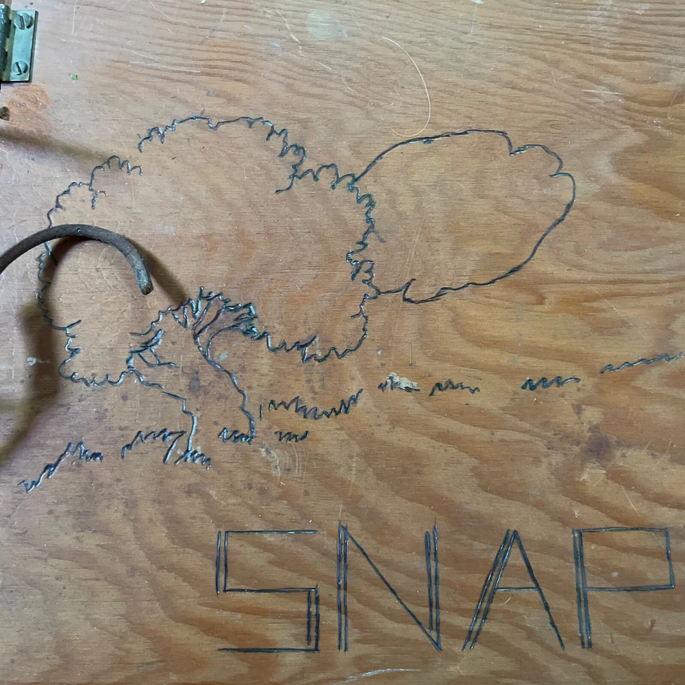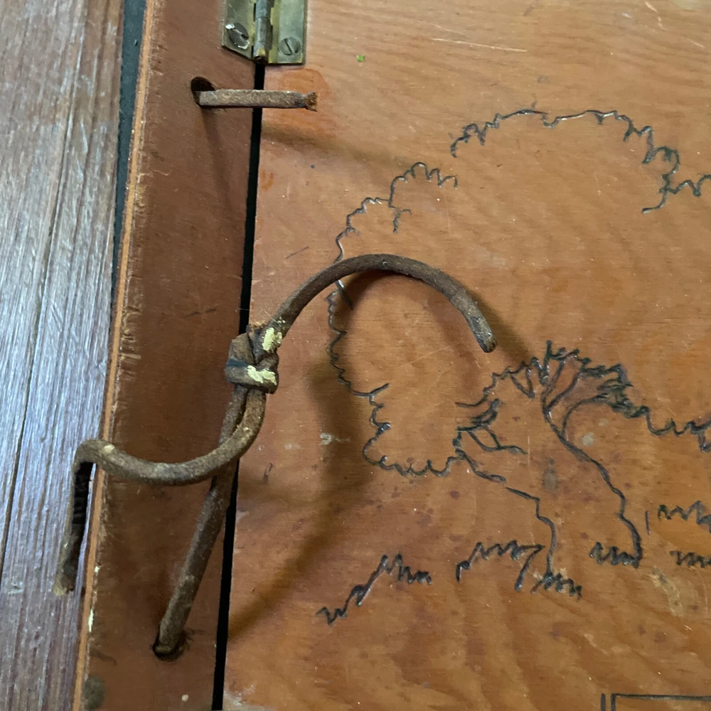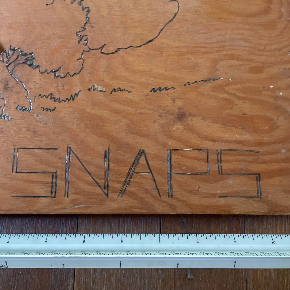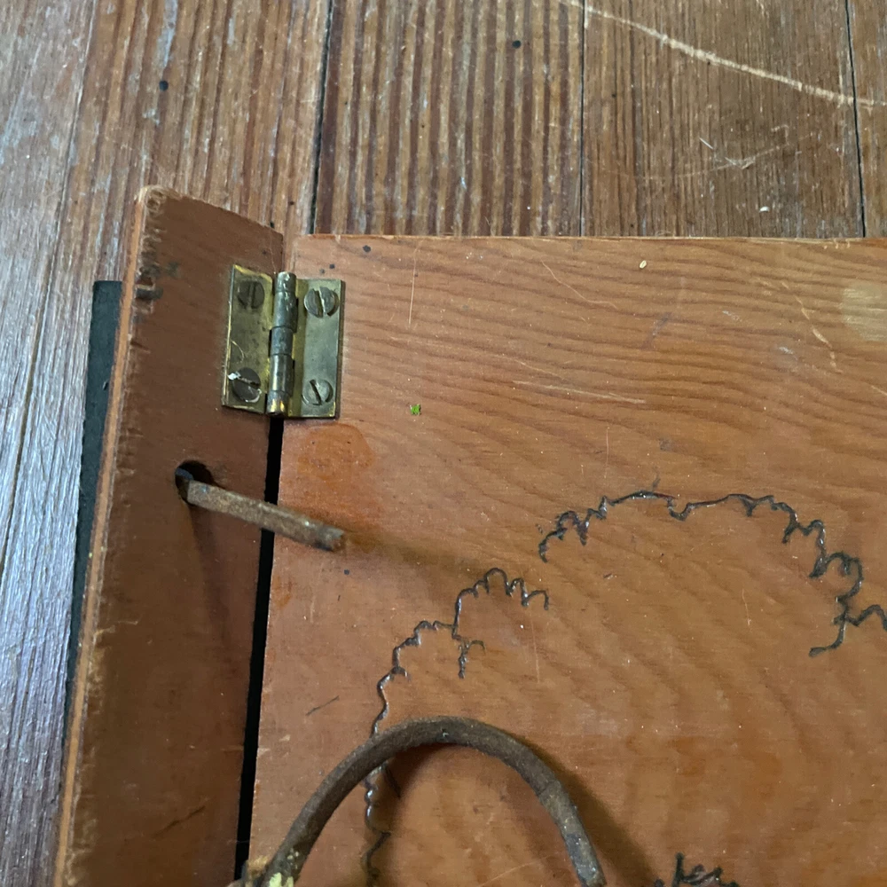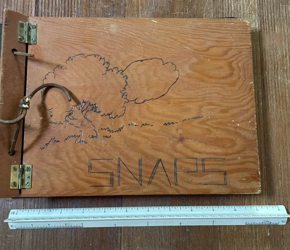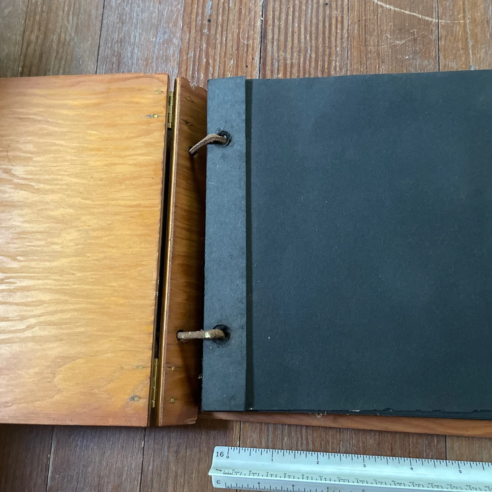 VINTAGE Handmade Wooden Photo Album - SNAPS Metal Hinges Damaged Leather Cord. Calling this new because pages are clean. Measures about 11 x 8. Leather cord has “snapped”. Guessing that spot on back is dried paint? Design on front feels unfinished.