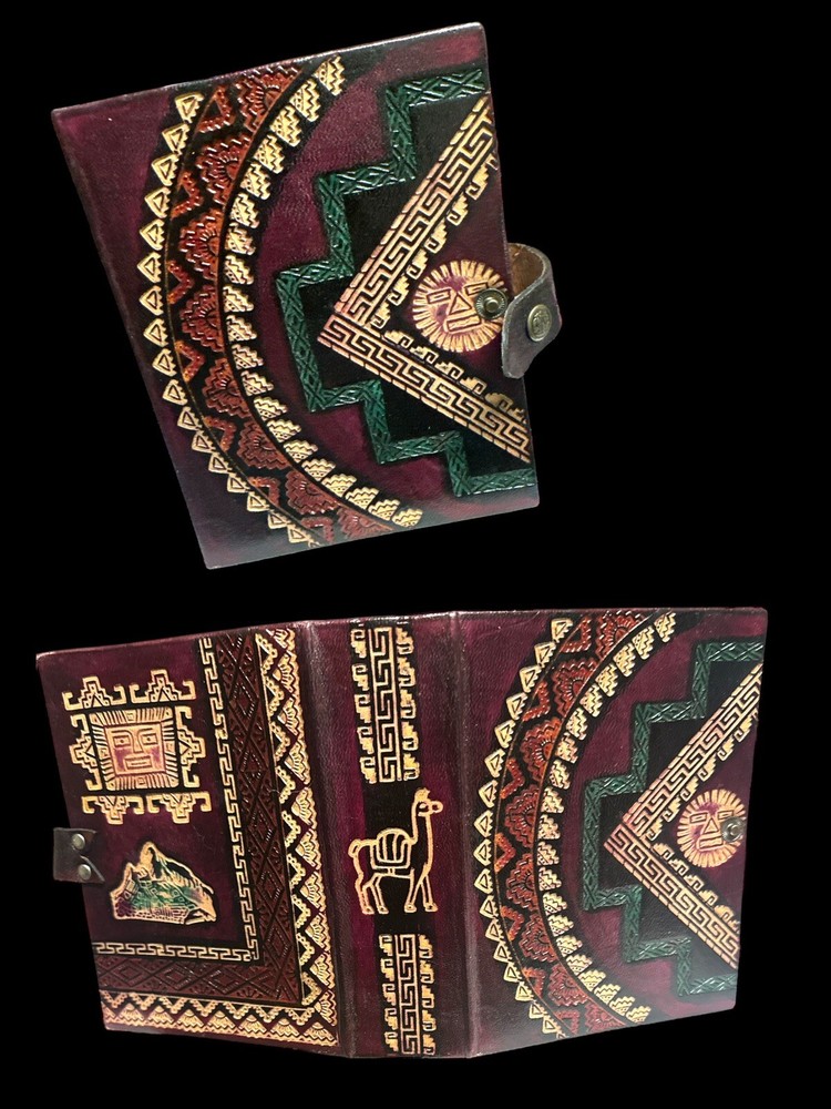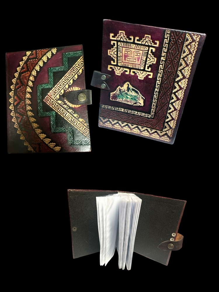 Beautiful Vintage Leather South American Photo Album with 100 4.5 x 6 photo slips. Front & back display intricate South American designs, including a camel on the spine of the album. Dark brown, with tan and green colored designs. Has leather strap snap button closure and woven felt inner lining. Perfect for storing and showcasing family photos, especially those from a South American vacation. Album is in good preowned condition with no visible signs of defect or extensive wear.