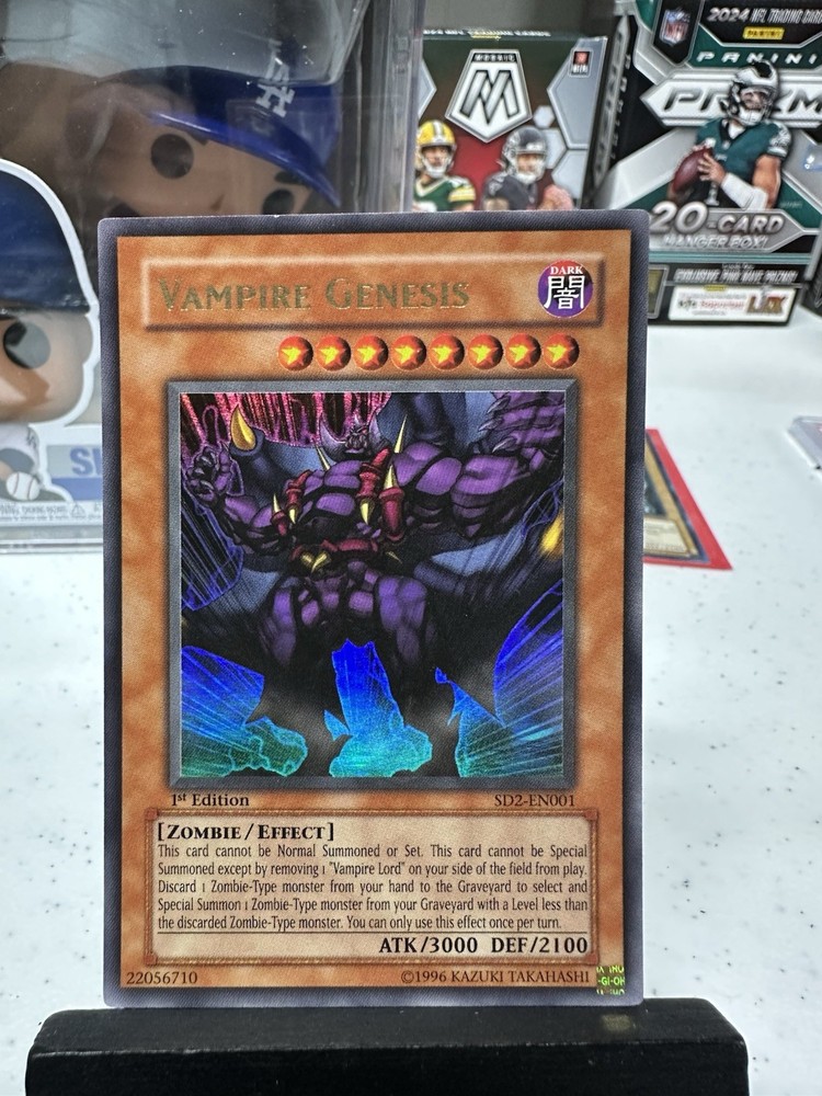 The Vampire Genesis SD2-EN001 Structure Deck: Zombie Madness-1st Edition is a highly sought after collectible card game item in the Yu-Gi-Oh! TCG. This ultra rare card features a dark attribute, with a high defense and attack power of 2100 and 3000 respectively. Manufactured by Konami, this 1st edition card is in English language and belongs to the Zombie creature type. Perfect for collectors and players alike, this effect card is a valuable addition to any card collection.