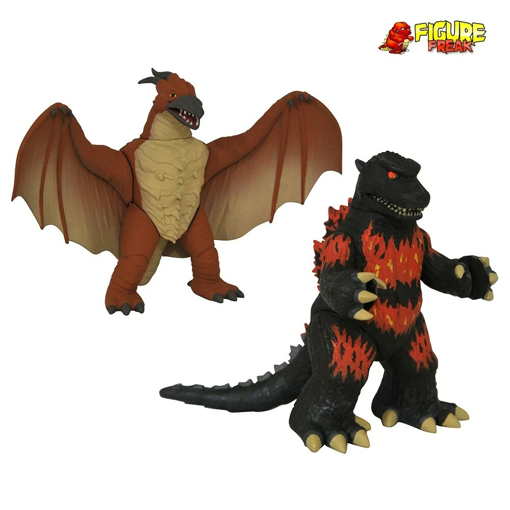 Vinimates Godzilla 2-Pack 1995 Burning Godzilla & Rodan Vinyl Figures Item Description A Diamond Select Toys release! It's the return of Godzilla! The popular Godzilla Vinimates 4-inch vinyl figures are back in a series of two-packs, pairing past with present, and pitting enemies against each other! Godzilla 1954 meets his future counterpart, Godzilla 1999! Godzilla 1962 faces off with Mechagodzilla! Burning Godzilla 1995 teams up with Rodan! Each 4 inch figure features an articulated neck, and comes packaged in a full-color window box built for two! Designed by Barry Bradfield! Be assured that all items we carry are in new, unopened boxes, and are collector-grade. Our Vinimates come to you directly out of factory cases. We do not sell new items that have crushed blisters, dented corners, or nasty creases. All items are packed safely in styrofoam or tissue paper, and shipped in brand new cardboard boxes. Minimates Menagerie at Figure Freak Figure Freak has the worlds best Minimates selection! We buy factory cases direct from the manufacturer and our Minimates Menagerie label has been the leading Minimates storefront on earth since 2007. We try our best to offer nearly every Minimate ever produced. With thousands of characters to choose from, our selection cannot be beat! Check back regularly to find the coolest 2-inch Minimates versions of your favorite and beloved characters from over 100 different licenses such as Marvel, Disney, Aliens, Predator, Lord of the Rings, DC, Ghostbusters, Muppets, Nightmare Before Christmas, Beetlejuice, SpongeBob Squarepants, Walking Dead, Teenage Mutant Ninja Turtles, Star Trek, Battlestar Galactica, Terminator and many more!!! Find the perfect figure for your desktop or dashboard! Payments We use Paypal as our preferred method of payment. All payments must be received within 3 days of purchase. Due to our heavy volume and busy shipping department, we must cancel any unpaid orders after 3 days of non-payment and return the merchandise to inventory. FREE Domestic (US) Shipping on ALL Vinimates Vinyl figures Domestic Shipping is always FREE for all US customers !!! Your Vinimates will ship in crisp new cardboard boxes with styrofoam peanuts and/or air bags to protect them during shipping. International Shipping We use boxed USPS First Class Mail for all International orders. We ship to ANY country. Your Vinimates will be shipped in crisp new cardboard boxes with styrofoam peanuts and/or air bags to protect them during shipping. We do NOT charge handling fees... you pay the exact cost of shipping your item, but we ask that you please request a combined shipping invoice when purchasing multiple items. This will allow us to weigh your package and assign an accurate shipping total to your order.