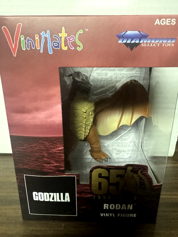 The Vinimates Diamond Select Godzilla 65th Anniversary 2019 Rodan Vinyl Figure is a collectible toy featuring Rodan, a famous monster from the Godzilla franchise, released in 2019 to celebrate the 65th anniversary of Godzilla. This vinyl figure is part of the Vinimates brand and is designed in a stylized form, making it a unique addition to any Godzilla or monster enthusiast's collection. The figure captures the essence of Rodan in a new and exciting way, appealing to fans of the iconic creature and the Godzilla series. New