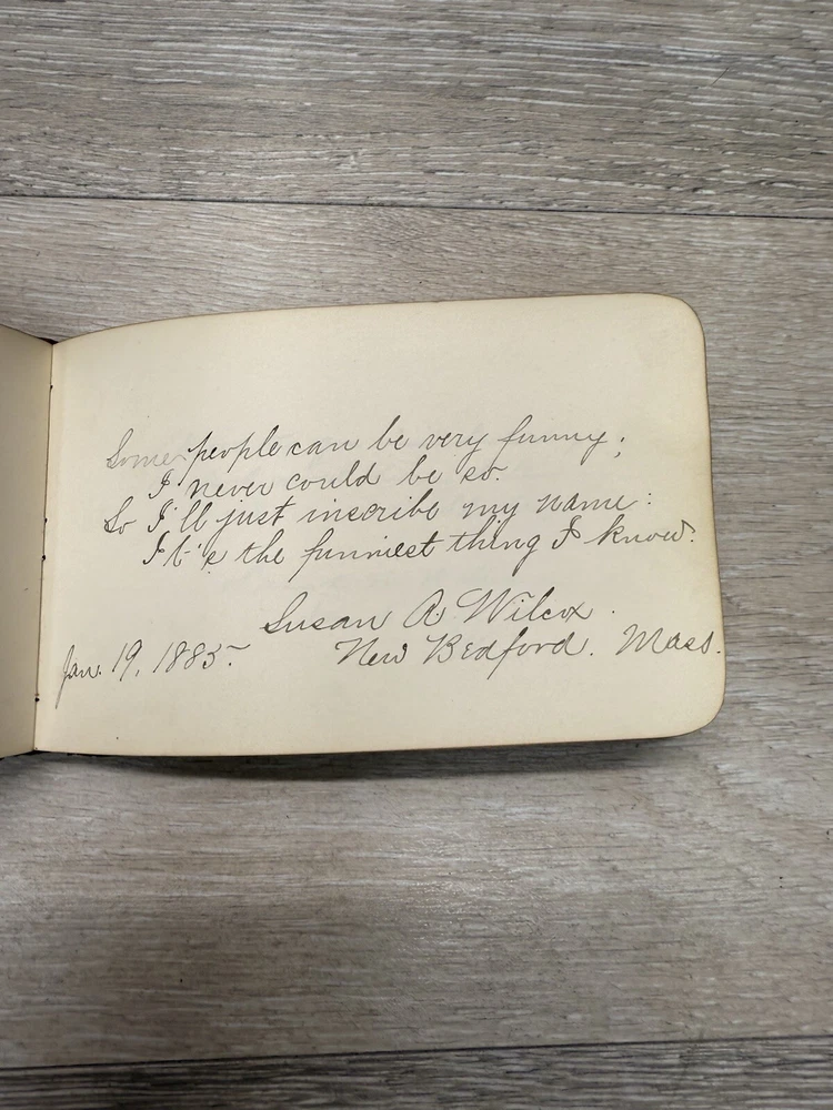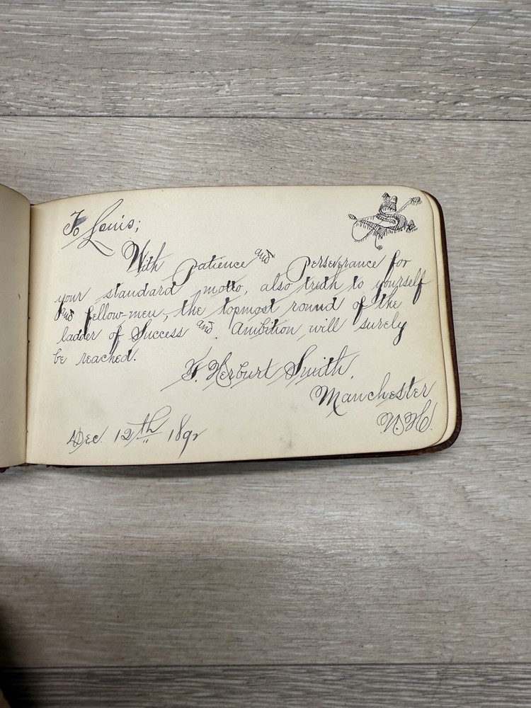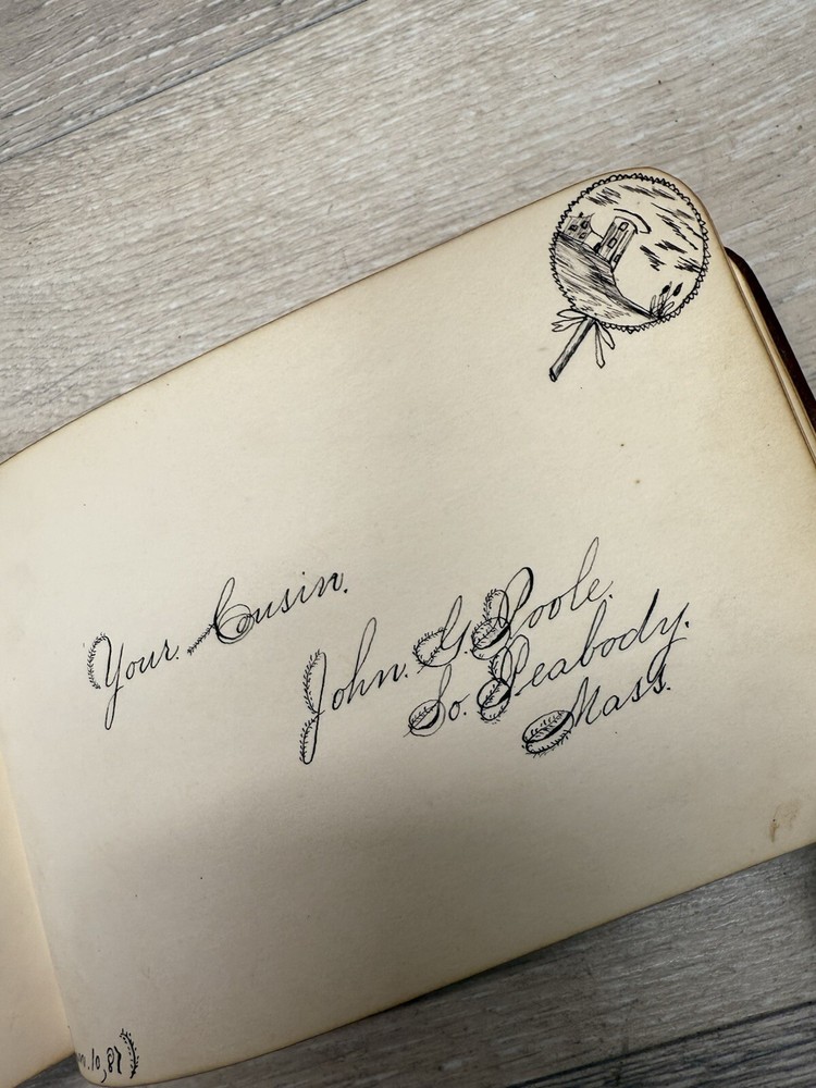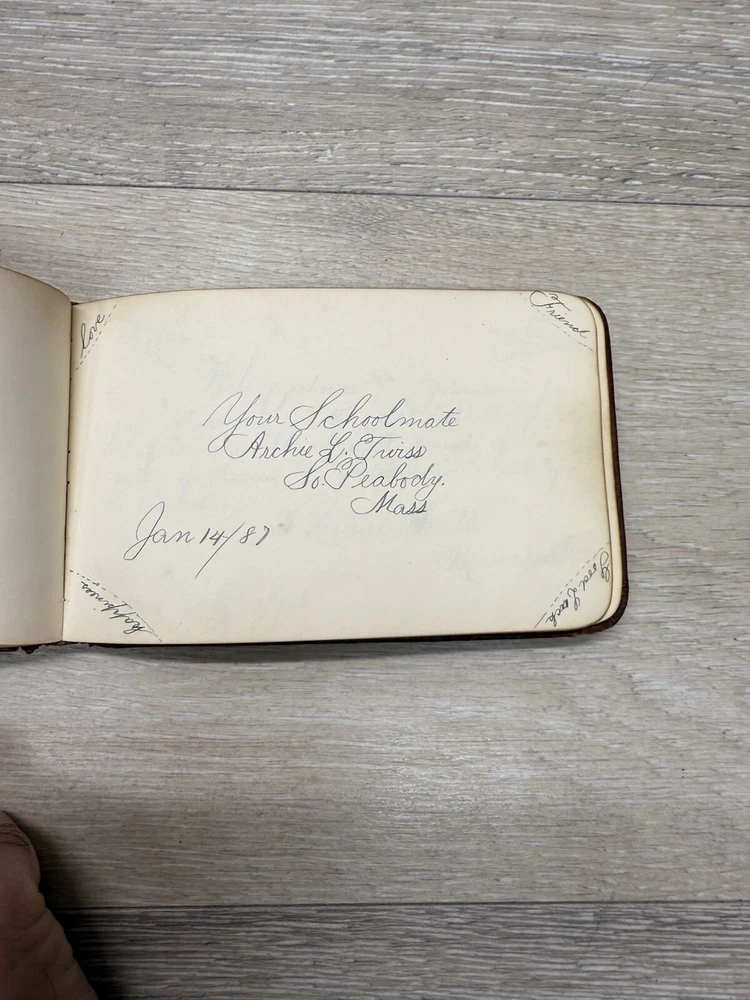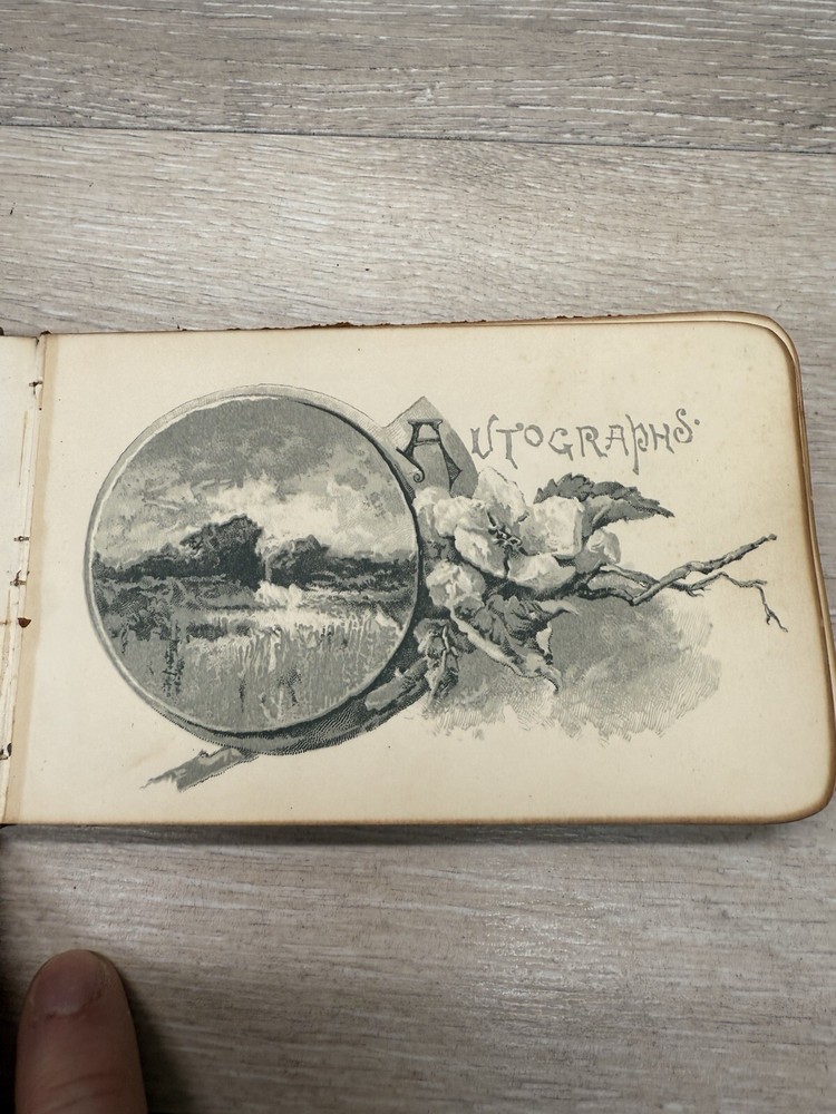 Seems to be a student signature collection autograph book from fellow students and family member members. Dated between 1885 and 1898. Includes poetry, hand, drawn, pictures , glimpse into life of the late 1800s through the eyes of a student.