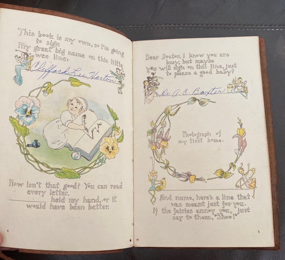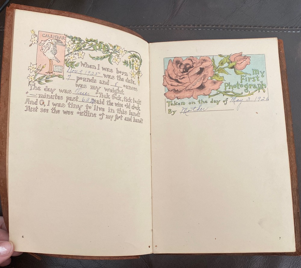 This is a preowned Vintage 1920’s The Book of Baby Mine with a fragile Brown Leather Cover Illustrated to commemorate Milestones. Baby was born 1925 and pg 51 has prefilled 192xx for date of ad. Partially filled out for this child. Being sold as is as pictured no returns.