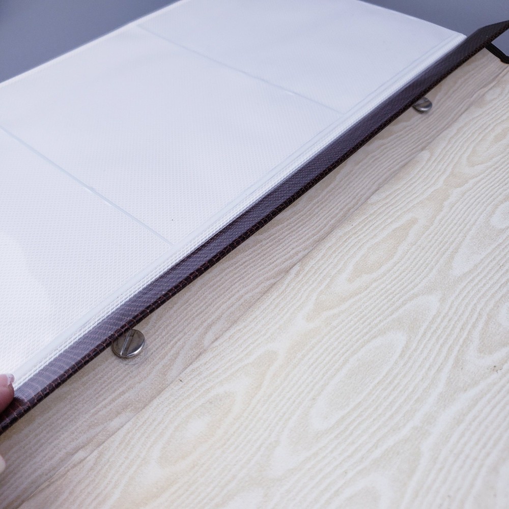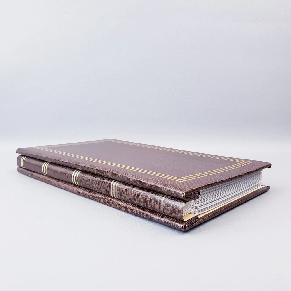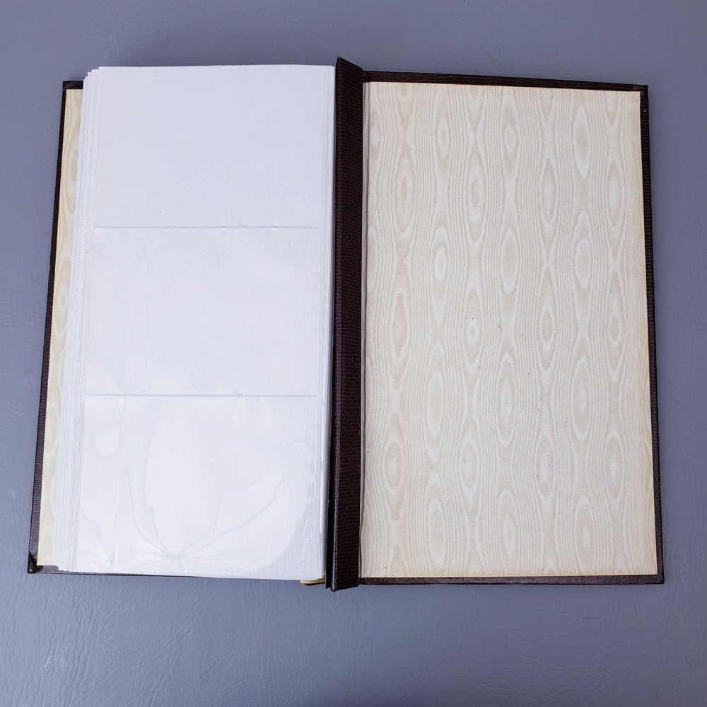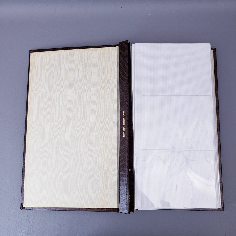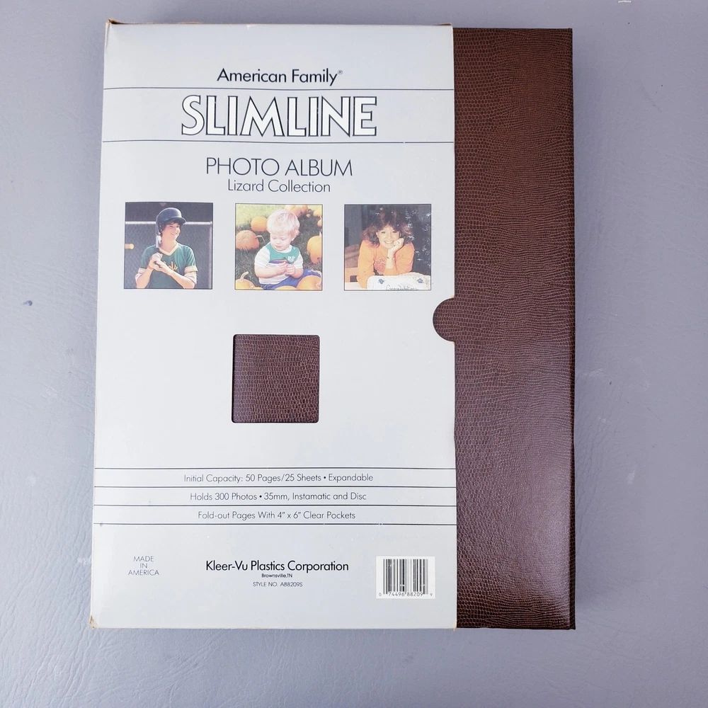 Vintage 1980s American Family Slimline Flip Memory Library Photo Album 4"x6" Unused pre-owned condition with original outer sleeve which shows signs of wear. Please see the listing photos. "Lizard Collection" Brown faux leather Measures approximately 14"x8"x2" Holds 300 Photos. Fold Out Pages with 4"x6" clear pages. Thank you for looking!