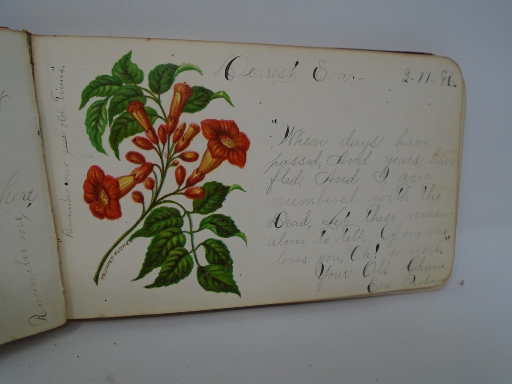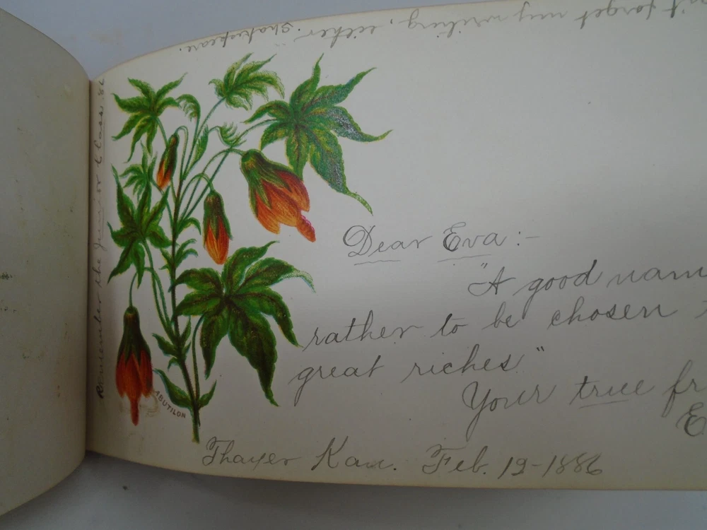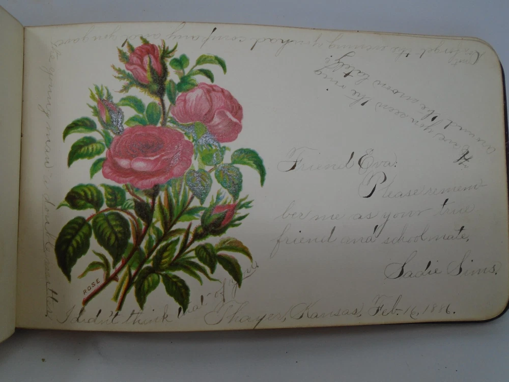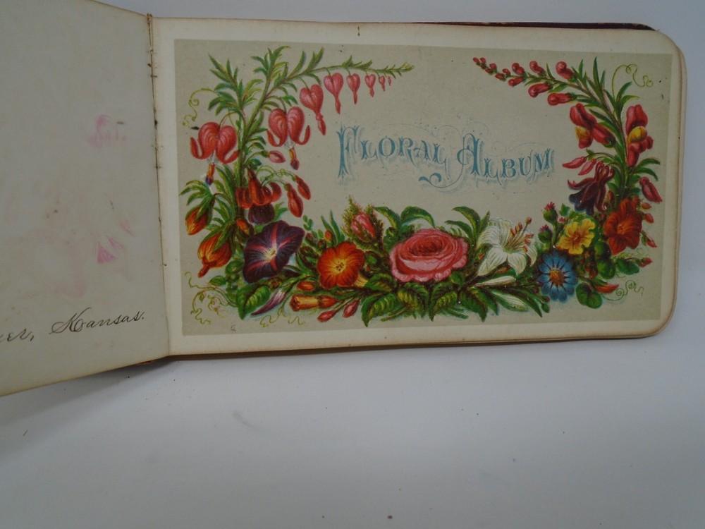 Welcome to Simply Vintage Up for sale is an 1886 Floral Album. It is from Kansas. Many of the pages have been signed, but some are blank. There are flowers on some pages. There are loose pages. The covers are scuffed. Please look at the pictures as they are part of the description. I do not accept returns, so please ask any questions prior to bidding. I do not ship outside the United States. I do combine shipping. Thank you and have a great day!