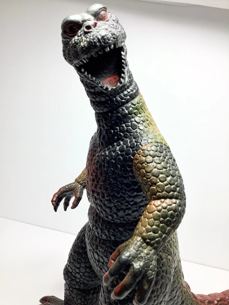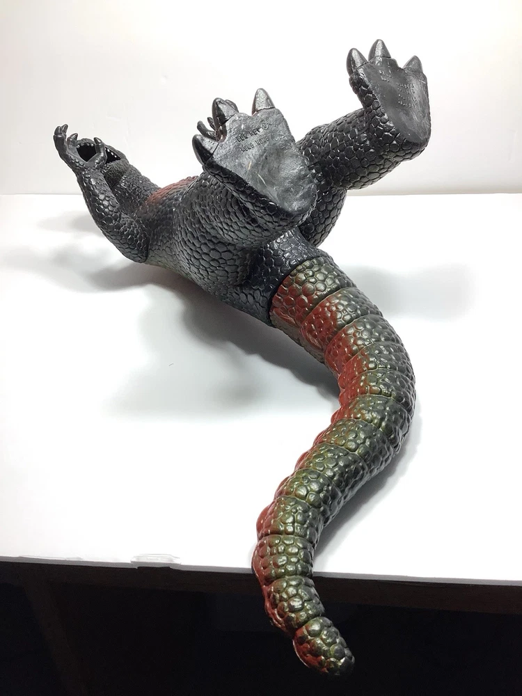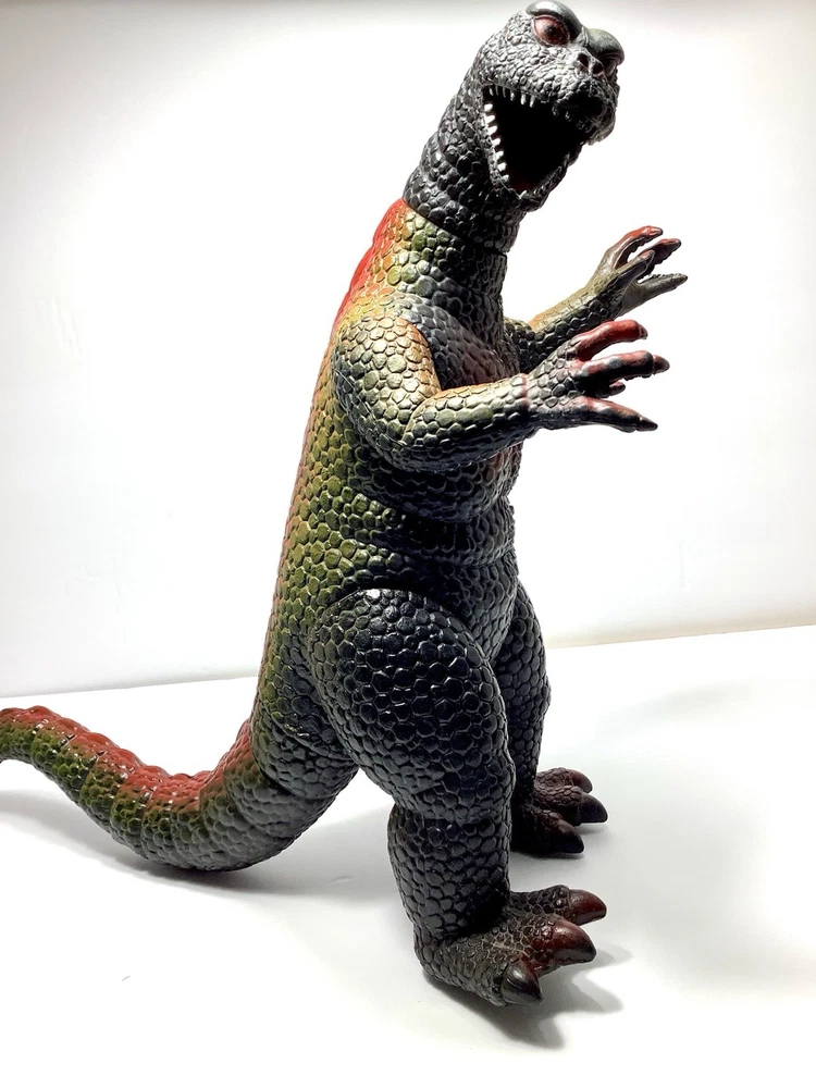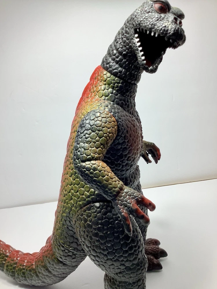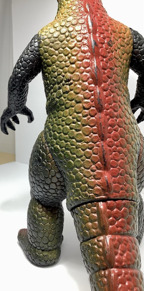 This is a vintage Dor Mei Godzilla action figure that stands at 14 inches tall. It features a gorgeous red design and was made in Hong Kong. He is approx. 14” in height. The figure is suitable for age 3+ , making it a perfect collectible for fans of Godzilla. It does not have a date on it. My mother had it before me, I have had it 20 years. There are WEAR marks on his back where the red/orange color has been removed due to usage. Head and tail is possible. Arms move up and down. From a pet and smoke free home. No returns or refunds. Thanks for looking and have a great day.