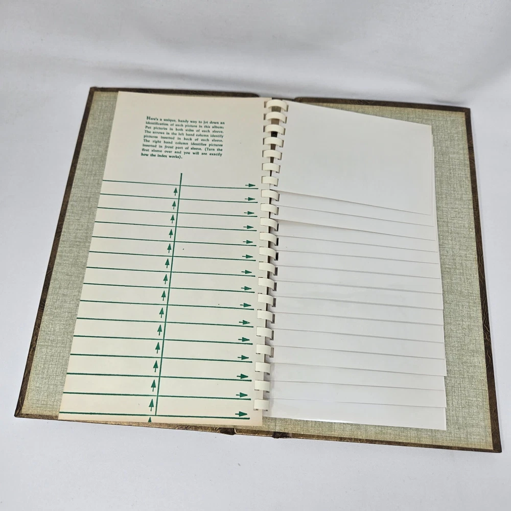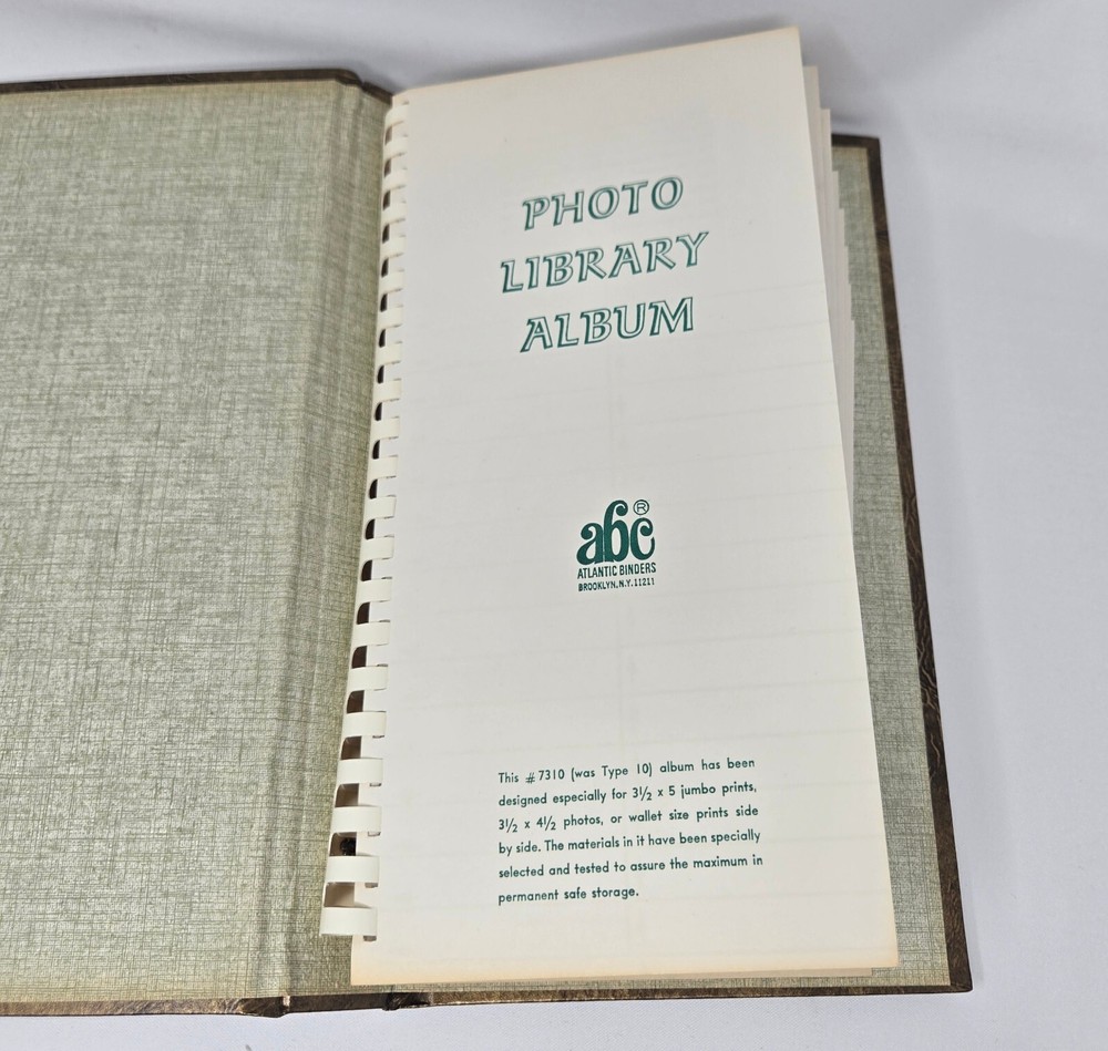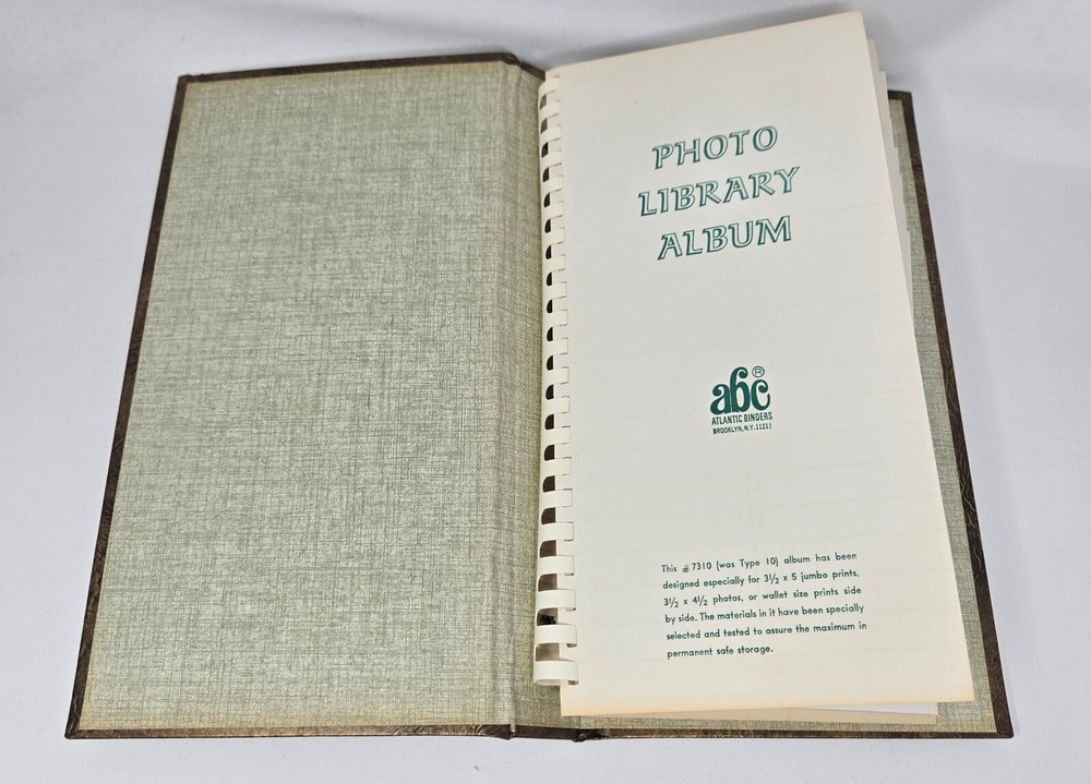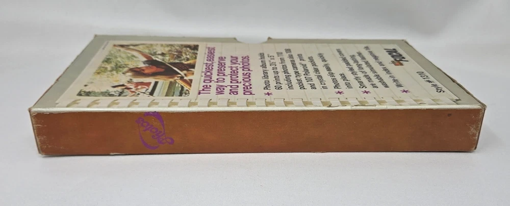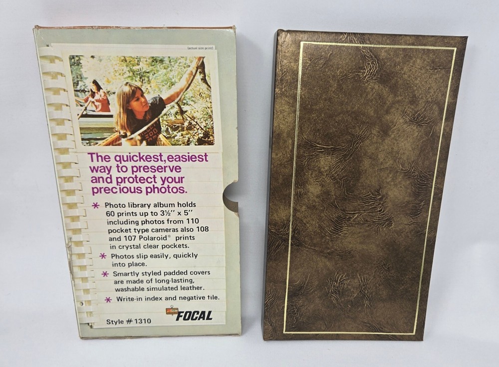 This is an unused photo album from the 1970s from Focal, MPN 1310. It is a spiral bound album with a brown, faux leather cover that holds up to 60 3.5" x 5" photos such as those from 110, 107, and 108 film cameras. They are cascading slip-in pockets. It comes in original box. This album is new, old stock. It has never been used but is from the 1970s so is not in mint condition. It is in original box and has been safely stored in cabinet all these years. It has no damage or defects, just some yellowing from natural aging.
